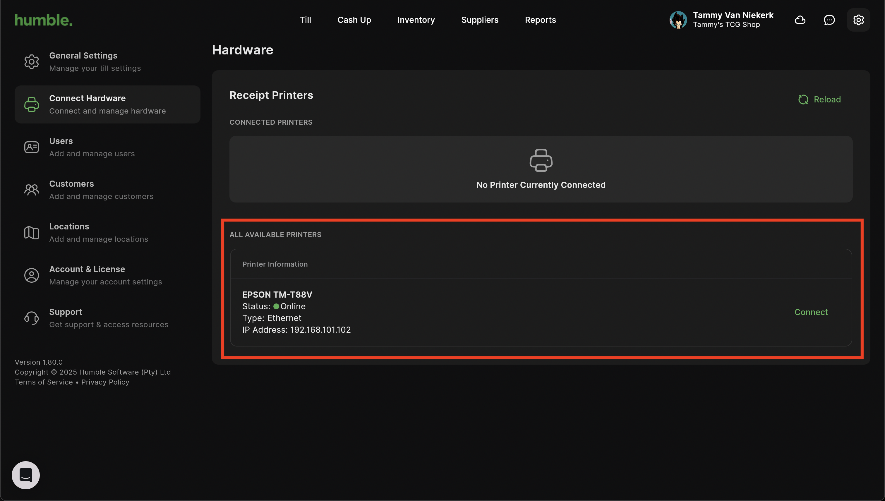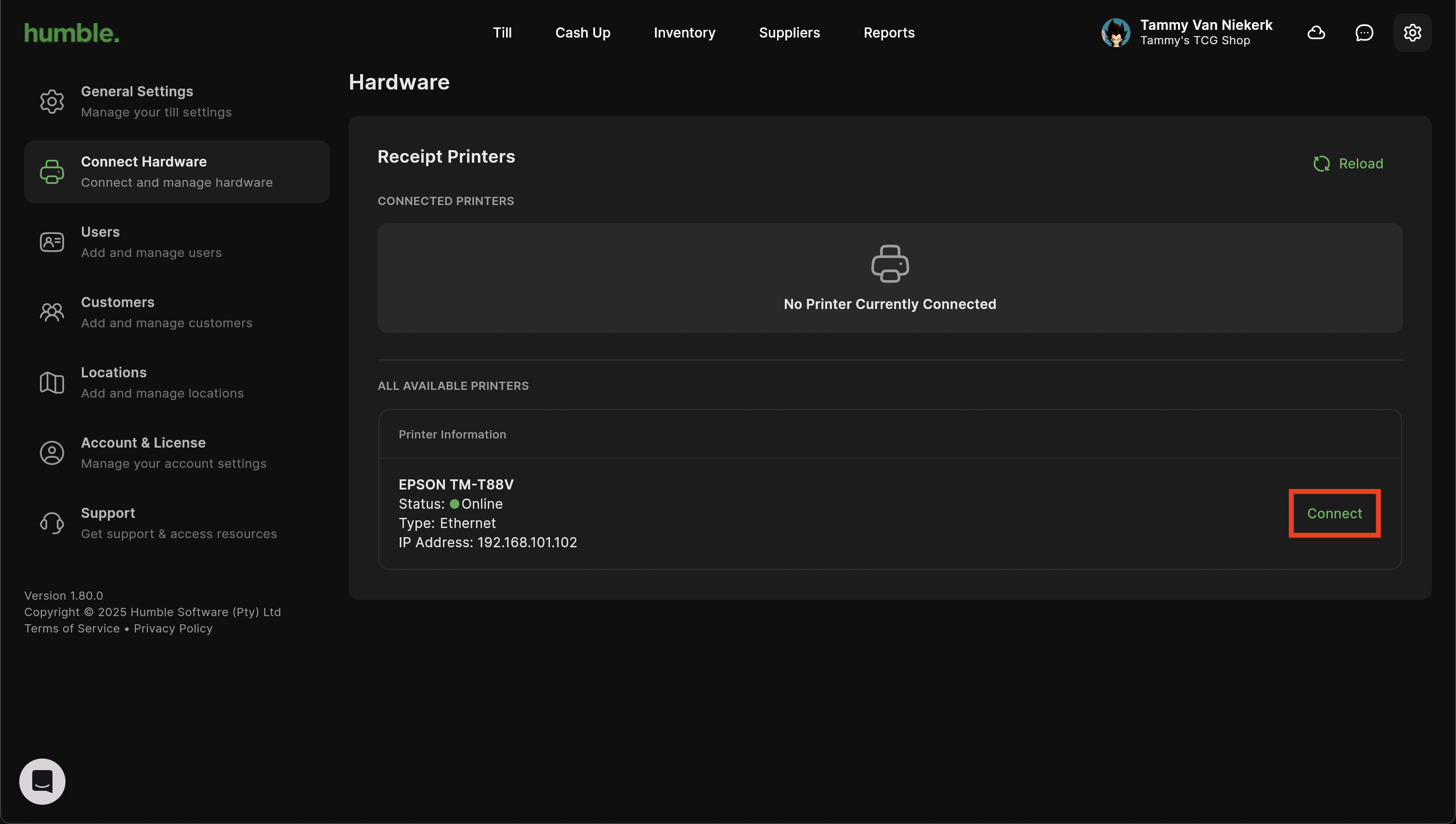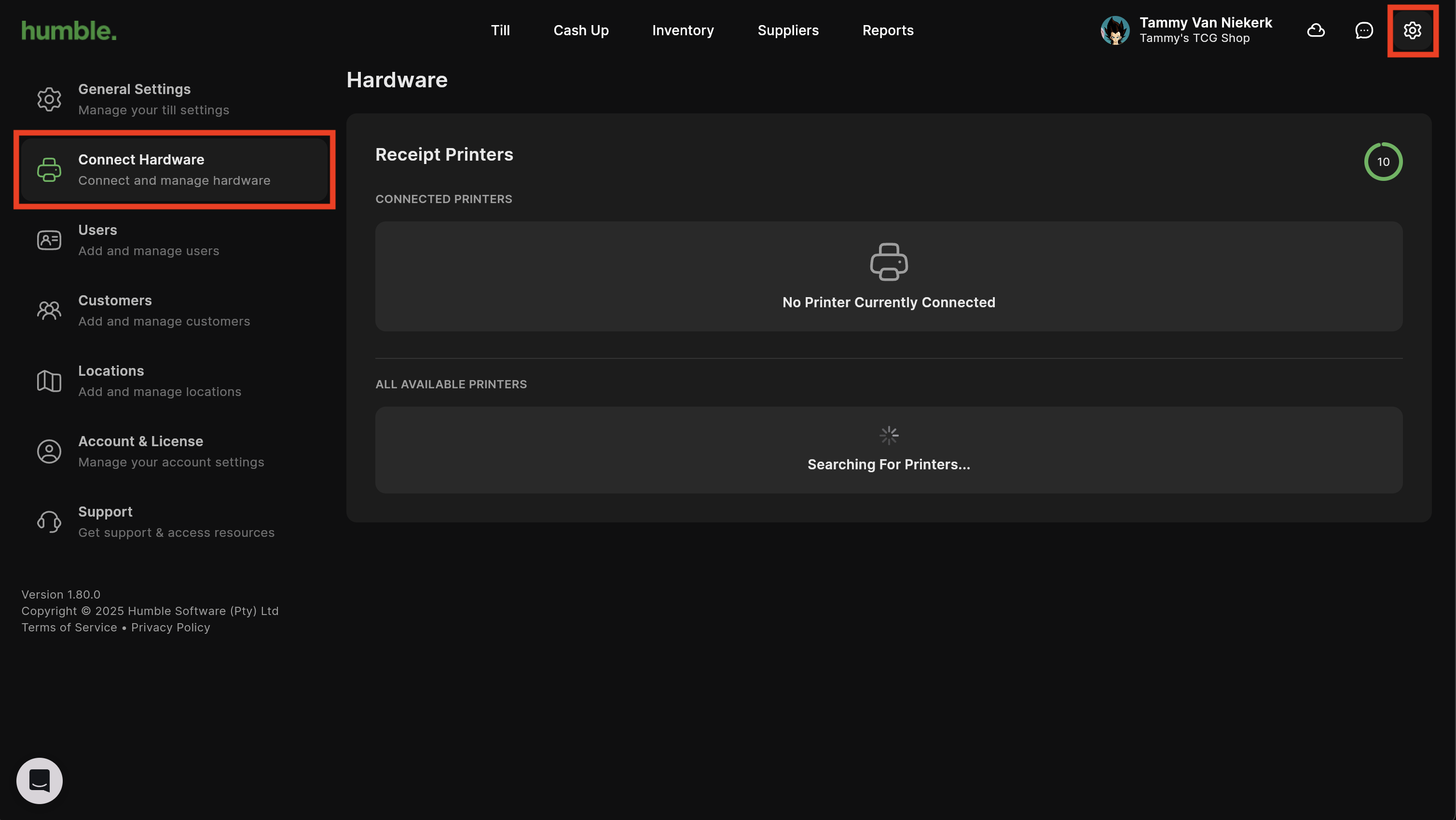 To set up your receipt printer in 2.0, go to Settings (the cog on the top right next to your name). You will be taken to the General Page. Click on Connect Hardware.