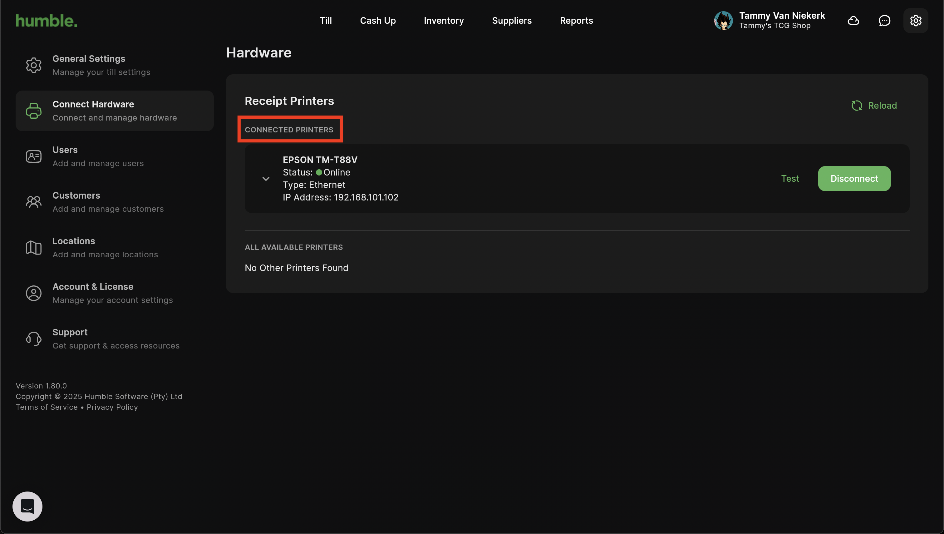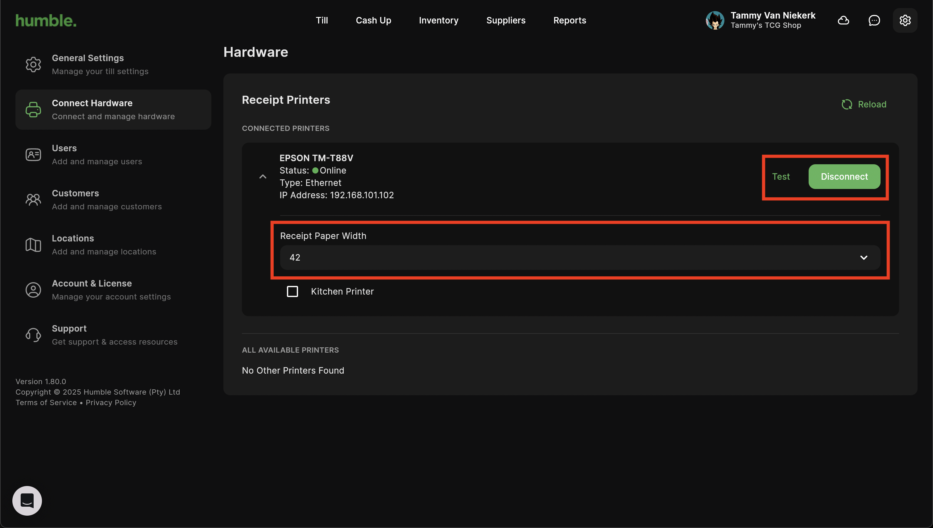 You will be able to select the width of the paper, as well as print a Test page to confirm which is the correct width. If you have selected the incorrect printer, click Disconnect and then select the correct printer that you wish to print your receipts to.