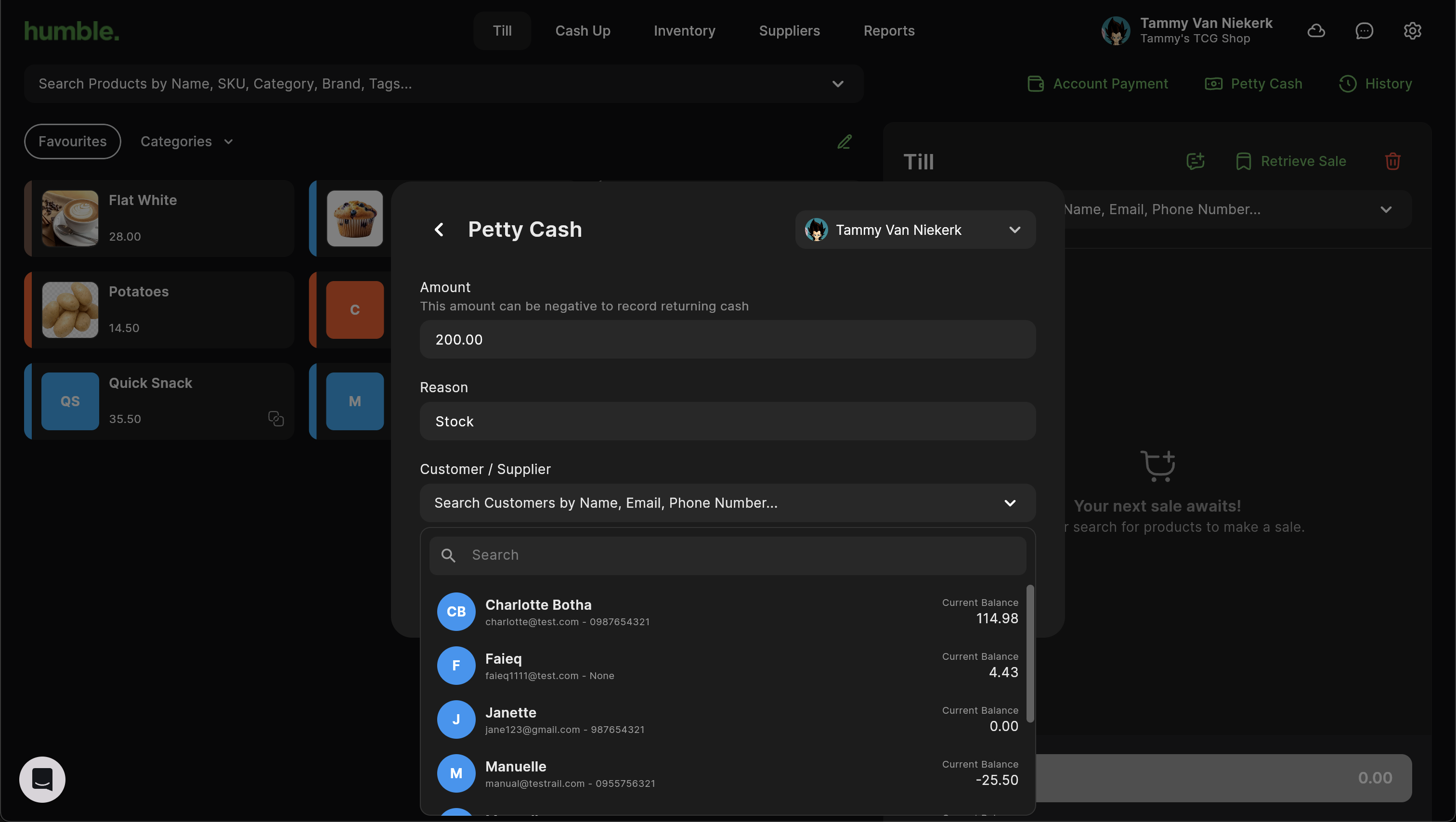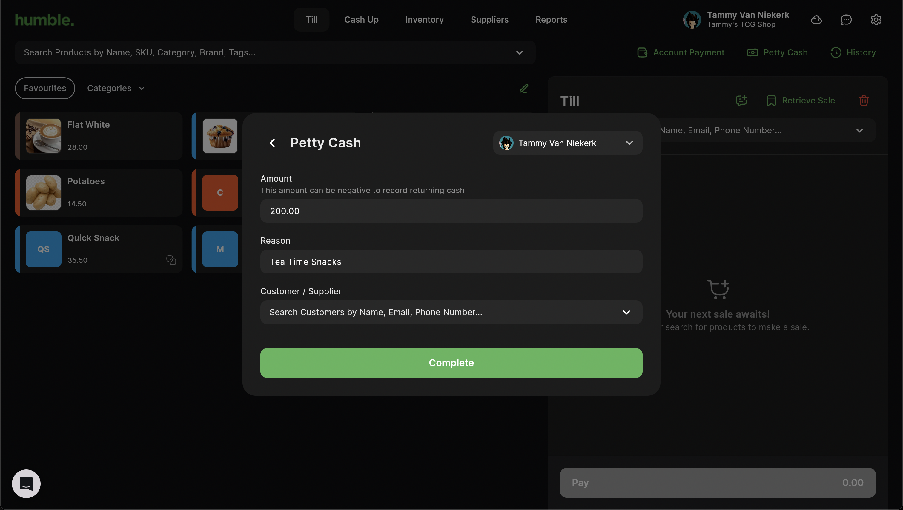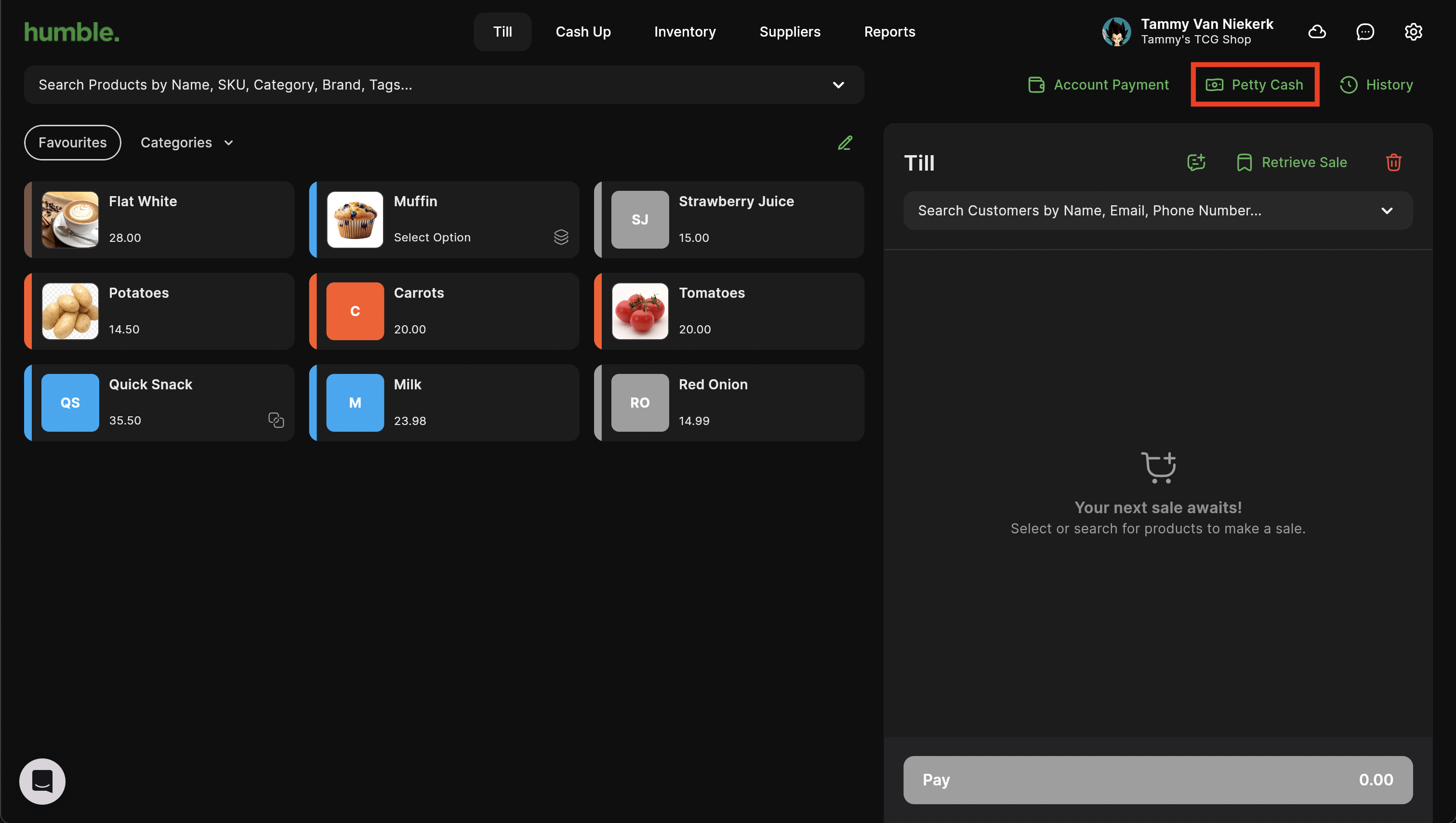 Processing a Pay Out is quick and easy. On the Till screen, click on Petty Cash.