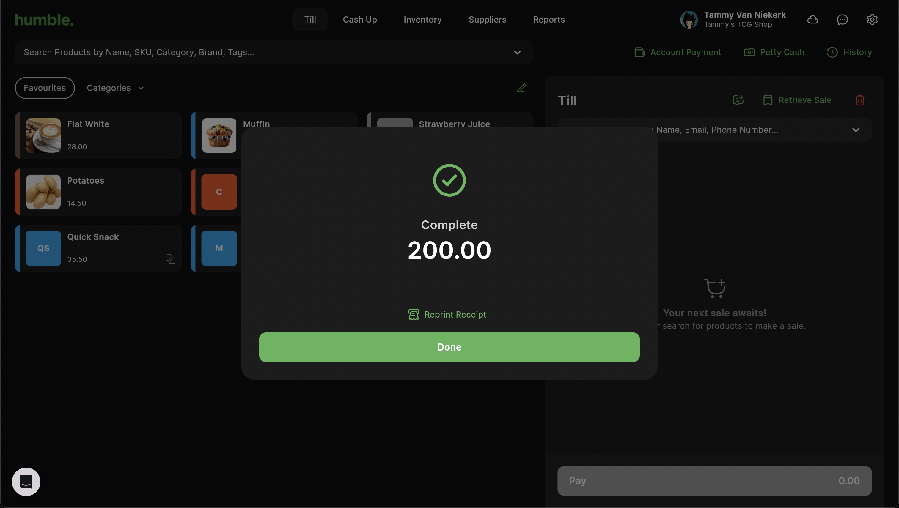 Once you have added your customer or supplier, click Complete. The cash drawer will open and you will be able to remove the cash. A slip will print from your receipt printer where the receiver needs to sign for the cash. Your cash up will automatically be adjusted to account for the money that was taken out of the till. The Complete modal will appear for confirmation. Click Done.