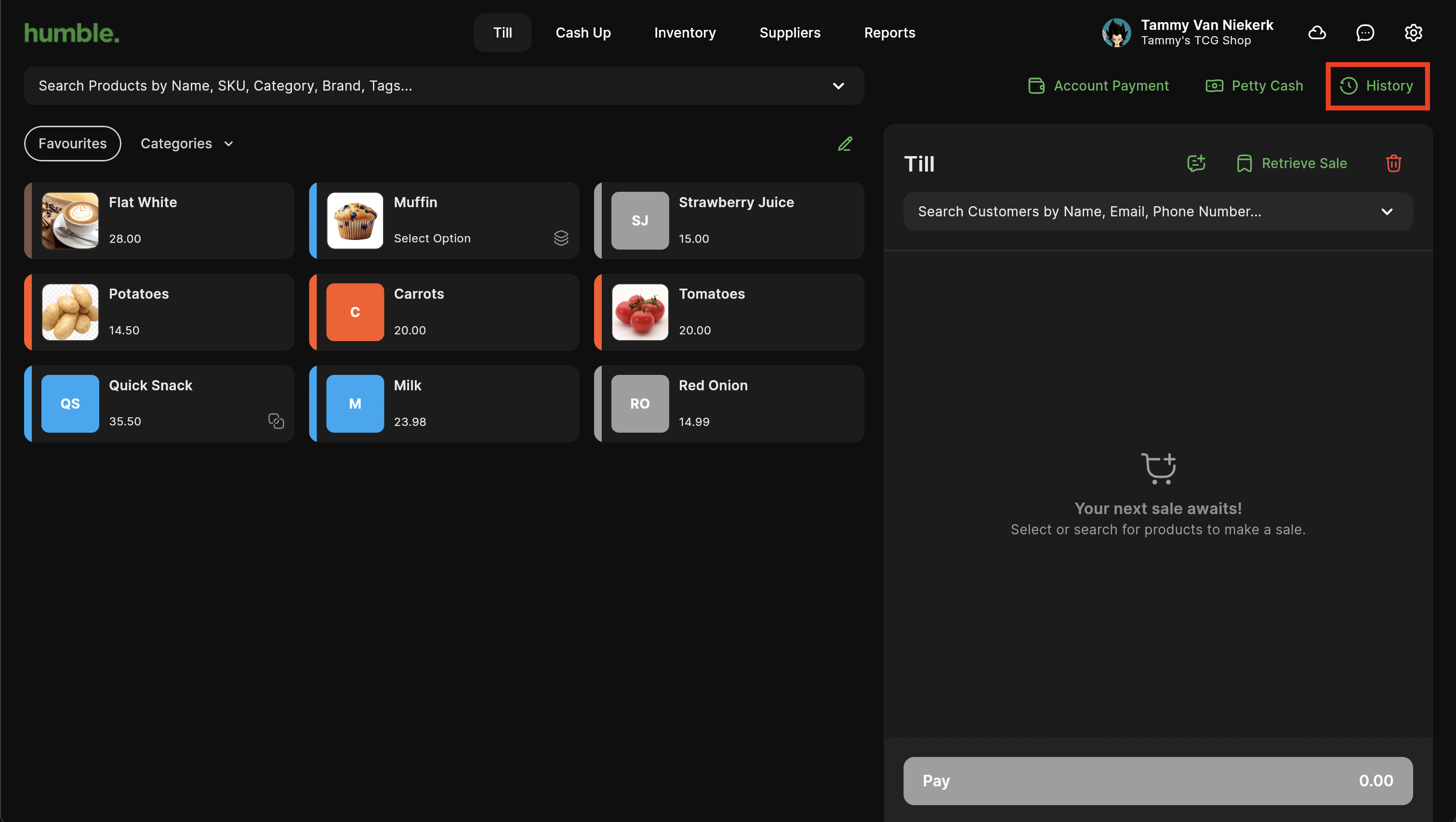 If you have completed a sale or other transaction and somehow need to find it to reprint it or email it, there is a search functionality. On the Till screen click on History.
