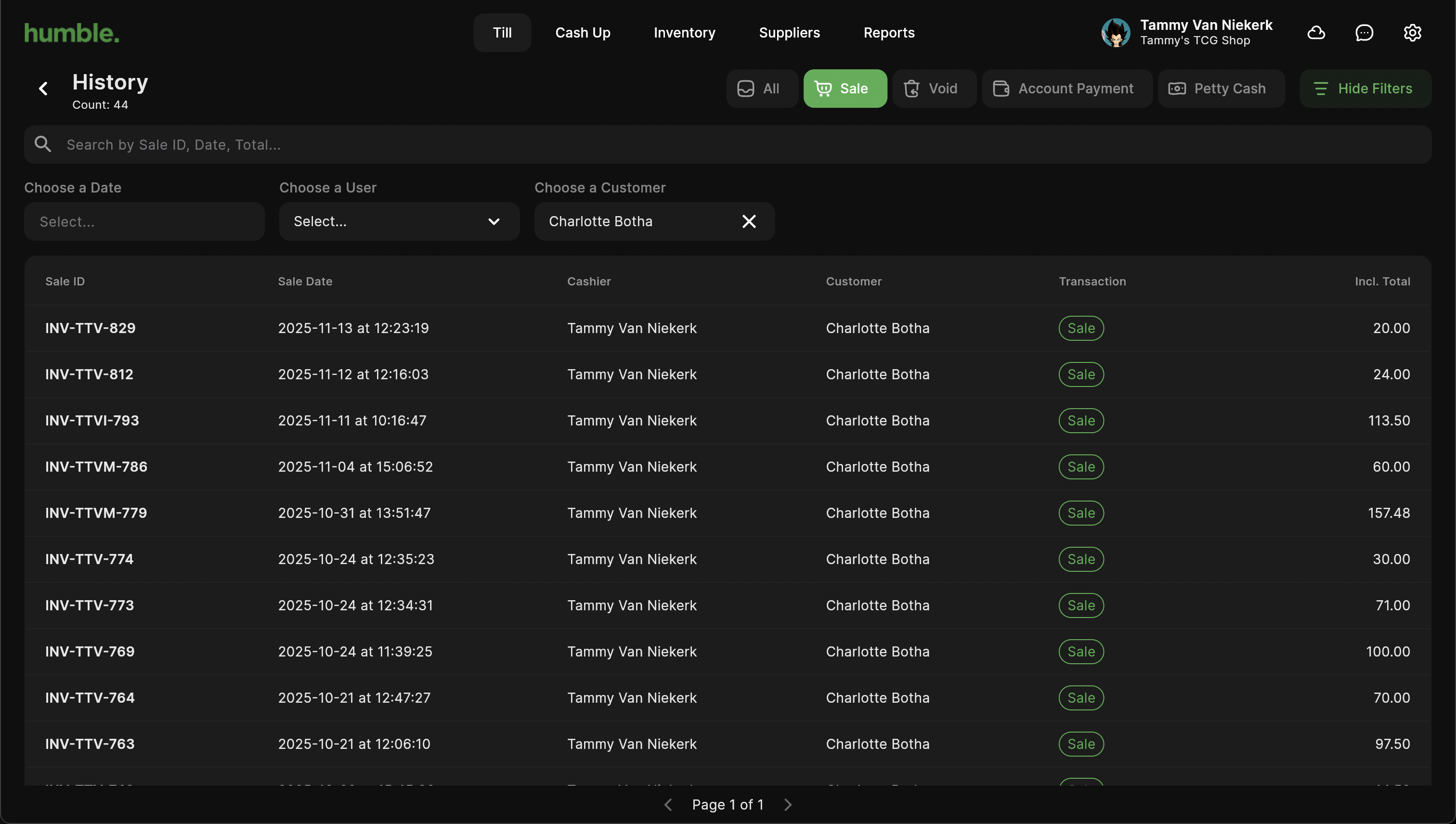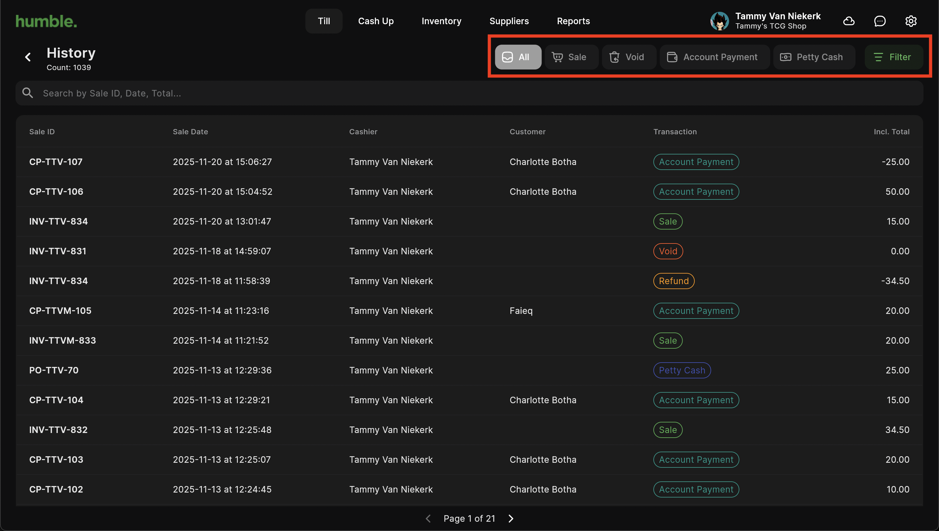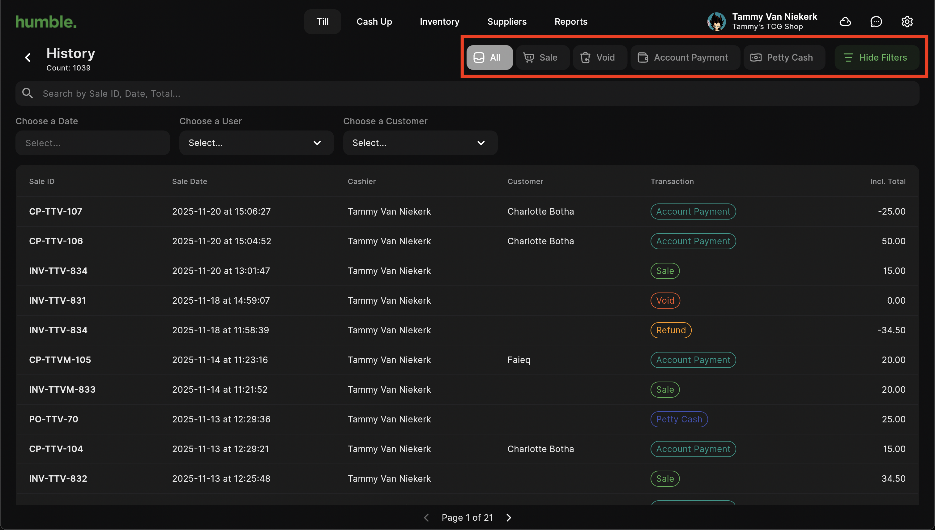 Filter will change to Hide Filters, and you will see more filter options underneath the original filters. You can now filter by a specific Date or date range, the User, Store and Customer.