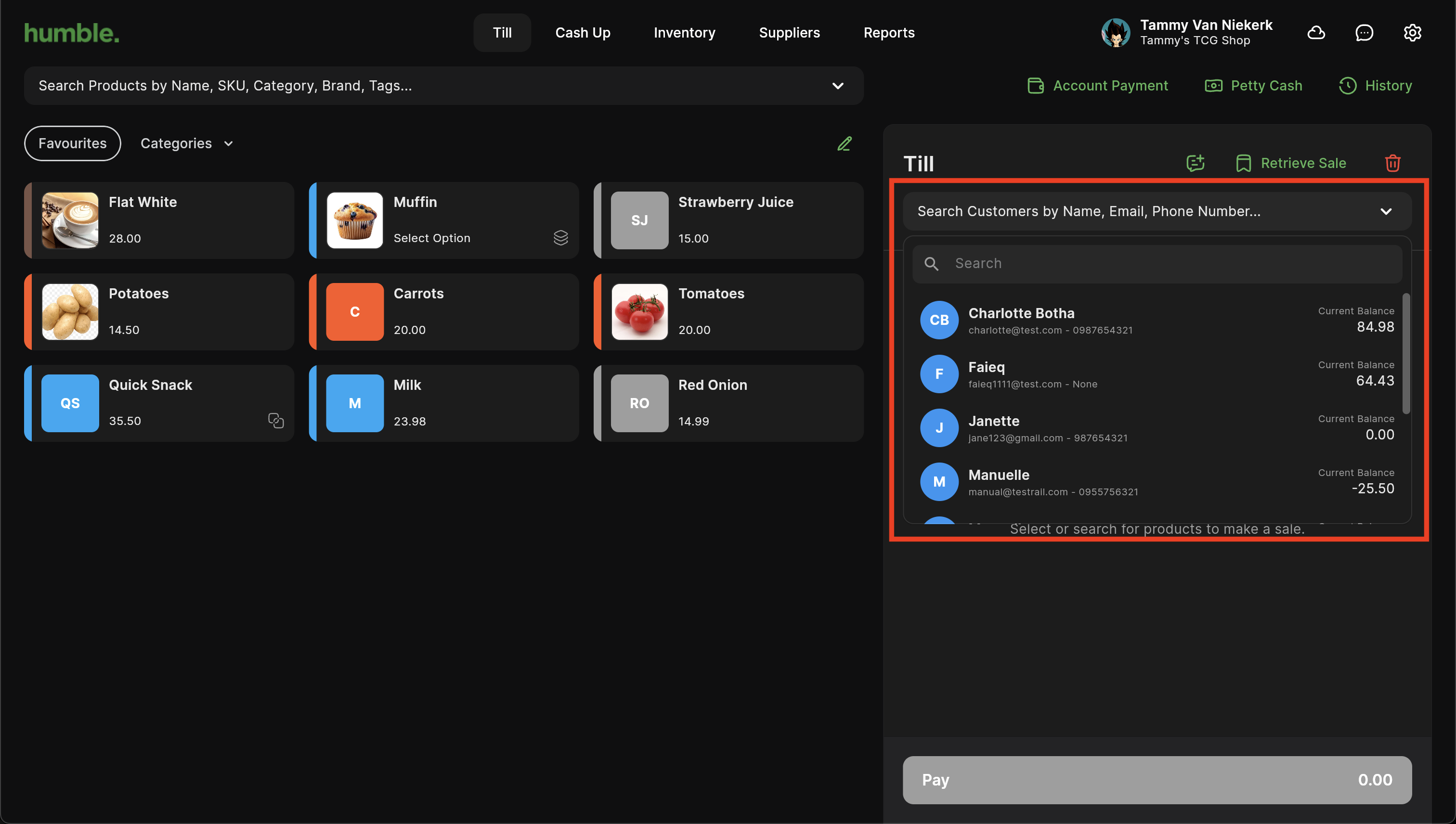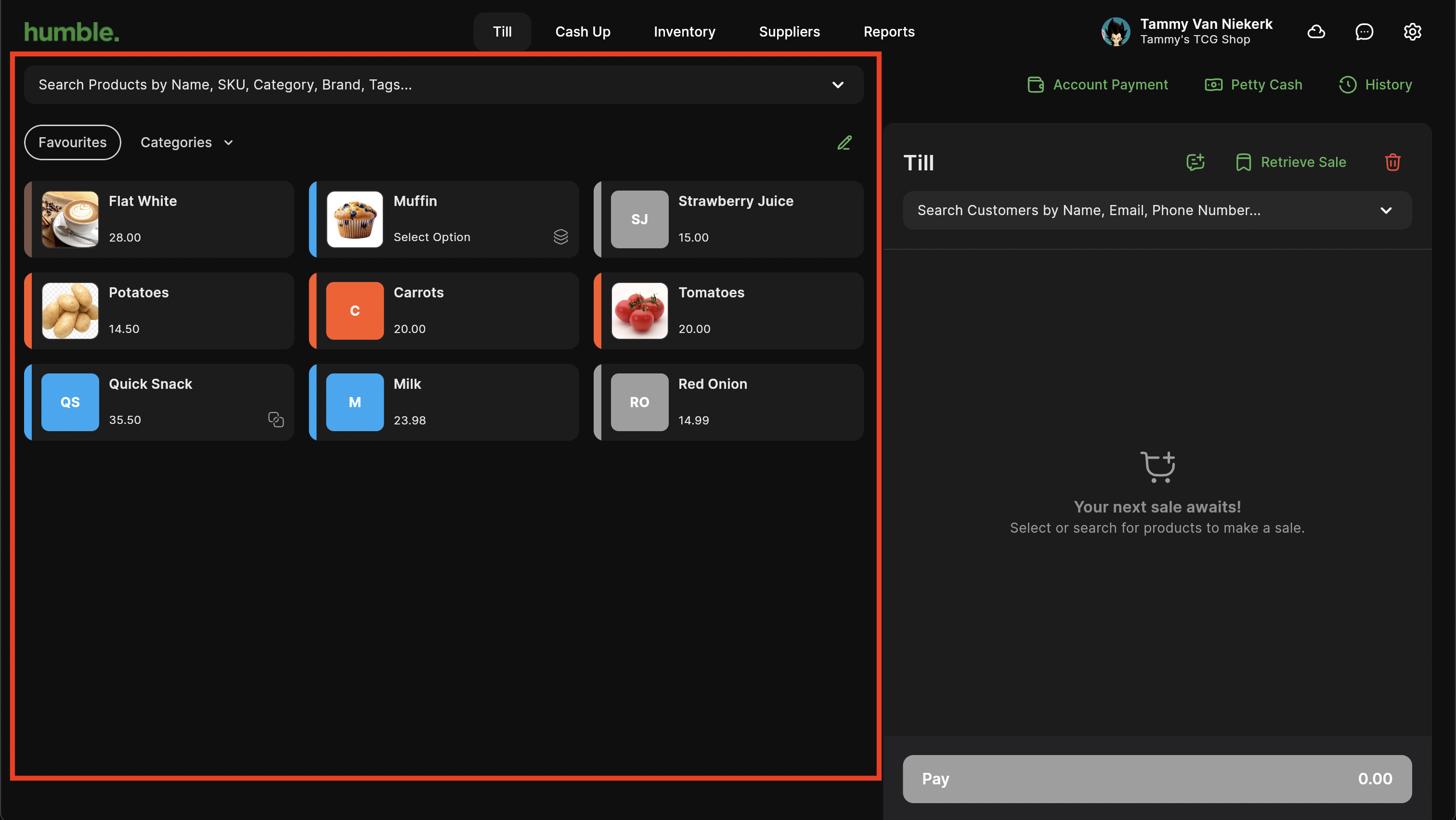 You can add the products by clicking on the search bar at the top and searching for the product by scrolling or typing the name of the product, clicking on a Favourite tile or by scanning the barcode of the product with a barcode scanner.
