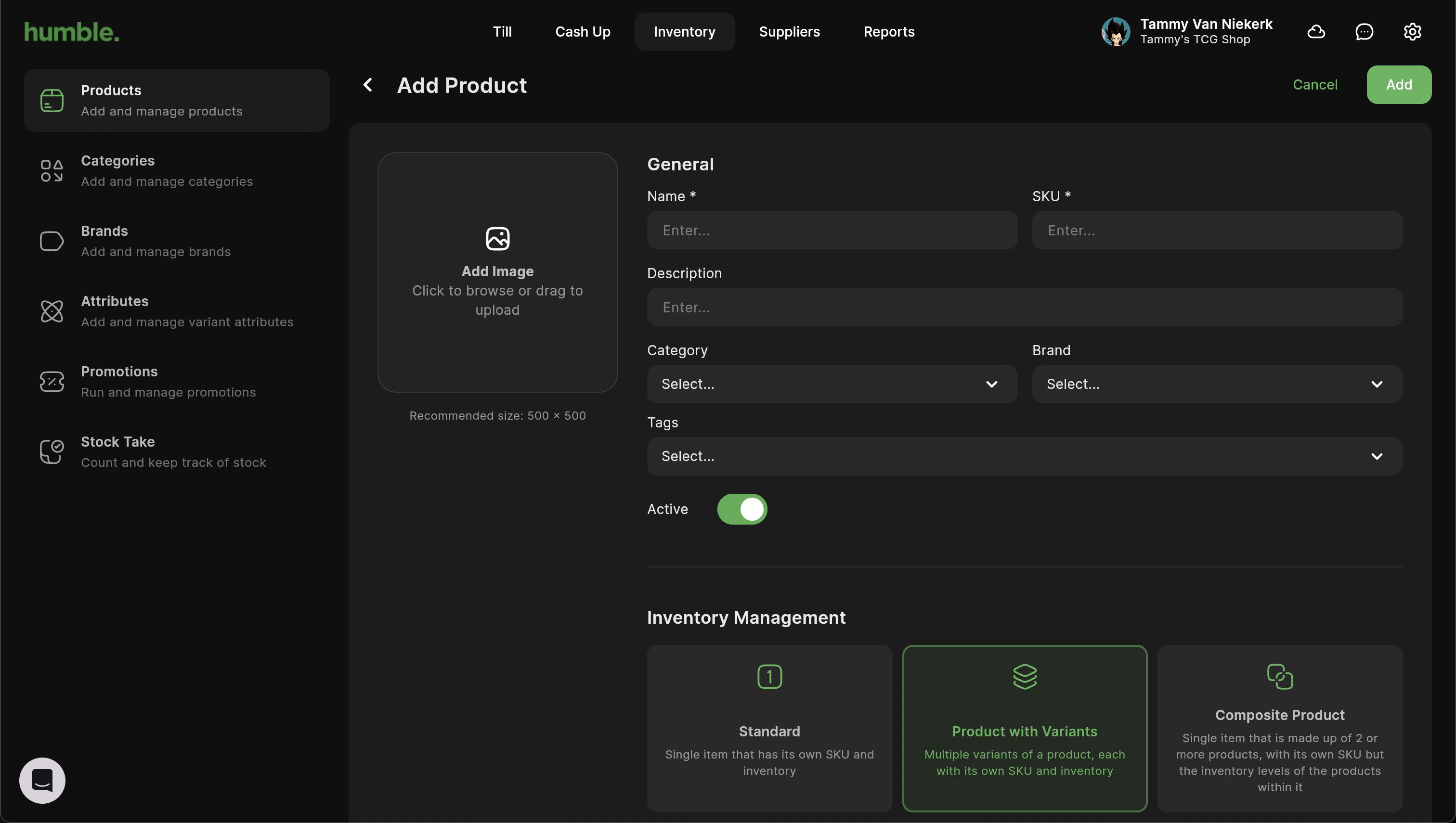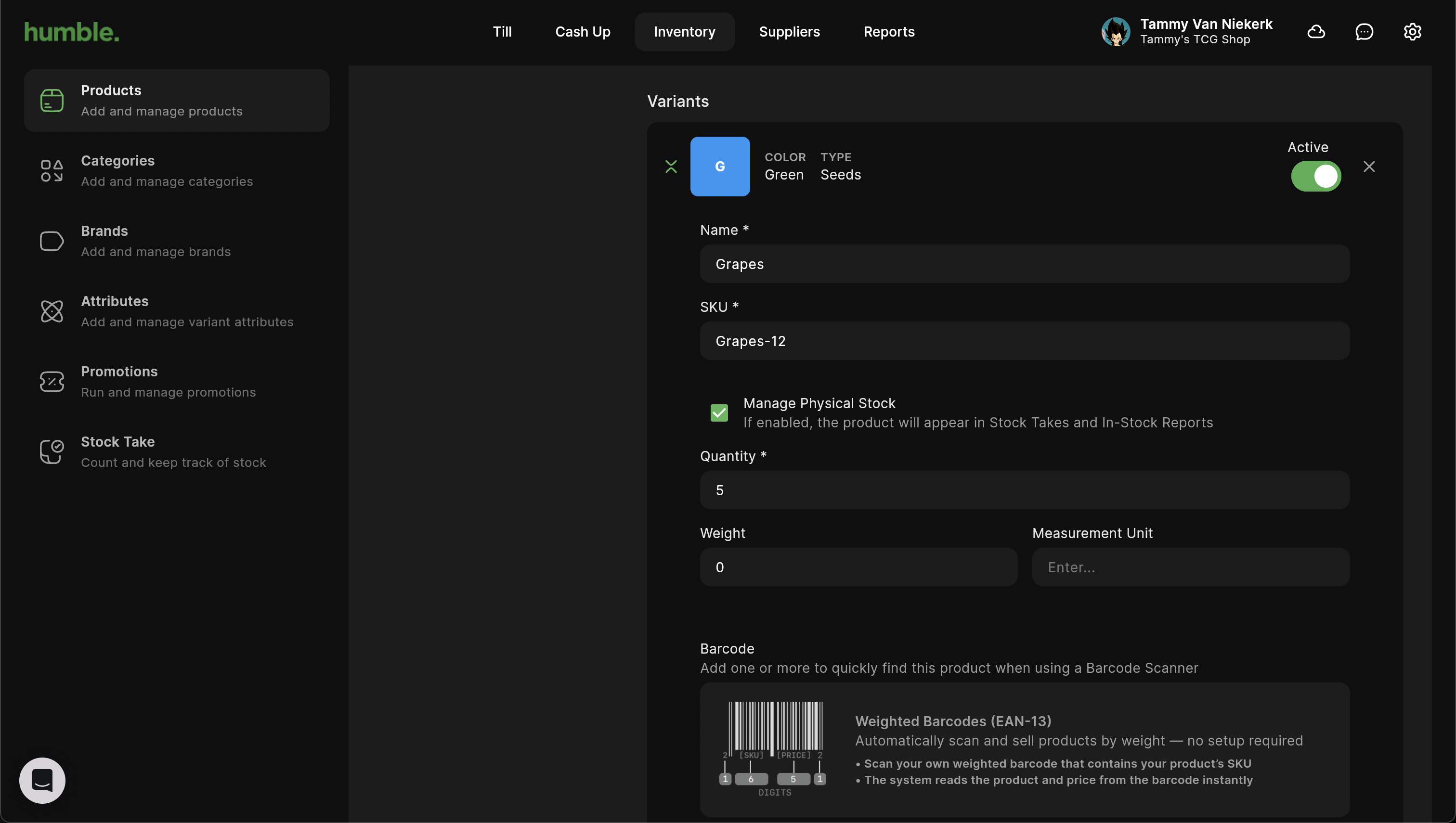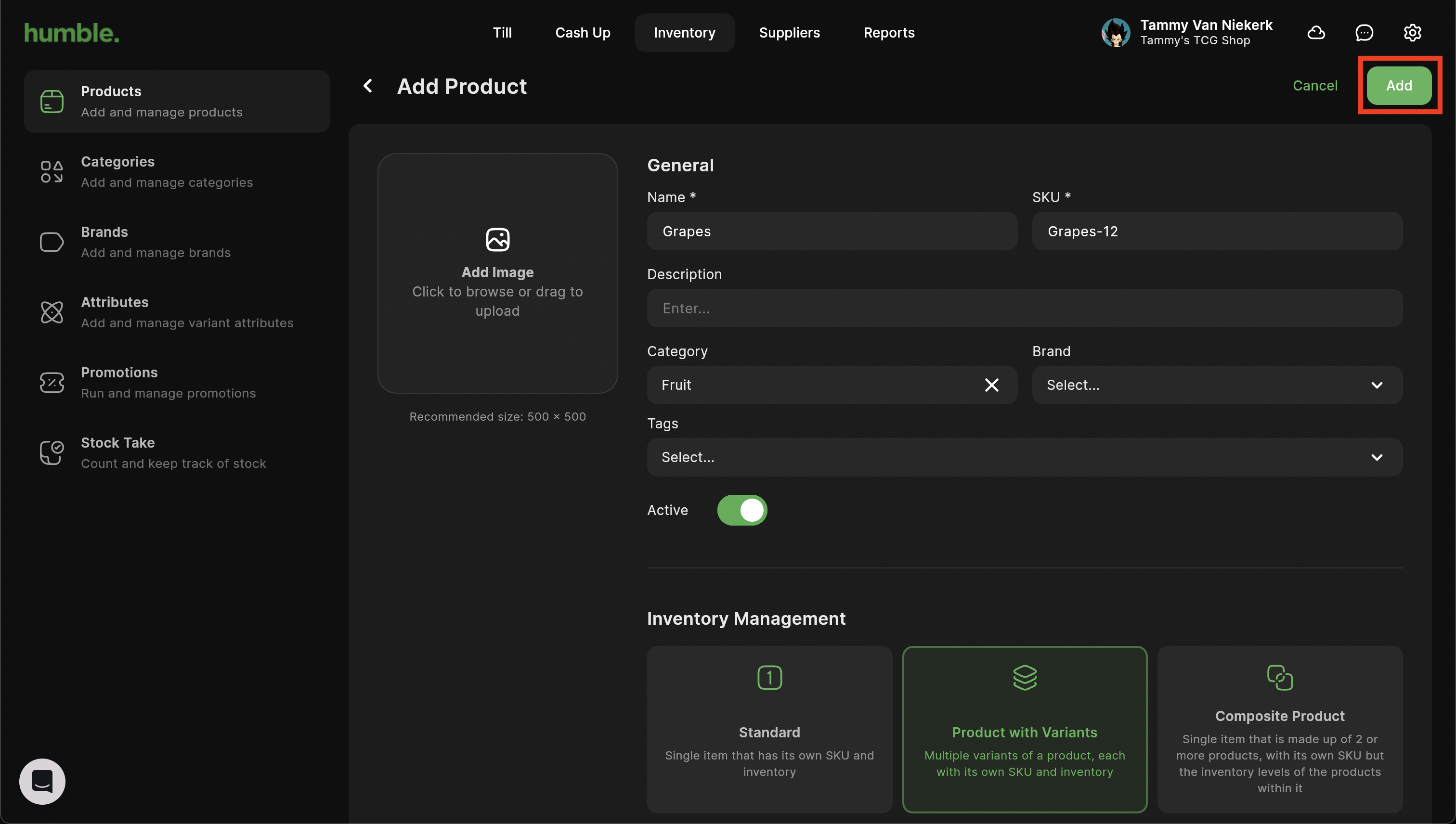Active - Keep toggled on to ensure the product is shown in the till and can be used for sales and stock management