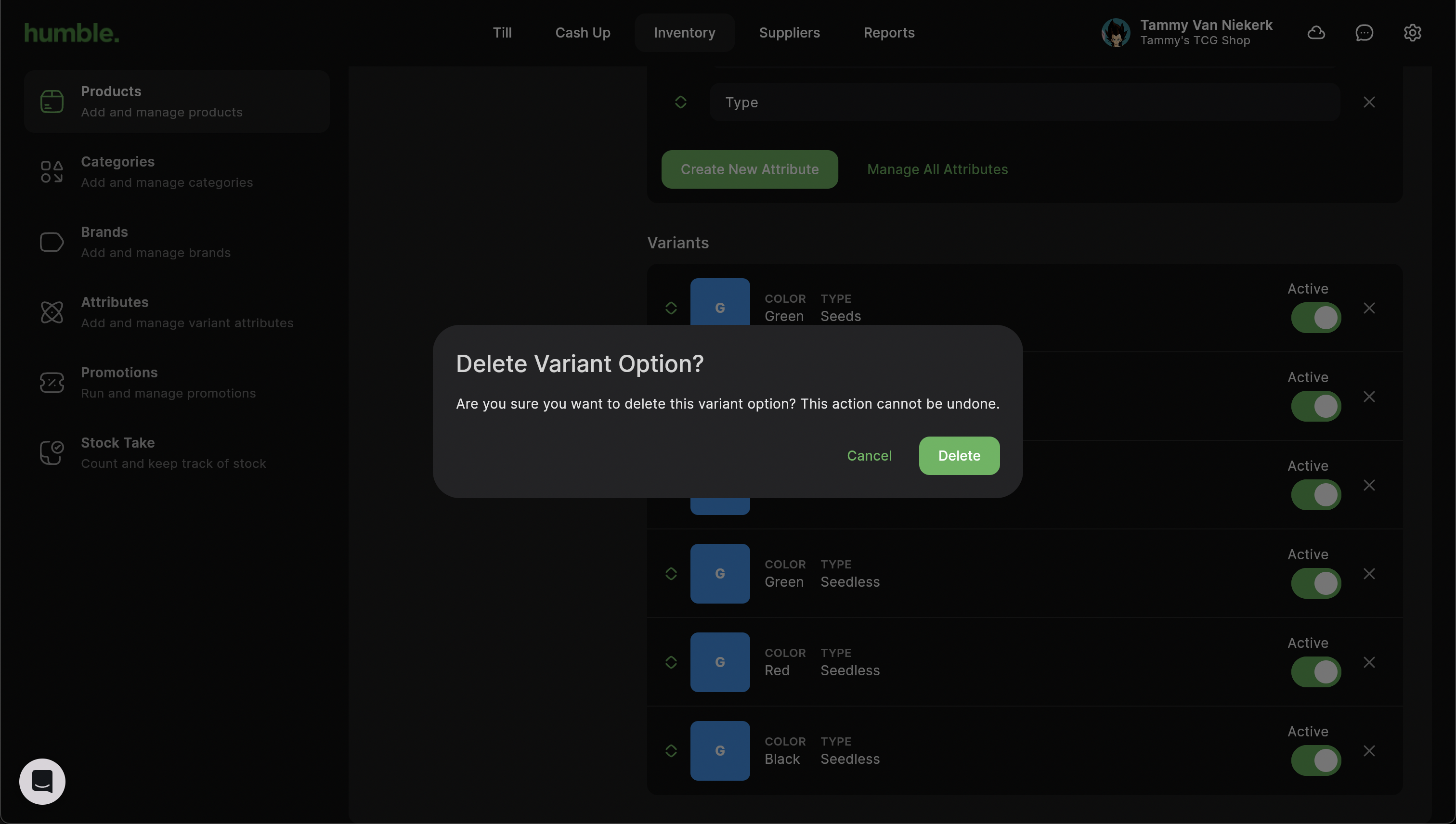 This opens a modal with your existing attributes. You can update the name or delete the attribute by clicking on the X on the right hand side and then click Save to save your changes. Cancel will discard any changes made.