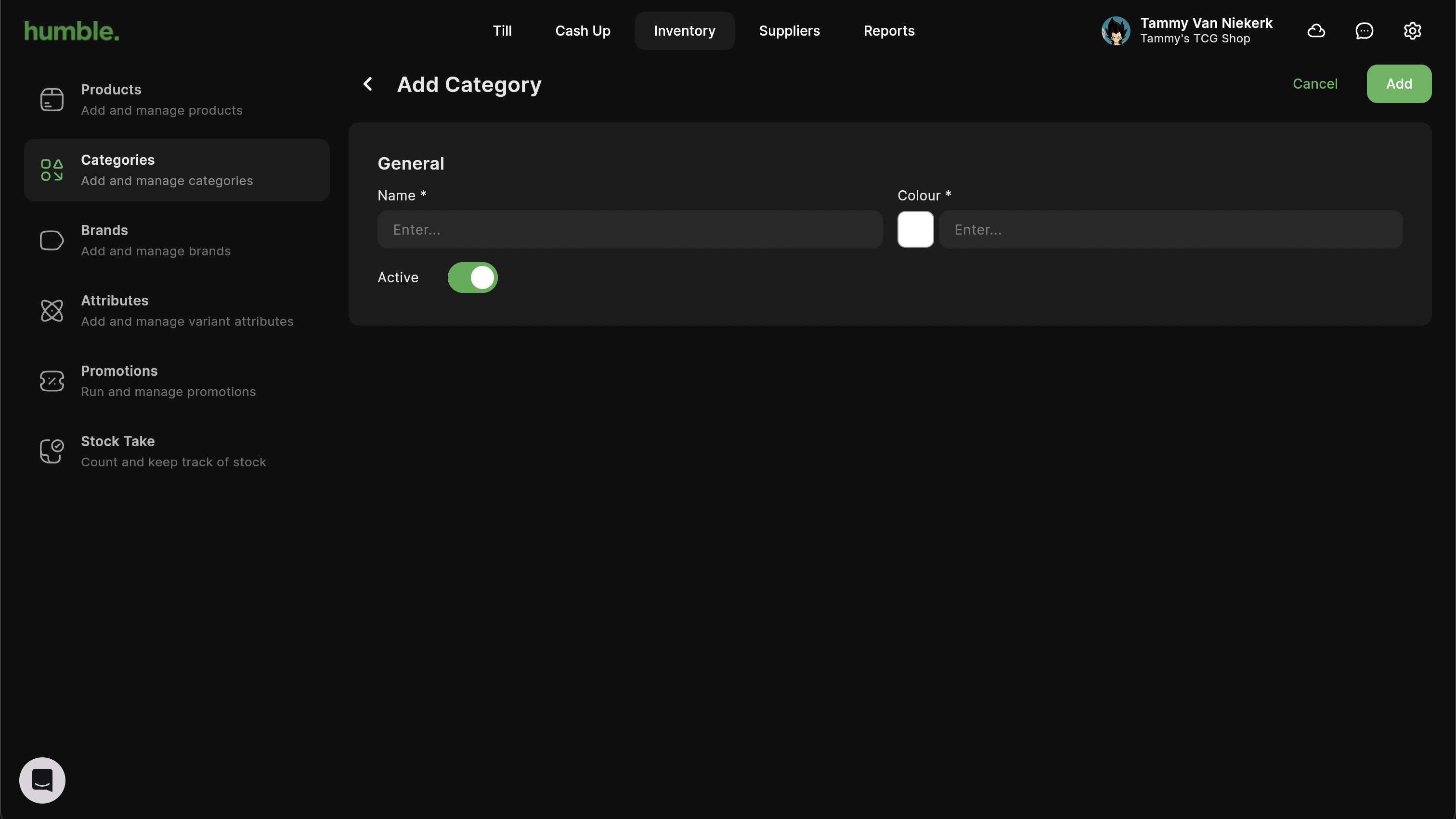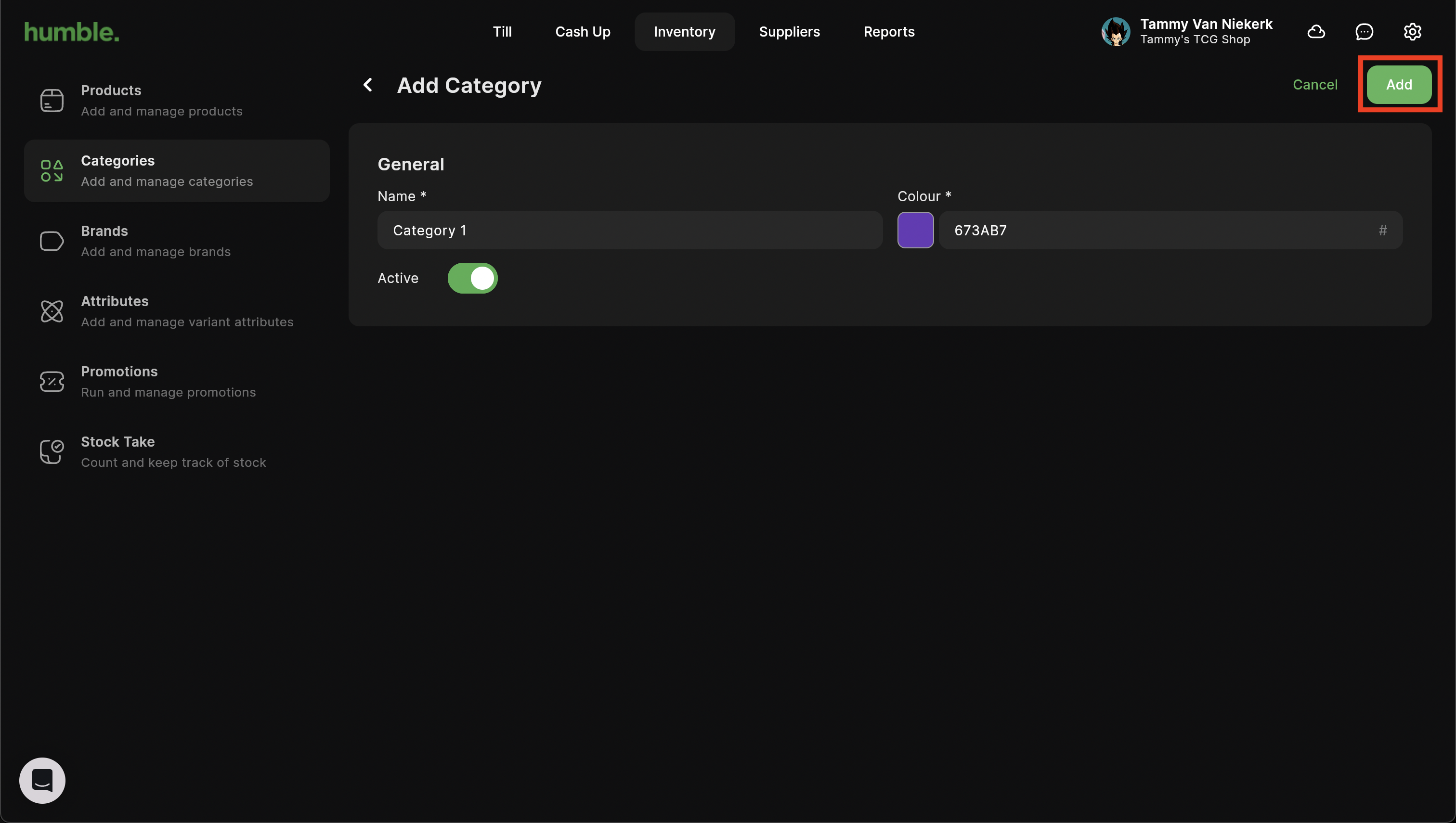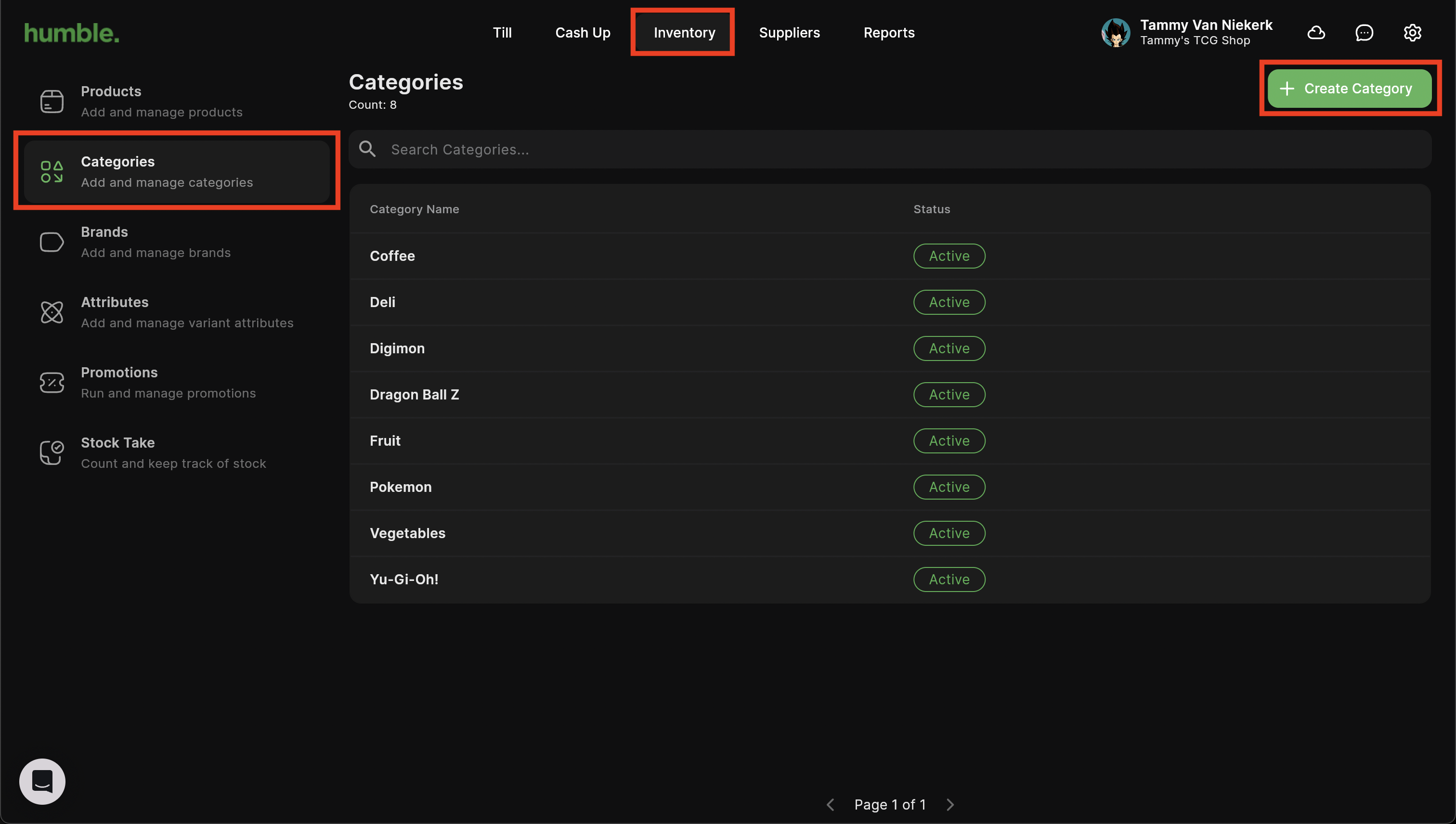 To add a new category, click on Inventory in the top navigation bar. Then click on Categories. To add a new category, click on Create Category.