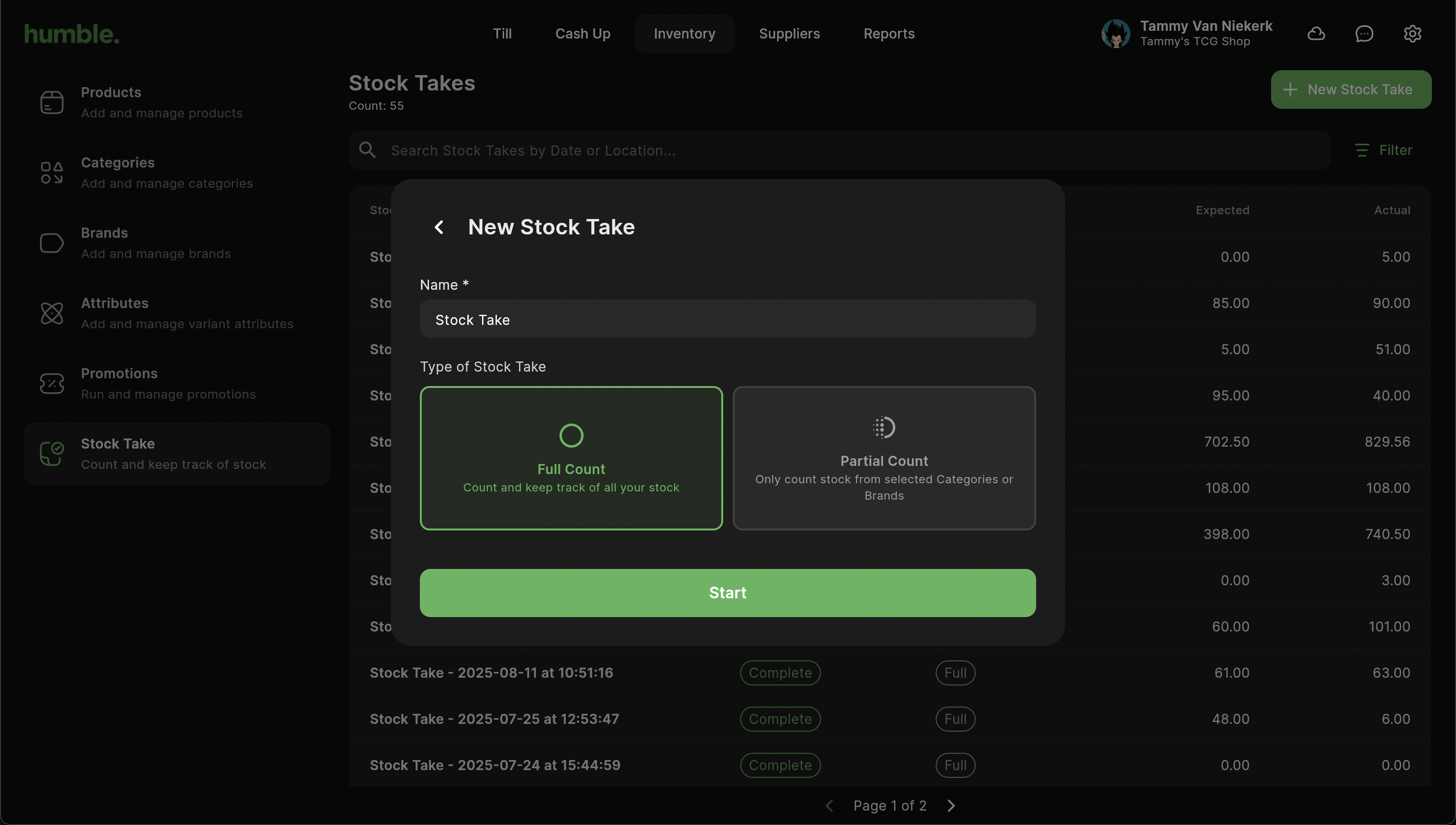 The New Stock Take Modal will appear. Here you can add the name of your stock take, and then select Full Count. Next click Start.