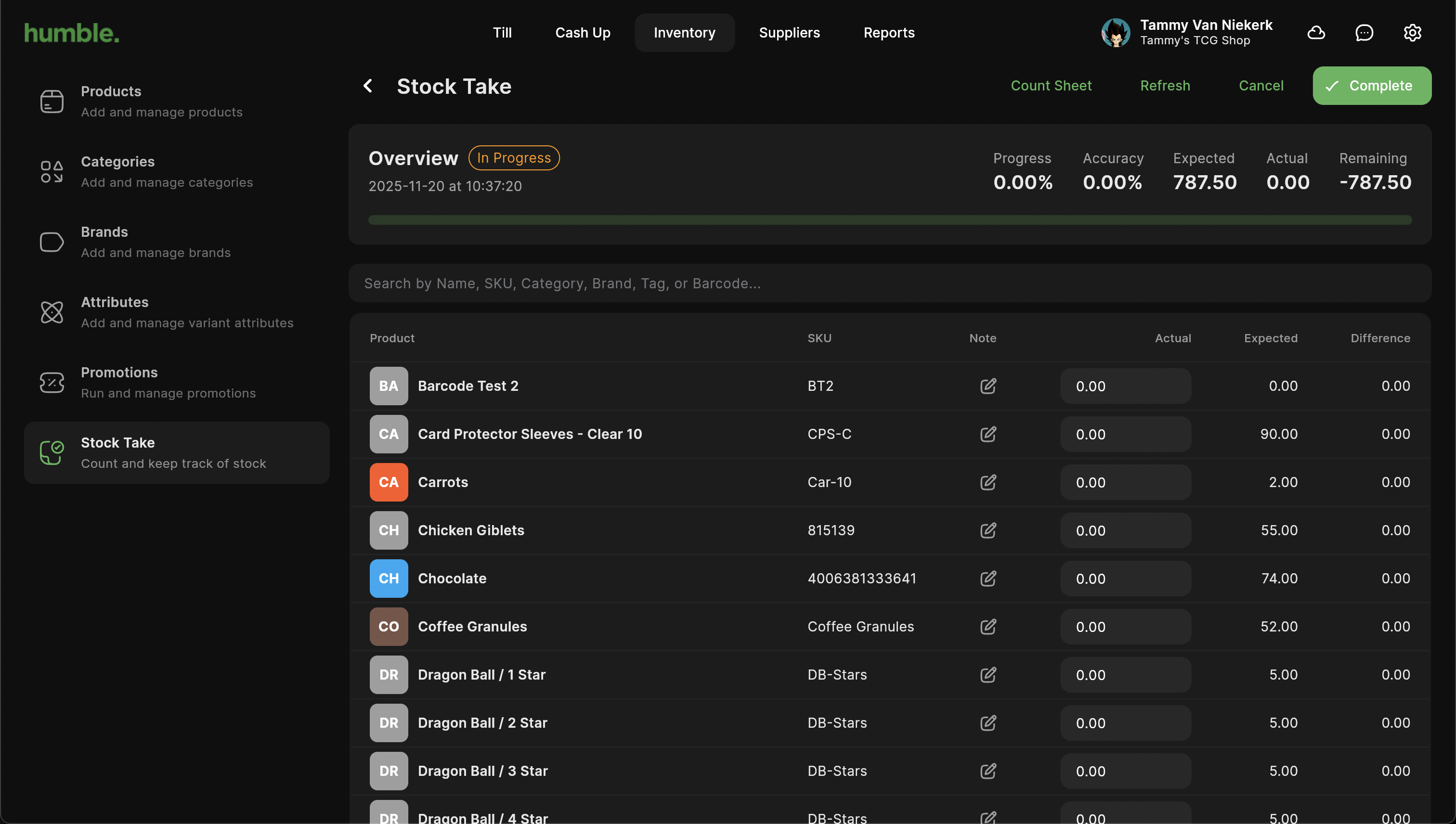 When you are ready, you can enter in the amount you have counted for each product in the Actual column and press enter. This will update the Progress, Accuracy, Expected, Actual and Remaining counts.
