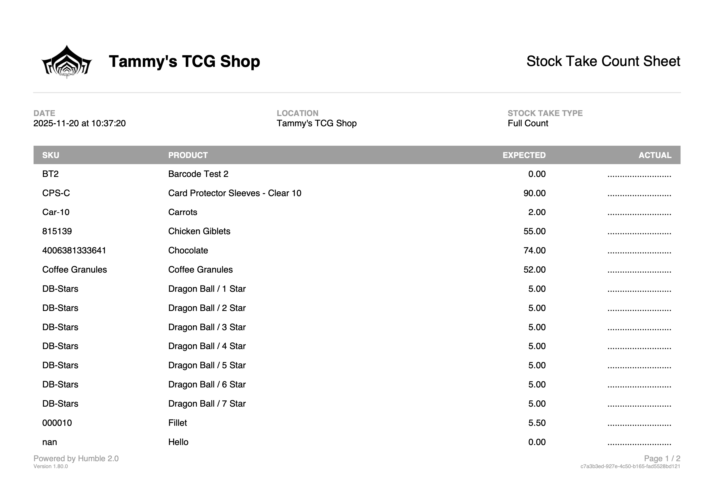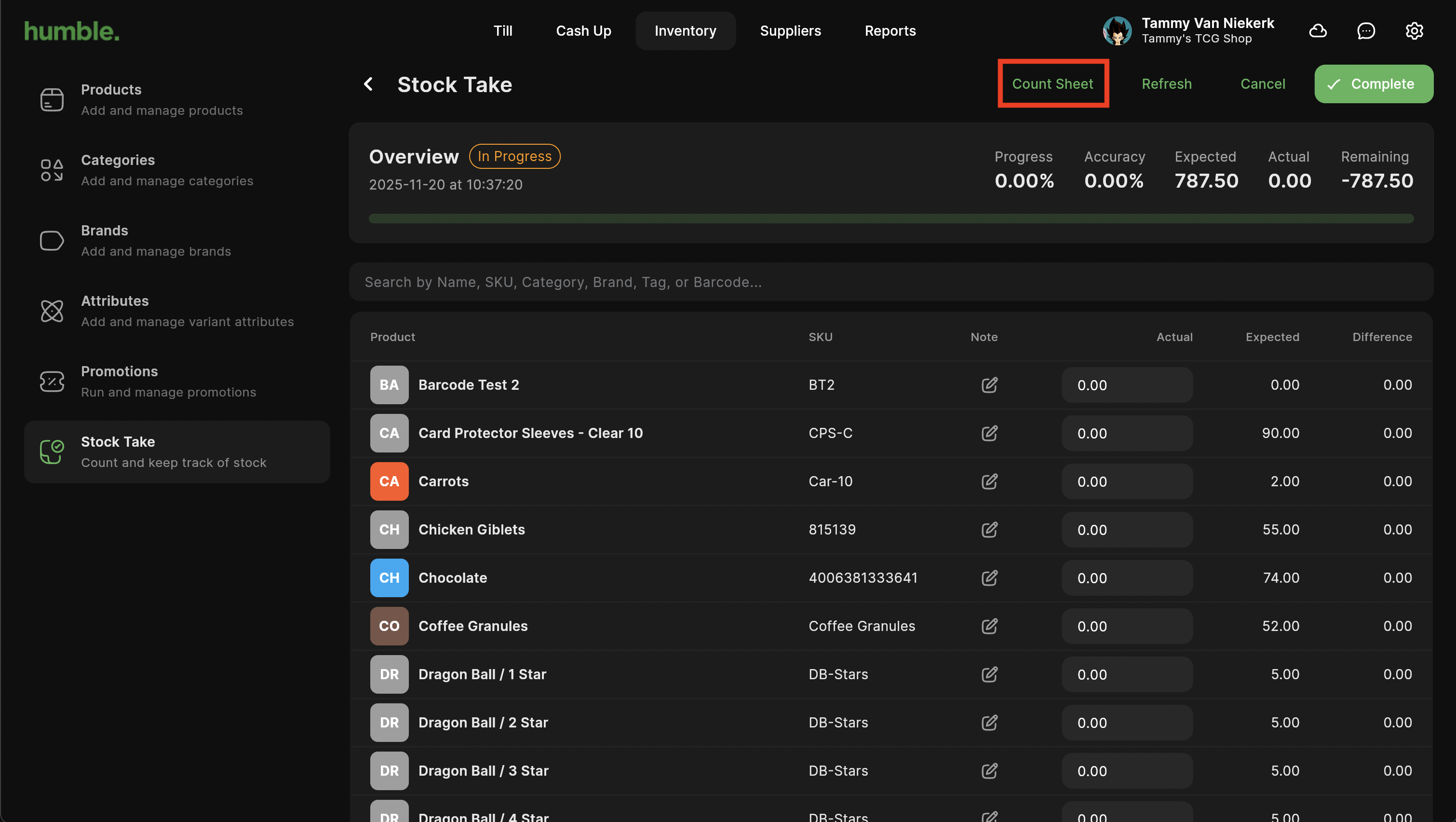 Count Sheet - Allows you to print a PDF and write down your in stock amounts before entering then in on the Stock Take