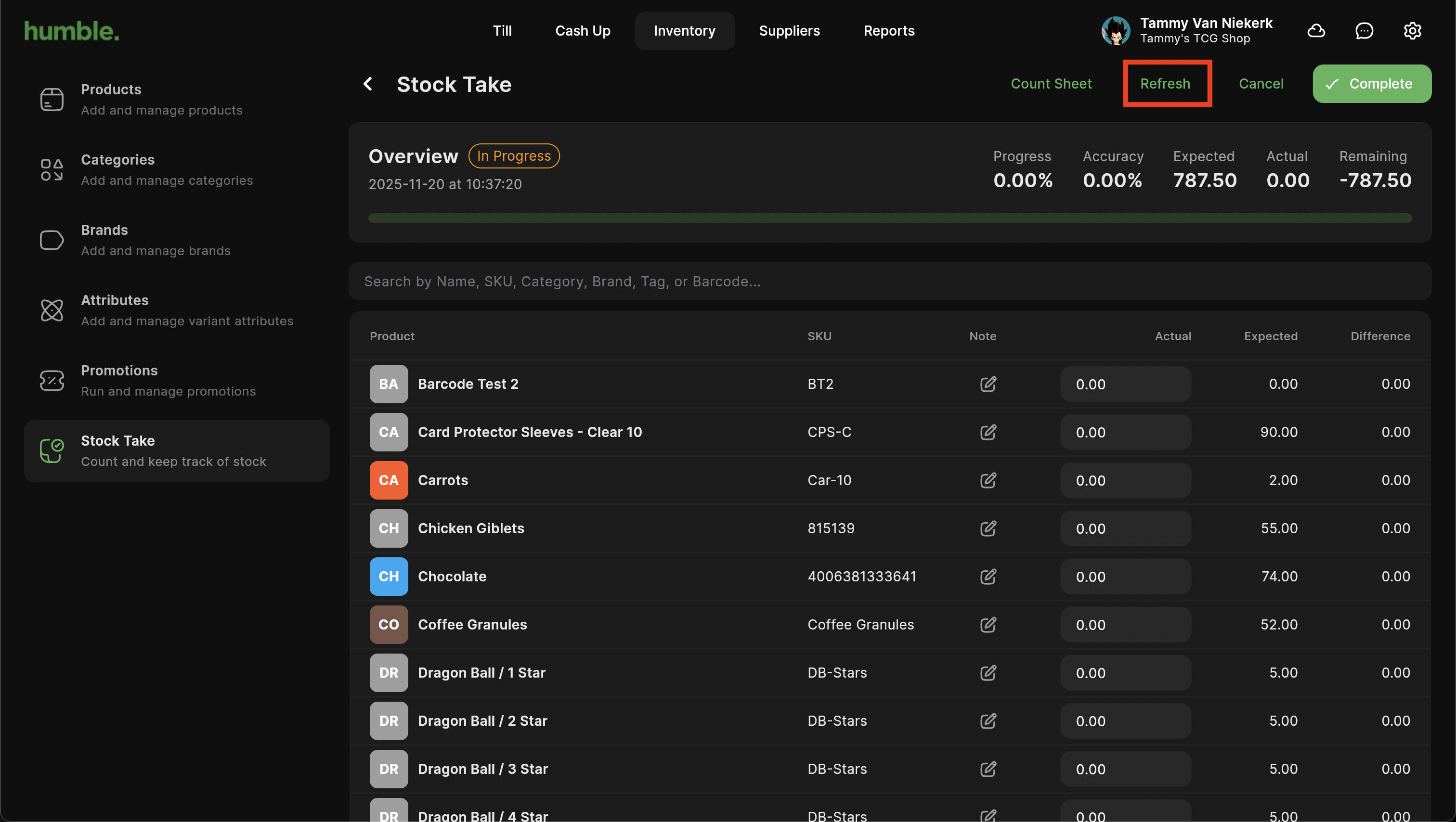 If you have more than one device that uses Humble 2.0 POS, stock might be sold on one device while you're busy with a stock take on another device. You can use the Refresh button at the top to refresh and see your up to date on hand values.