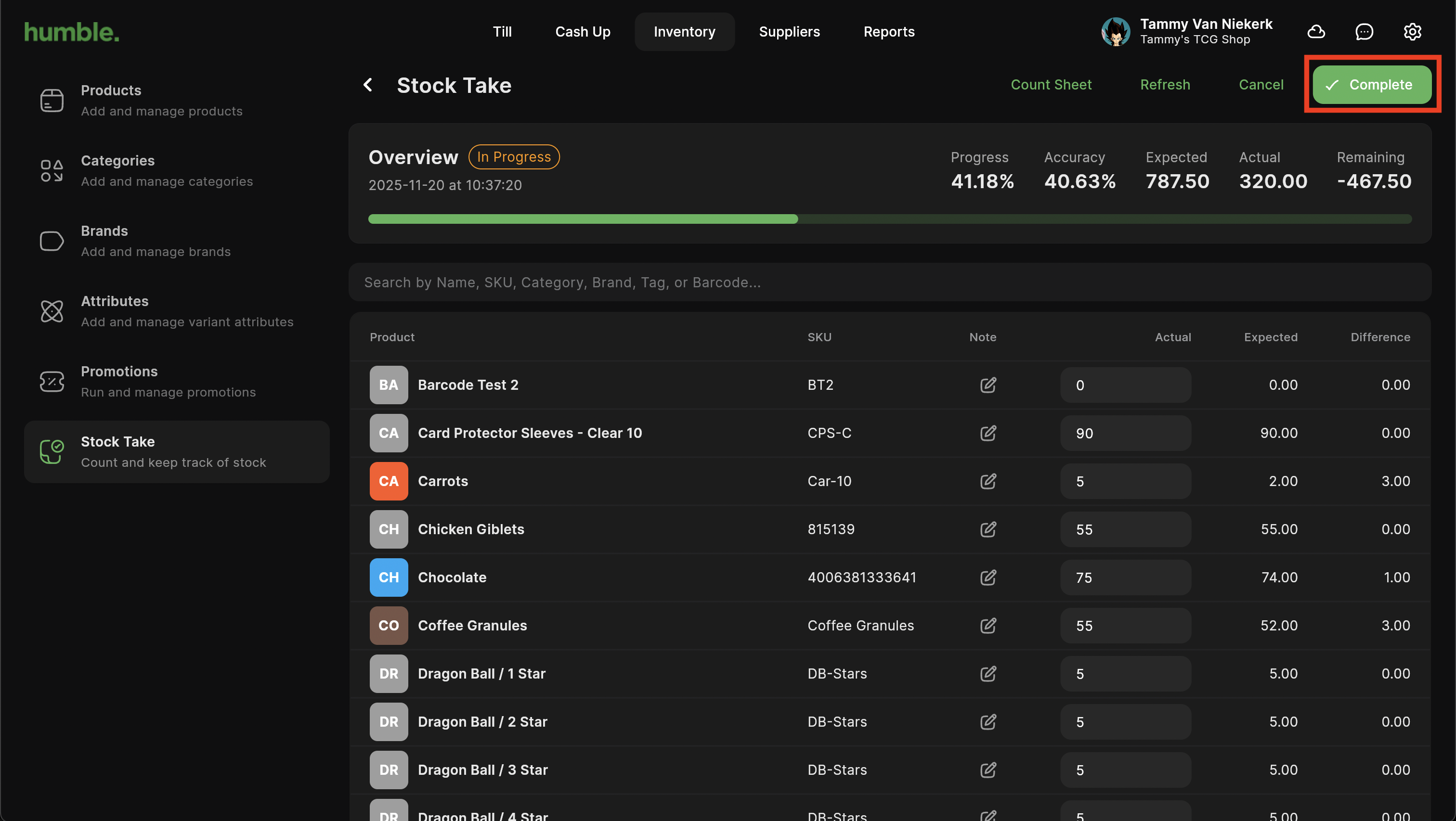 Once you have counted all your products and investigated any variances, click Complete.