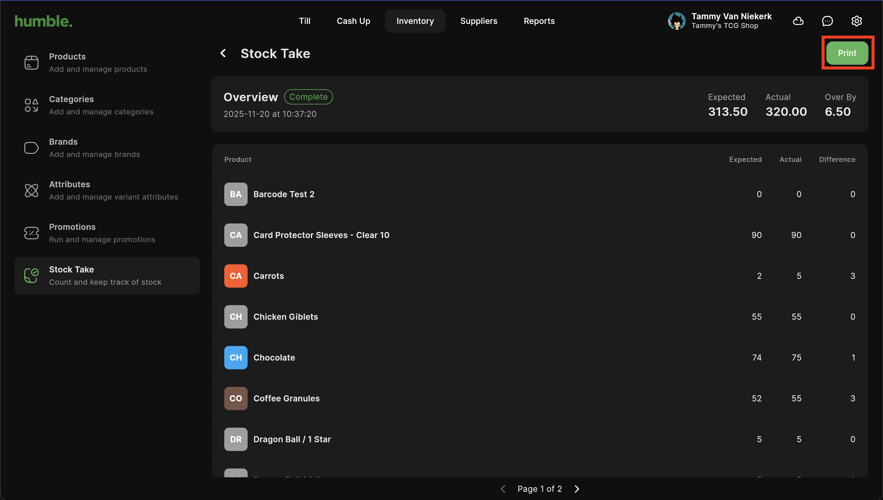 You will be taken back to the Overview screen of the stock take that you’ve just completed. It will be in a state of Completed and you are now given the option to print it. Click Print to download a PDF to your downloads folder.