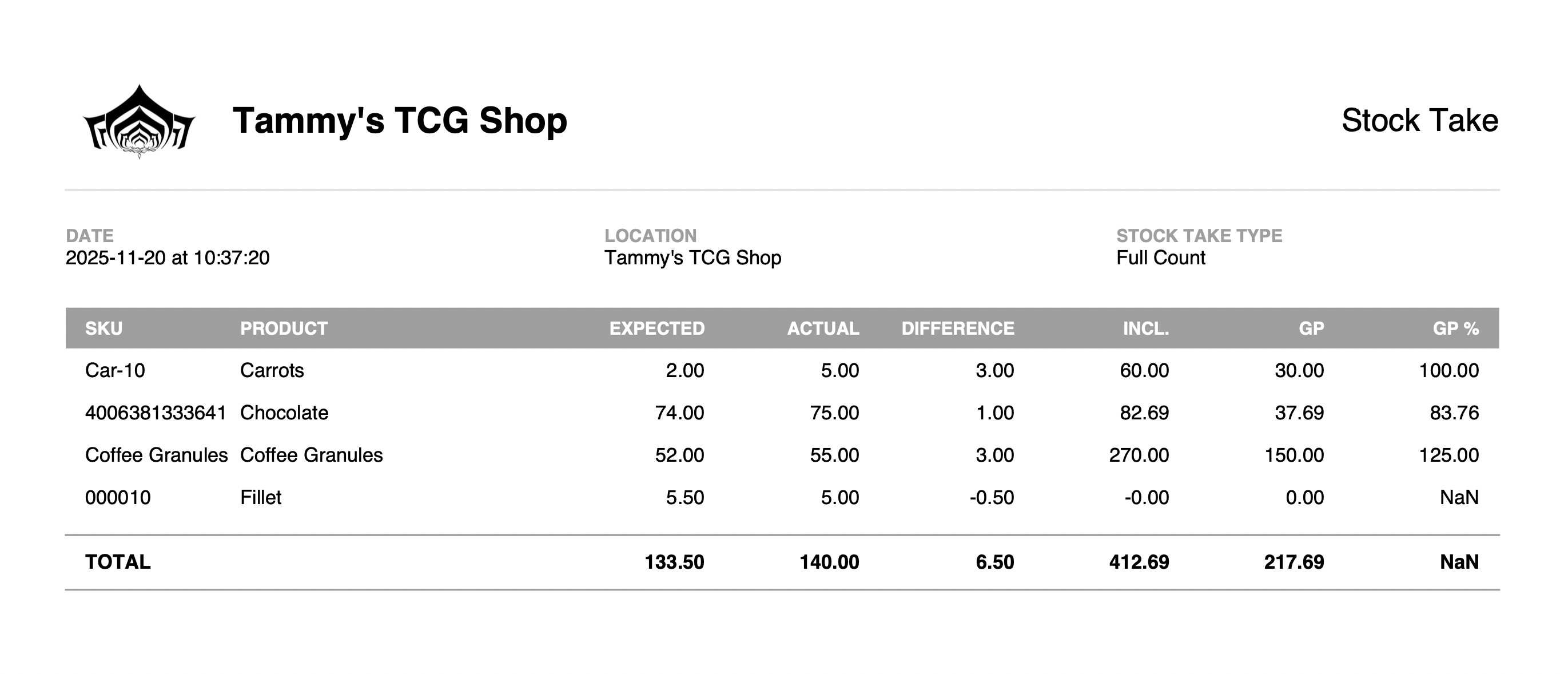 During a stock take, you and your staff count and record each item in your store. When the stock take is submitted, your store's on-hand quantities are updated, and you will receive a report of any unexpected variances in your inventory levels, including cost figures.