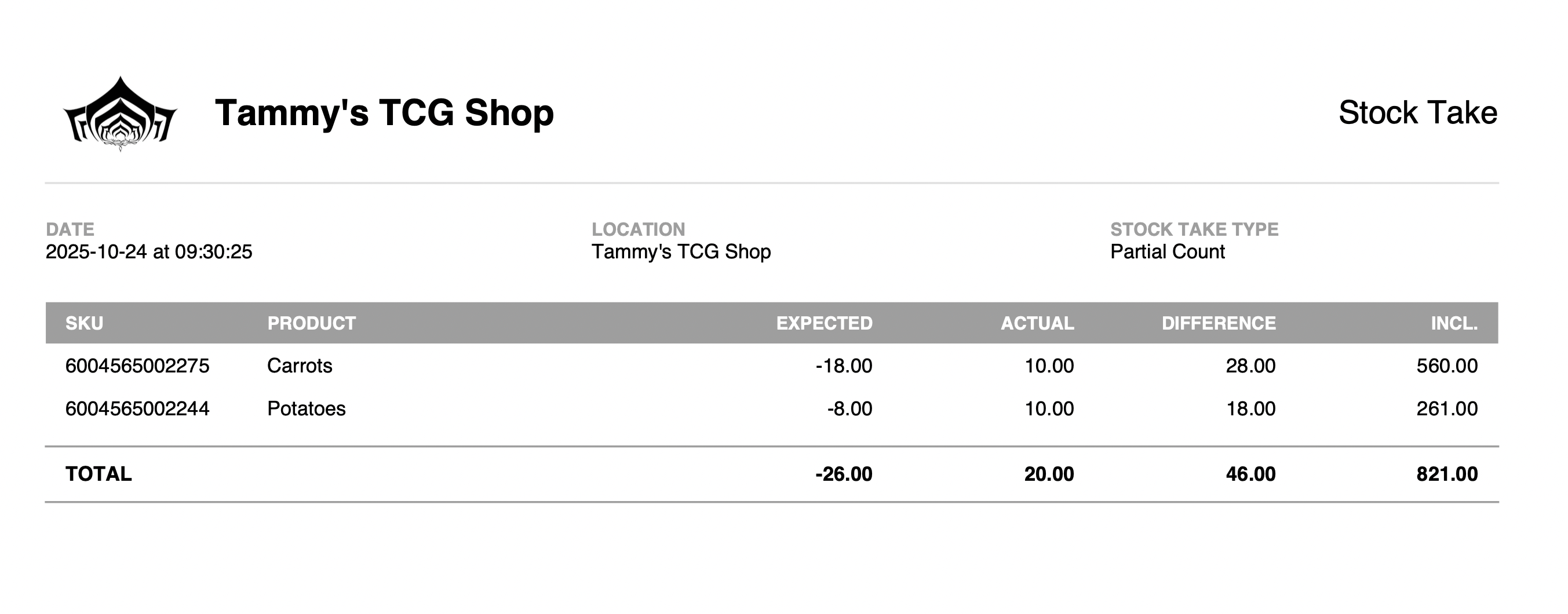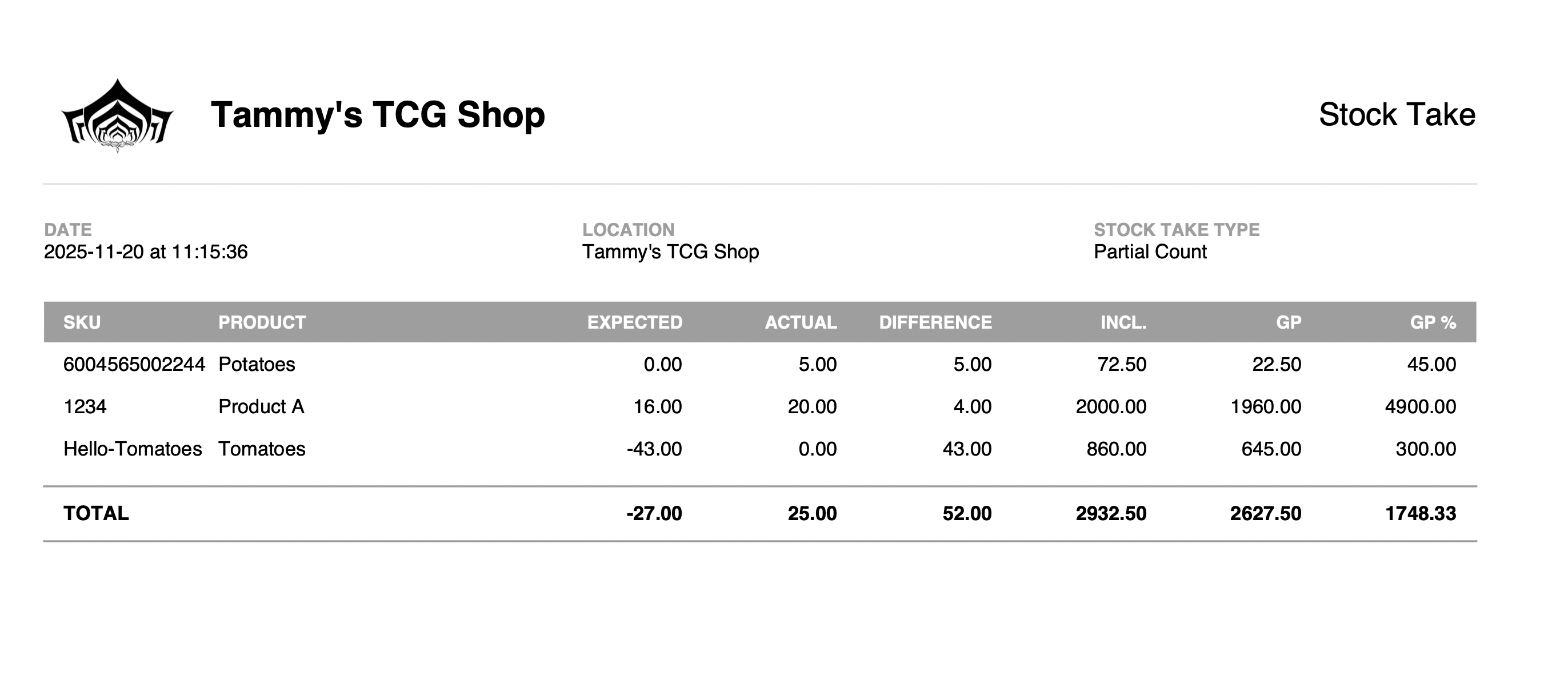 During an stock take, you and your staff count and record each item in your store. When the stock take is submitted, your store's on-hand quantities are updated, and you will receive a report of any unexpected variances in your inventory levels, including cost figures.