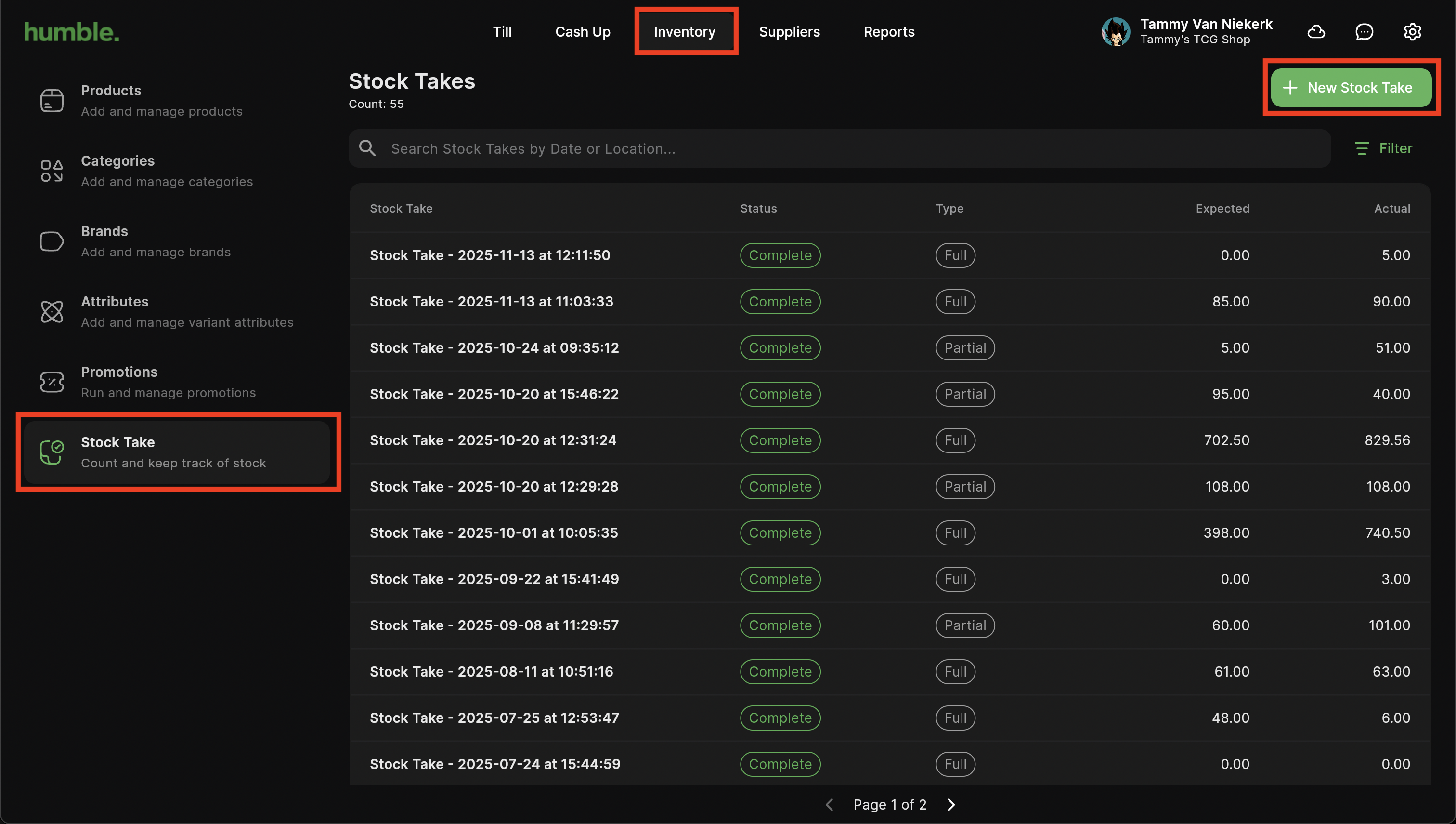 To start a stock Take, click on Inventory on the top navigation bar and then on Stock Takes. This will take you to the Stock Takes screen. Click on New Stock Take to start a new stock take.