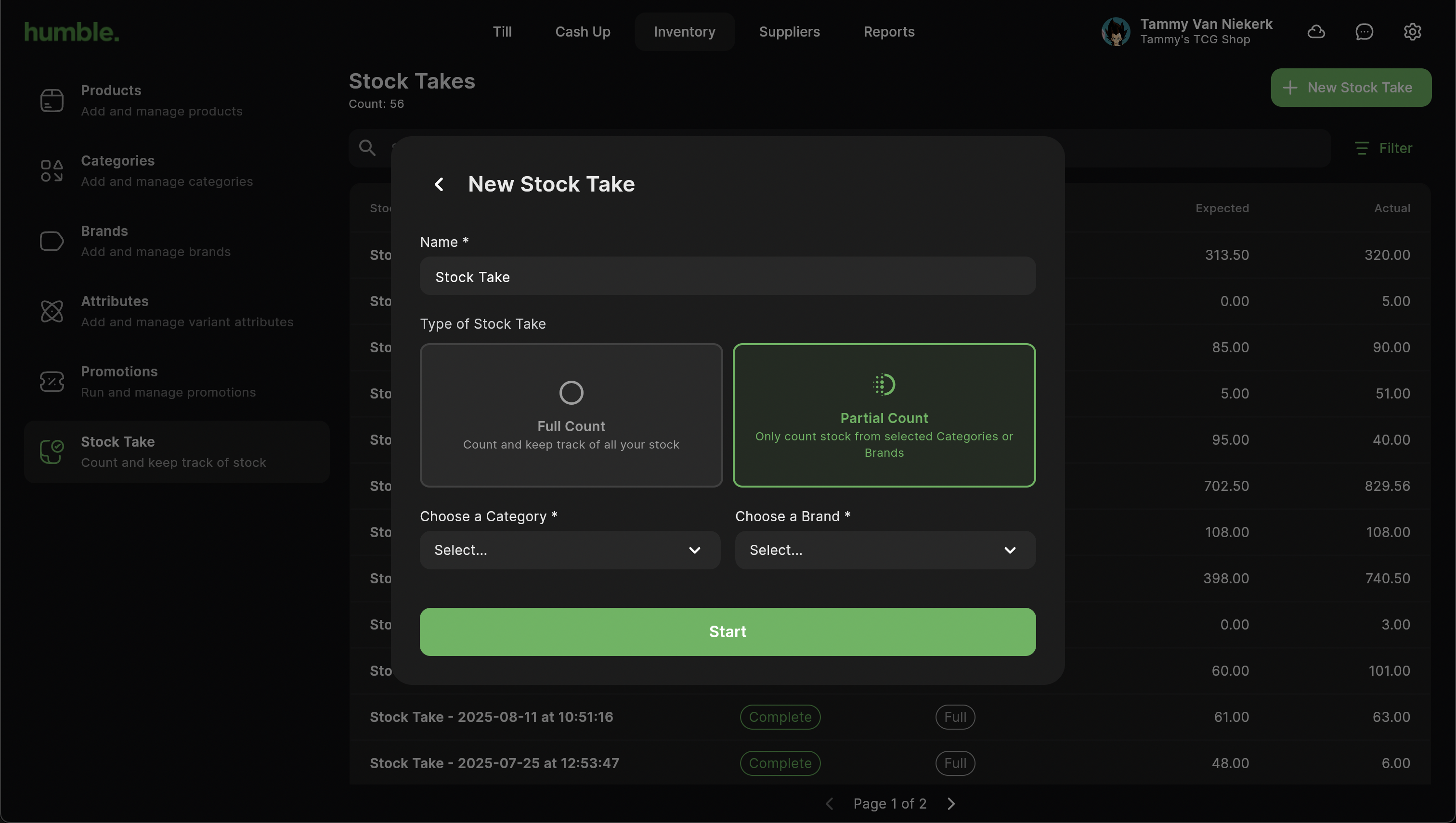 The New Stock Take Modal will appear. Here you can add the name of your stock take, and then select Partial Count. After selecting partial count, you will now need to select if you want to count products in a specific category or brand.
