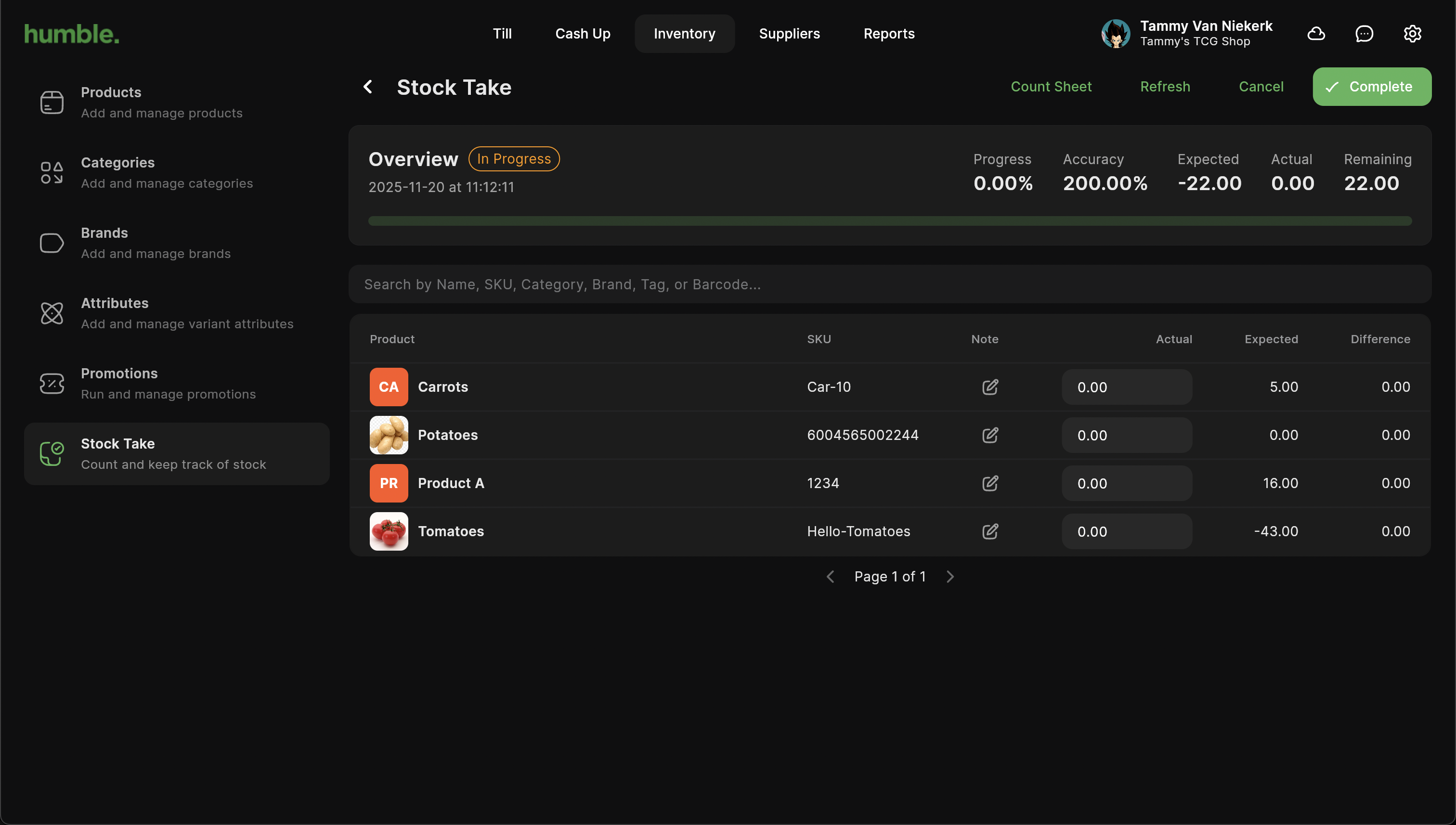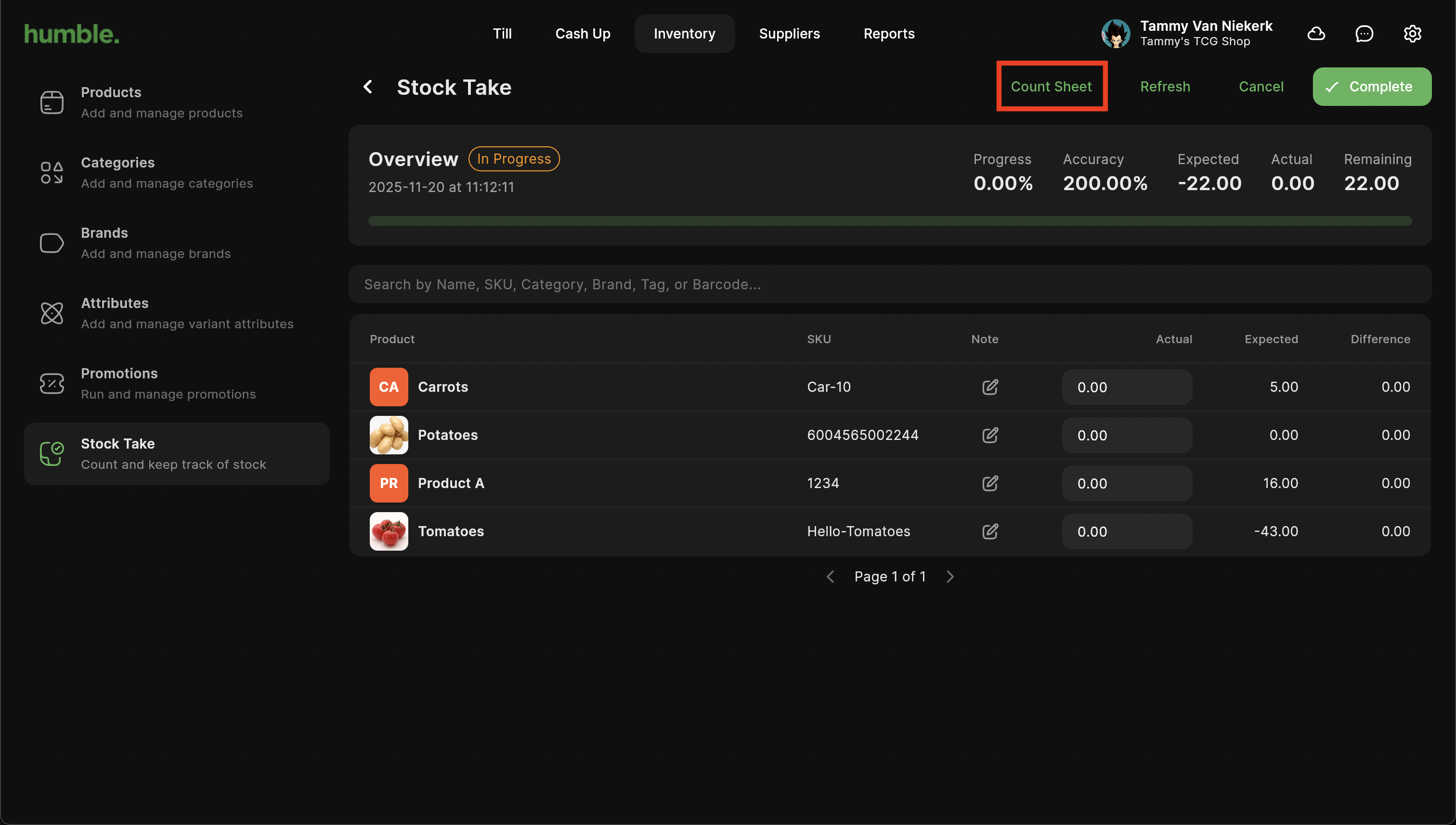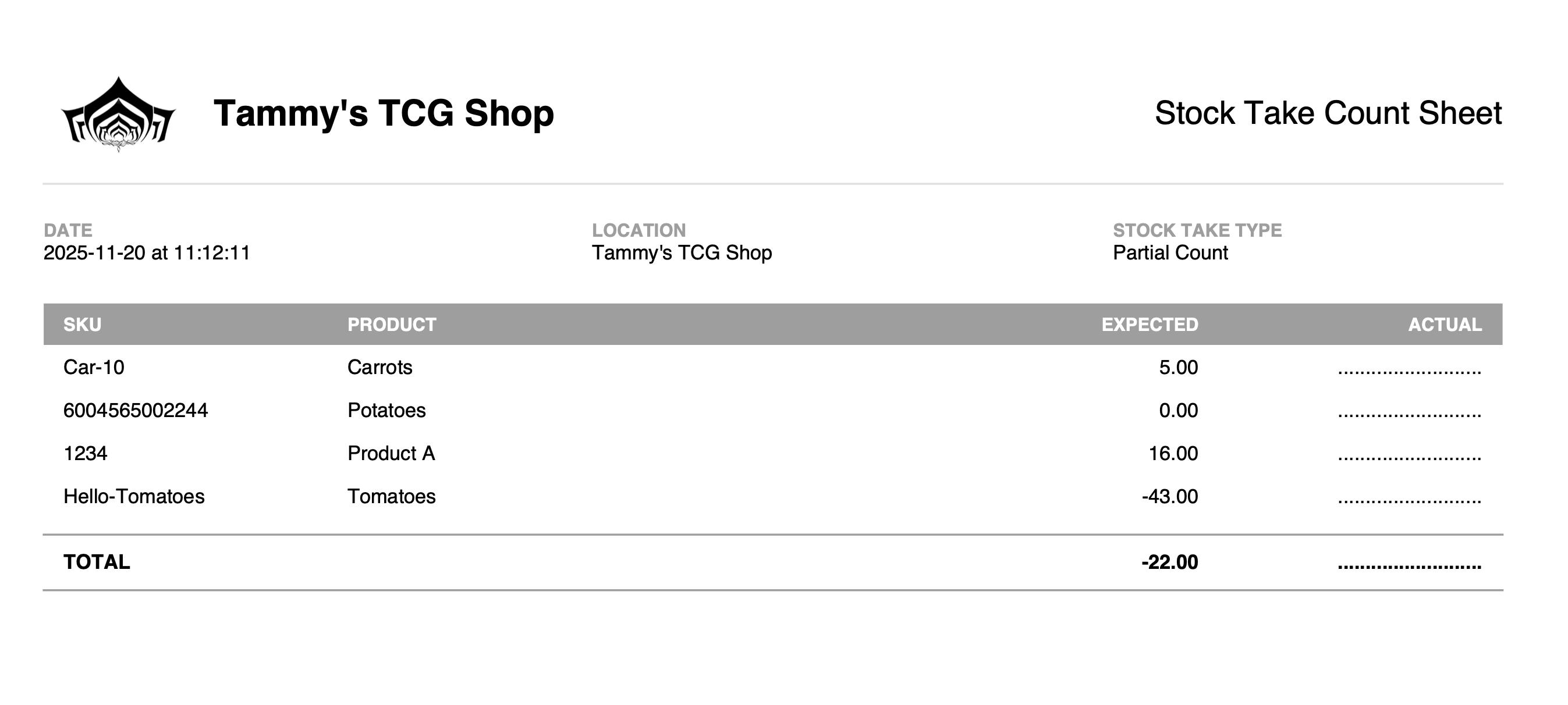 - Count Sheet - Allows you to print a PDF and write down your in stock amounts before entering then in on the Stock Take