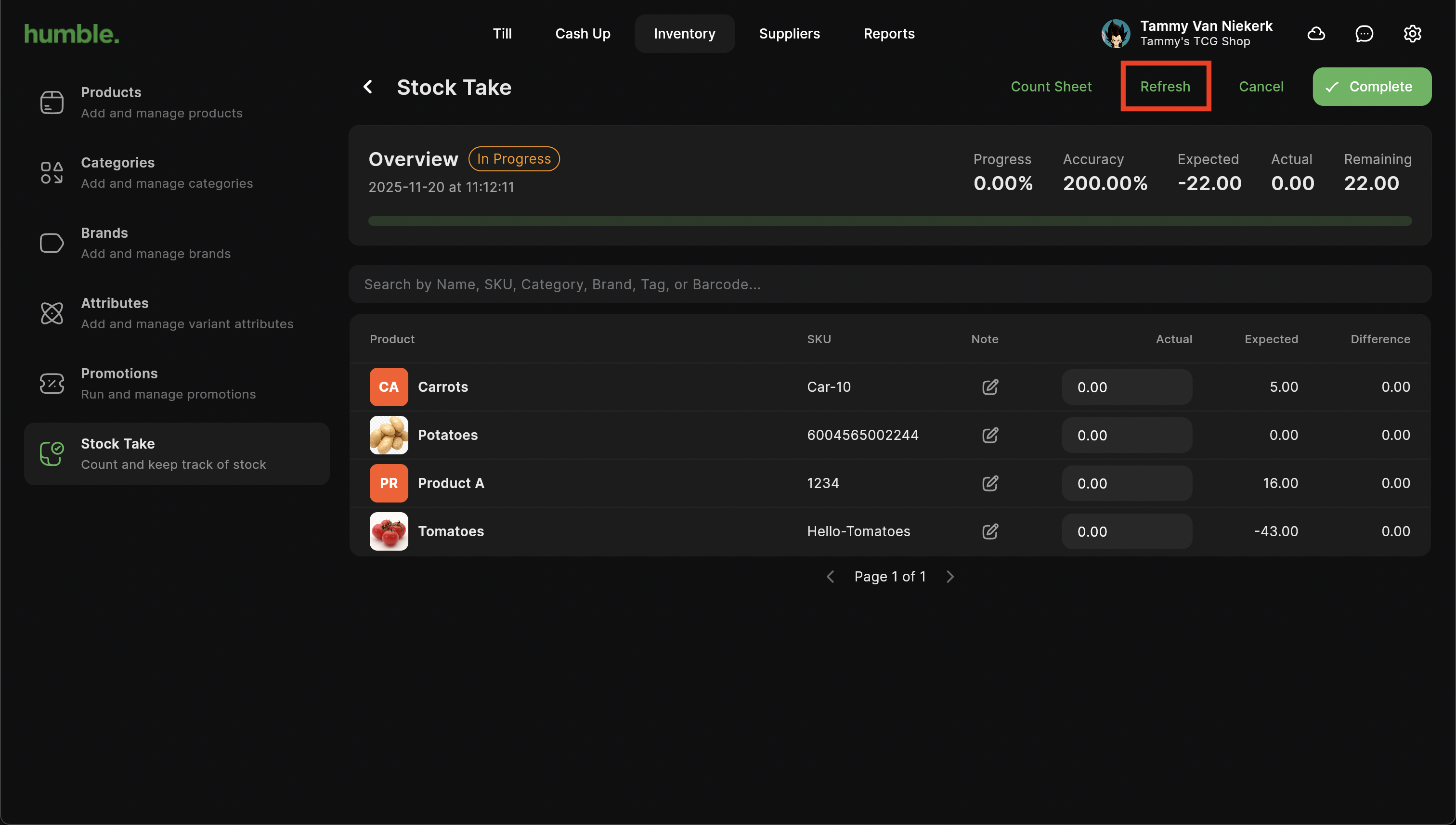 If you have more than one device that uses Humble 2.0 POS, stock might be sold on one device while you're busy with a stock take on another device. You can use the Refresh button at the top to refresh and see your up to date on hand values.
