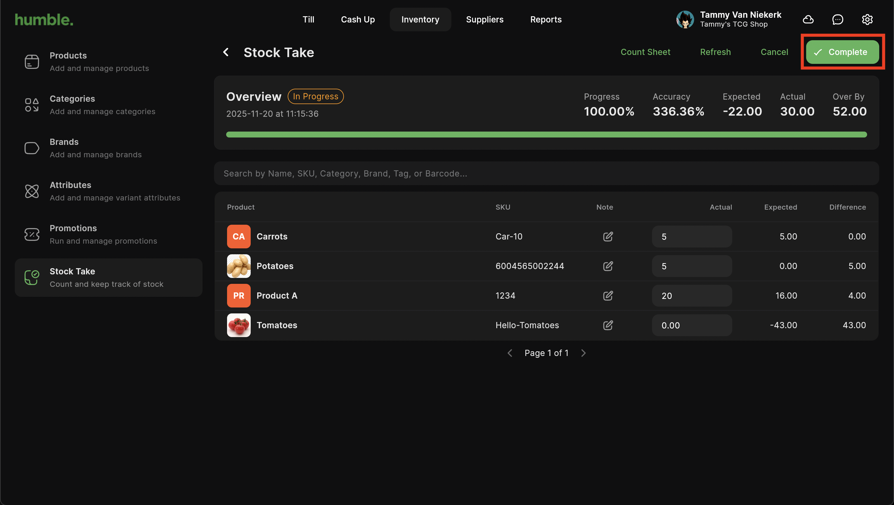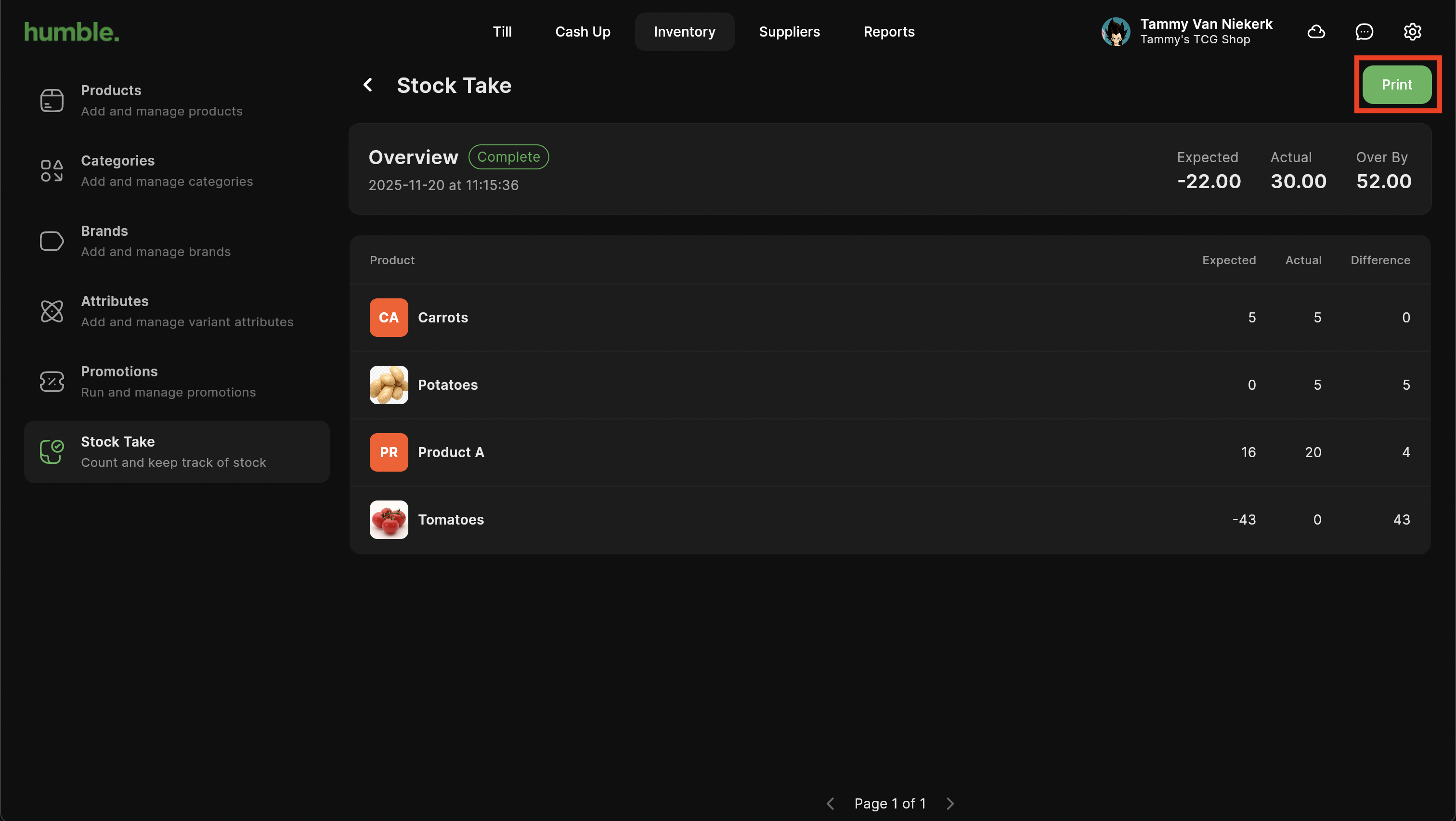 You will be taken back to the Overview screen of the stock take that you’ve just completed. It will be in a state of Completed and you are now given the option to print it. Click Print to download a PDF to your downloads folder.