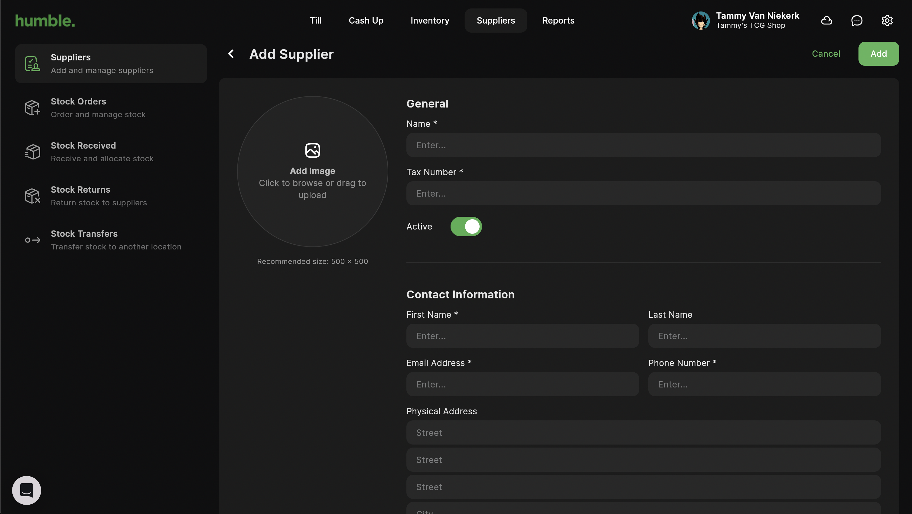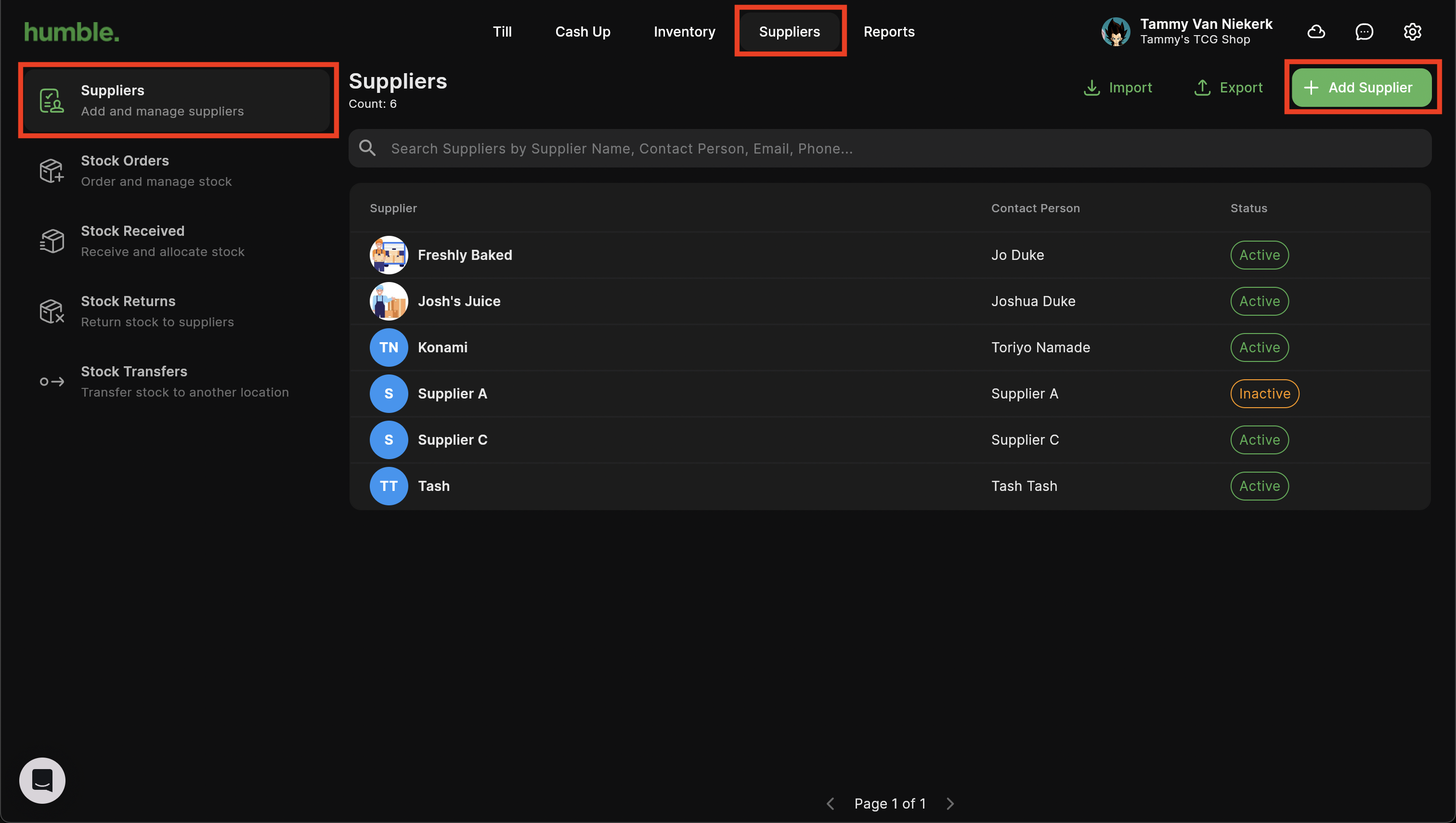 To add a new supplier, click on Suppliers in the top navigation bar. You will be taken to the Suppliers screen. To add a new supplier, click on Add Supplier.