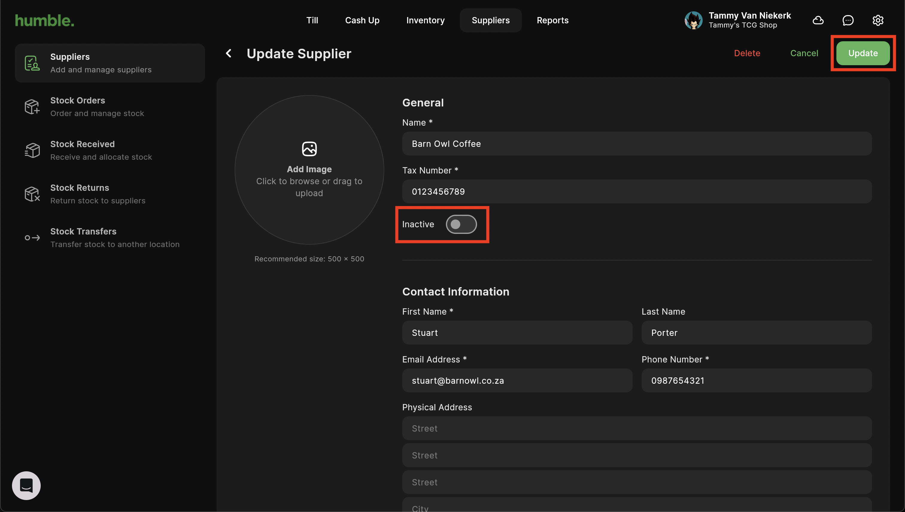 Select the supplier you wish to make inactive. In the Update Supplier screen click on Active to toggle it to Inactive and click Update.