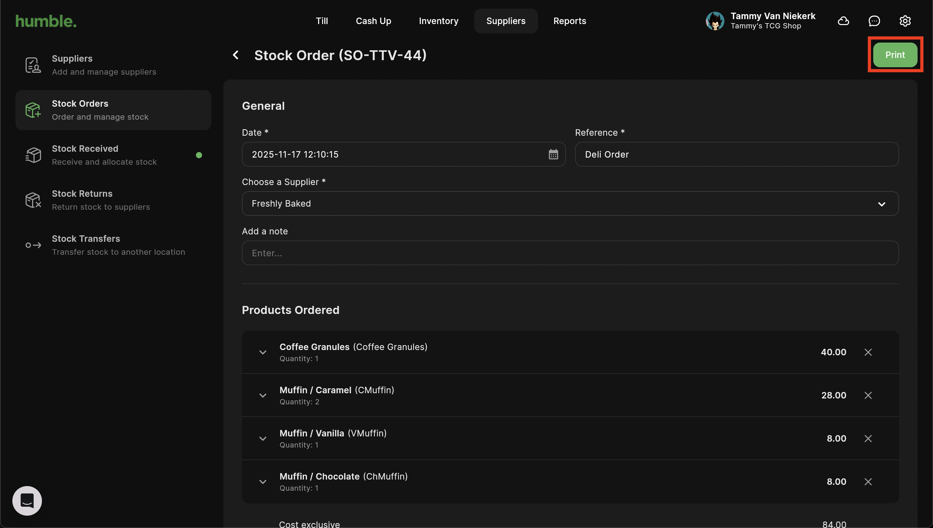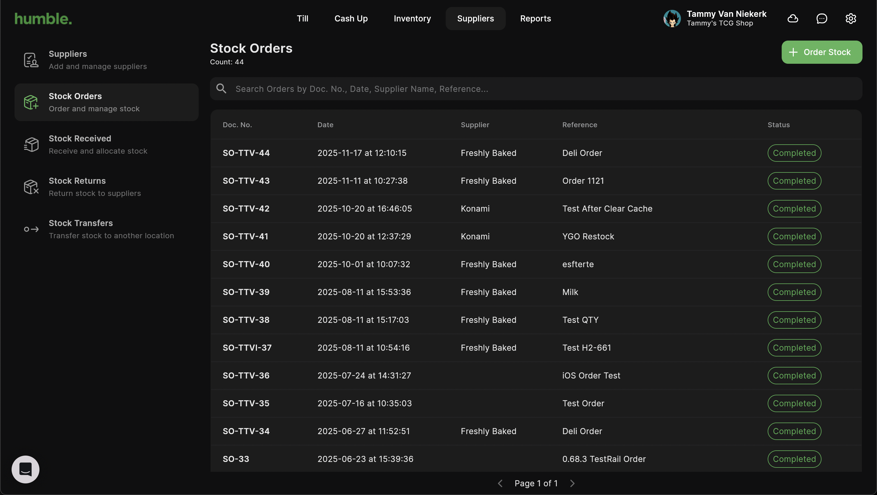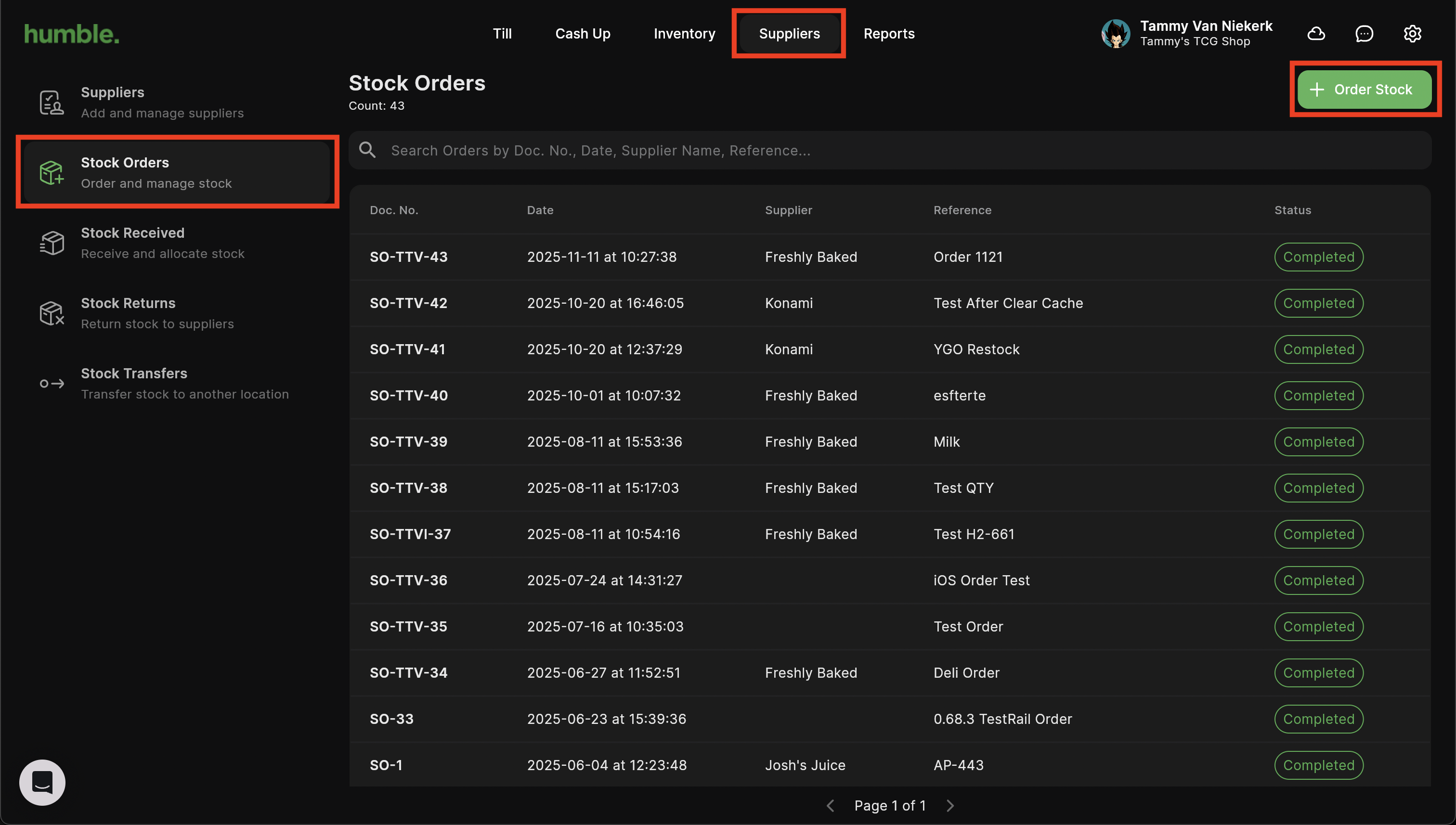 To create a new stock order, click on Suppliers in the top navigation bar, then click on Stock Orders. Next click on Order Stock.