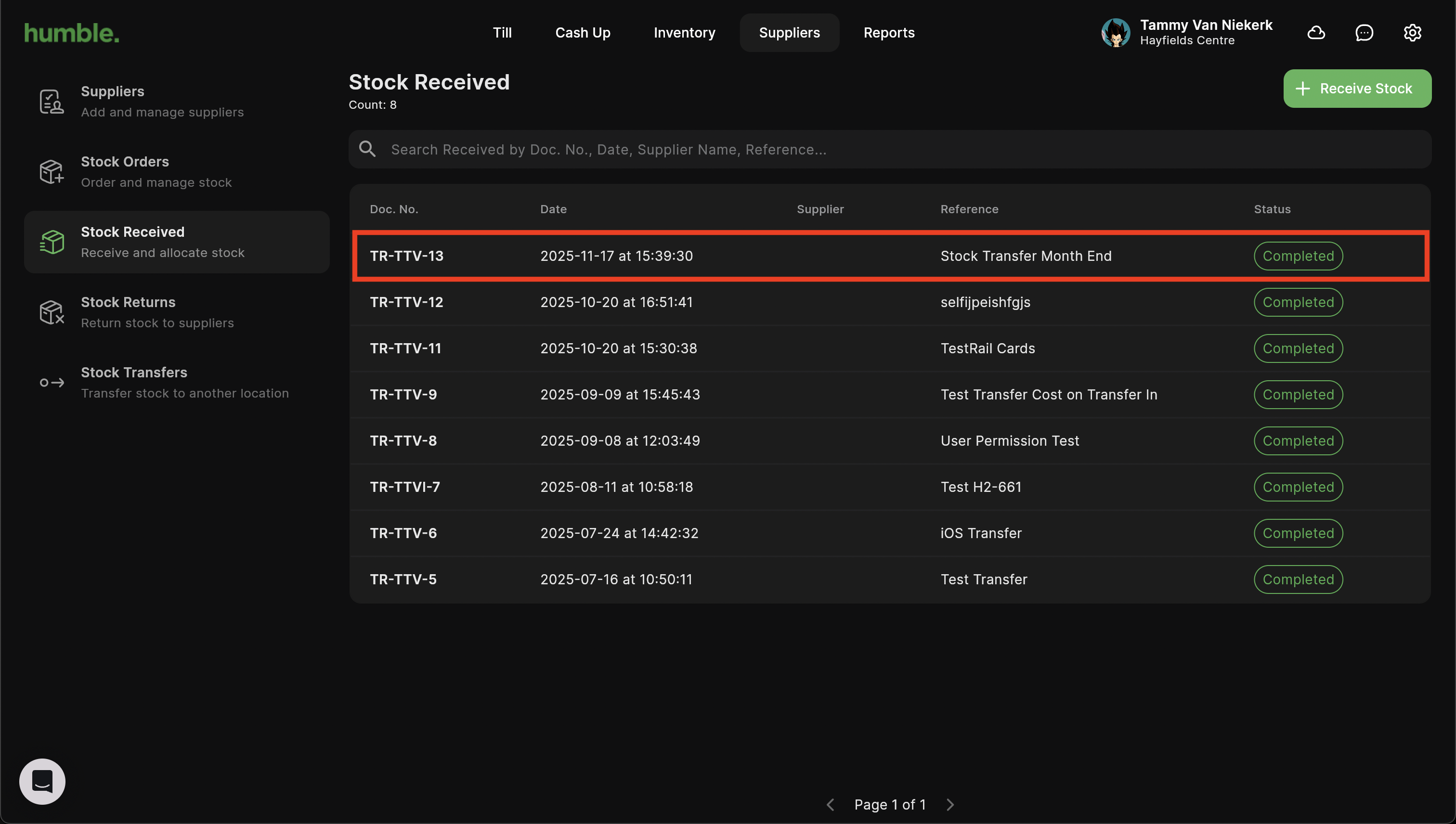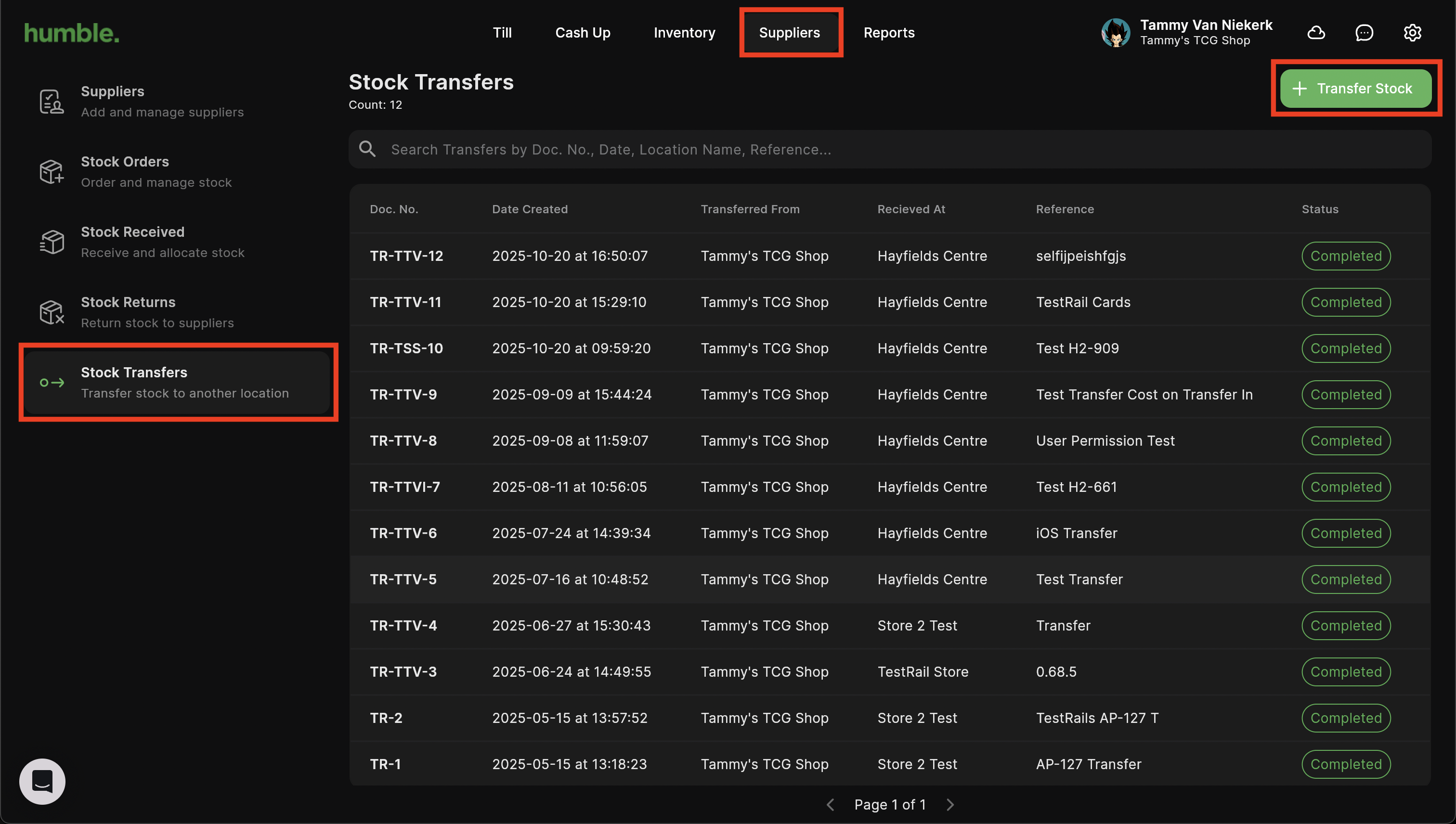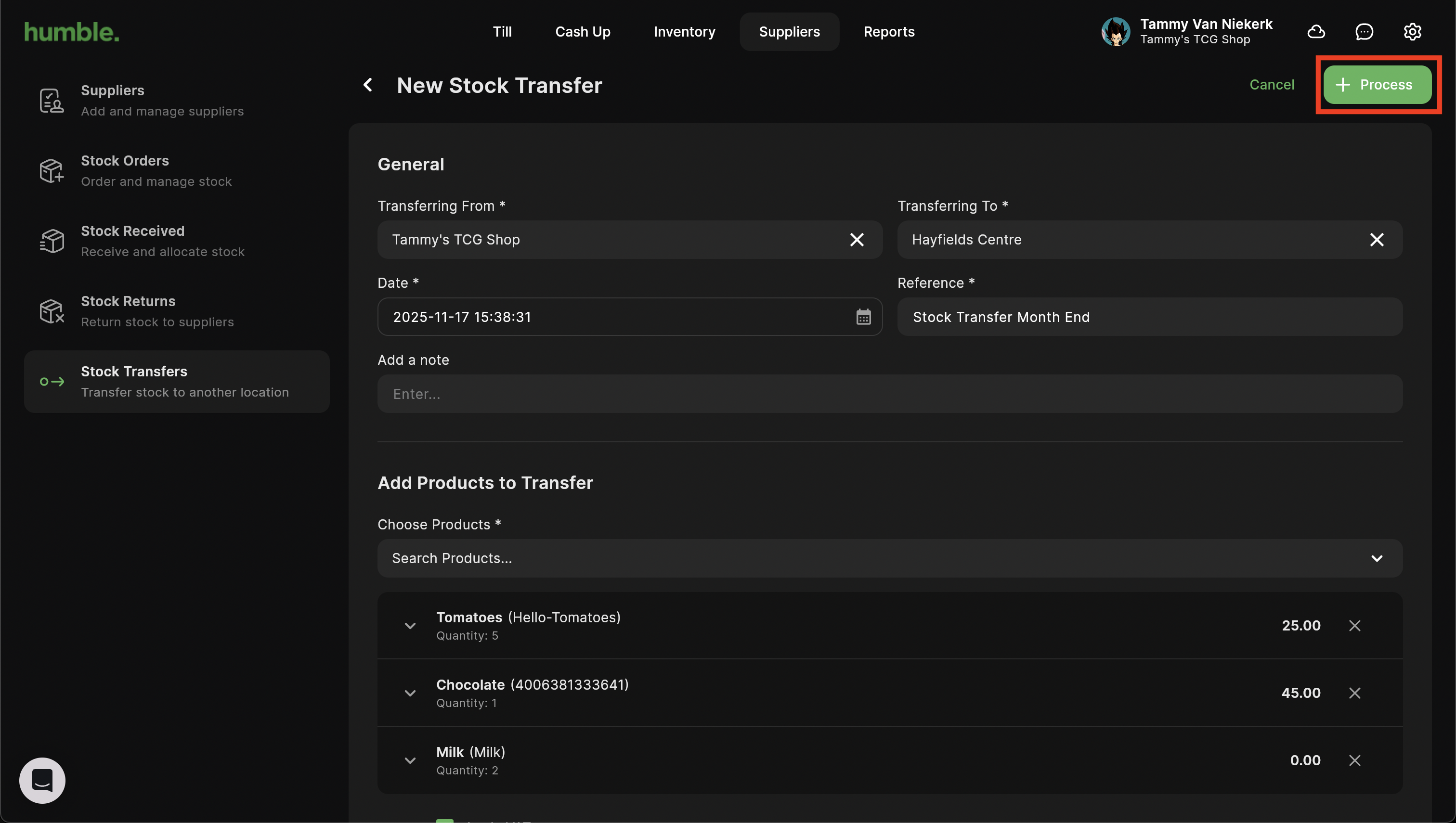 Your stock transfer will be processed and you will be taken back to the Stock Transfers screen. Your stock transfer will be added to your stock transfer list.