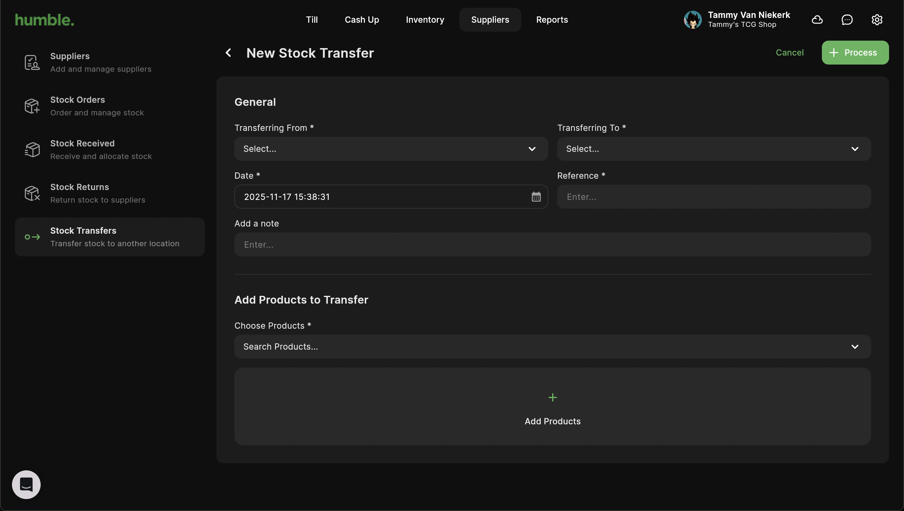 To create a new stock transfer, click on Suppliers in the top navigation bar, then click on Stock Transfers. Next click on Transfer Stock.