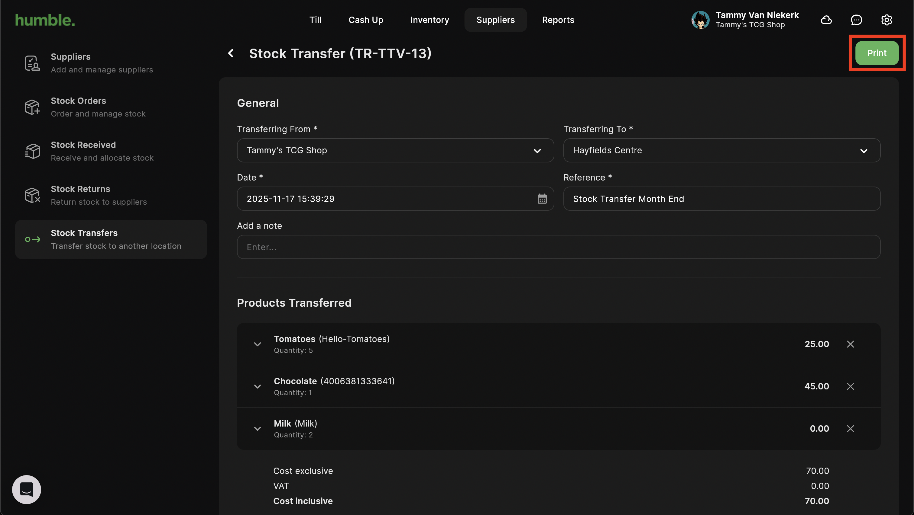 You can click on your processed stock transfer to view the details. Click Print to download the PDF to your downloads folder.