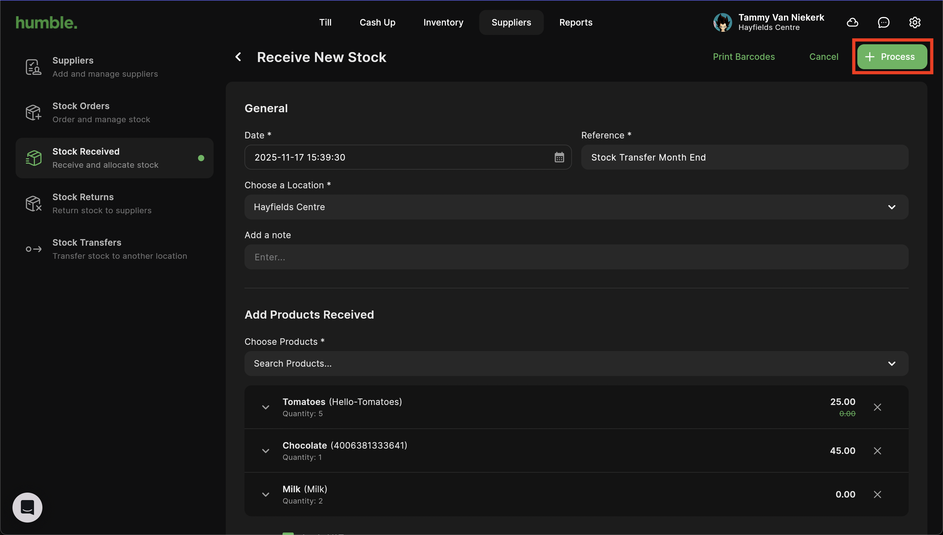 Once the stock transfer has been processed at your first store, an unprocessed stock receipt will be generated under Stock Received at your second store.