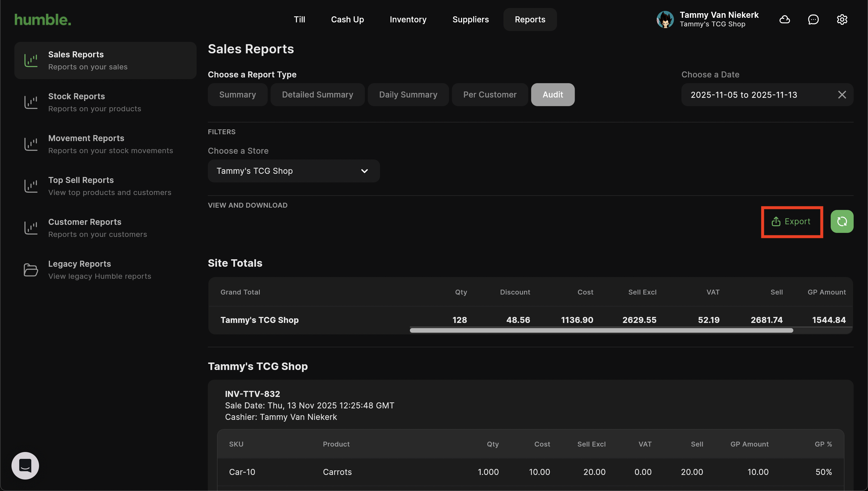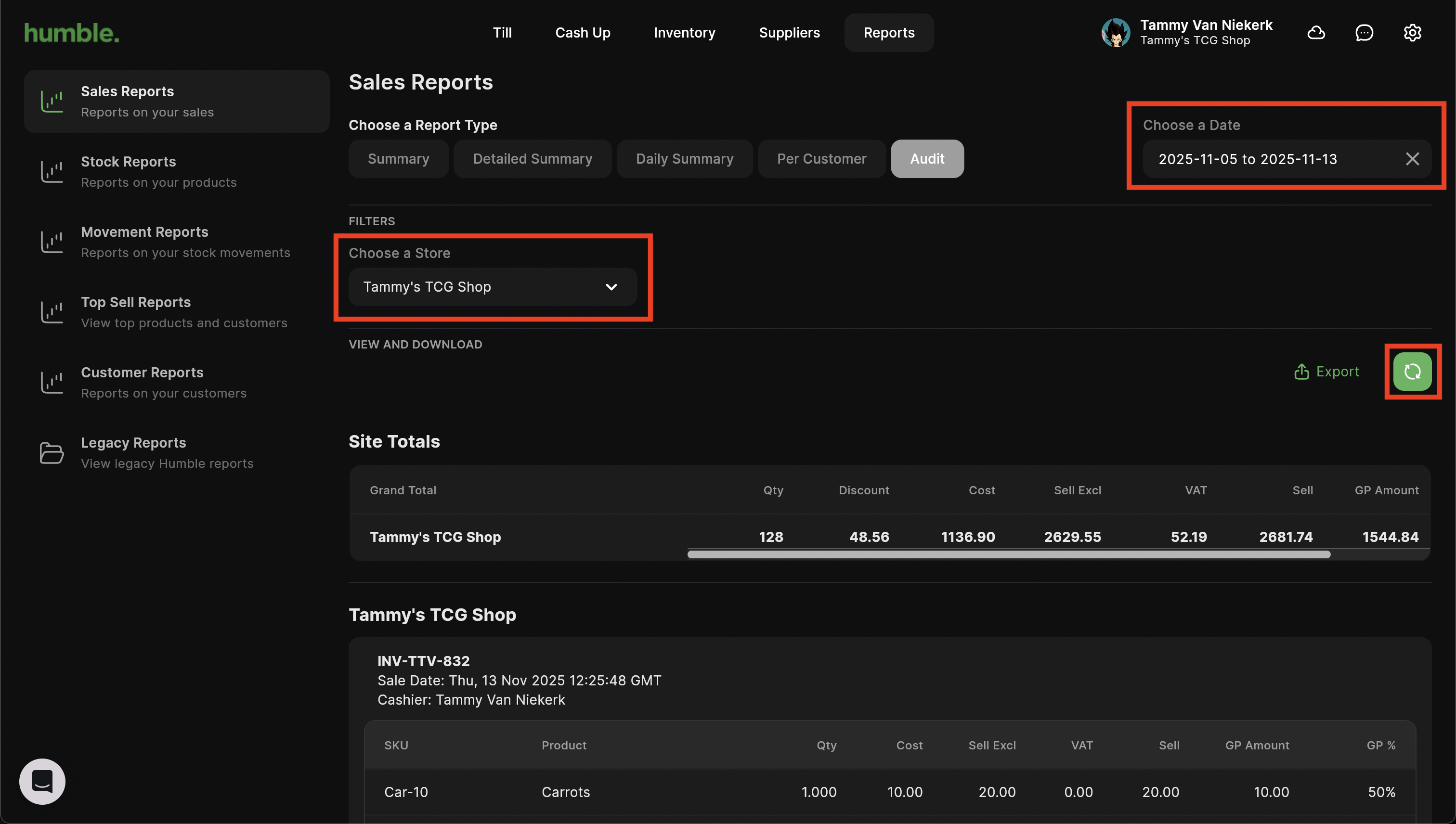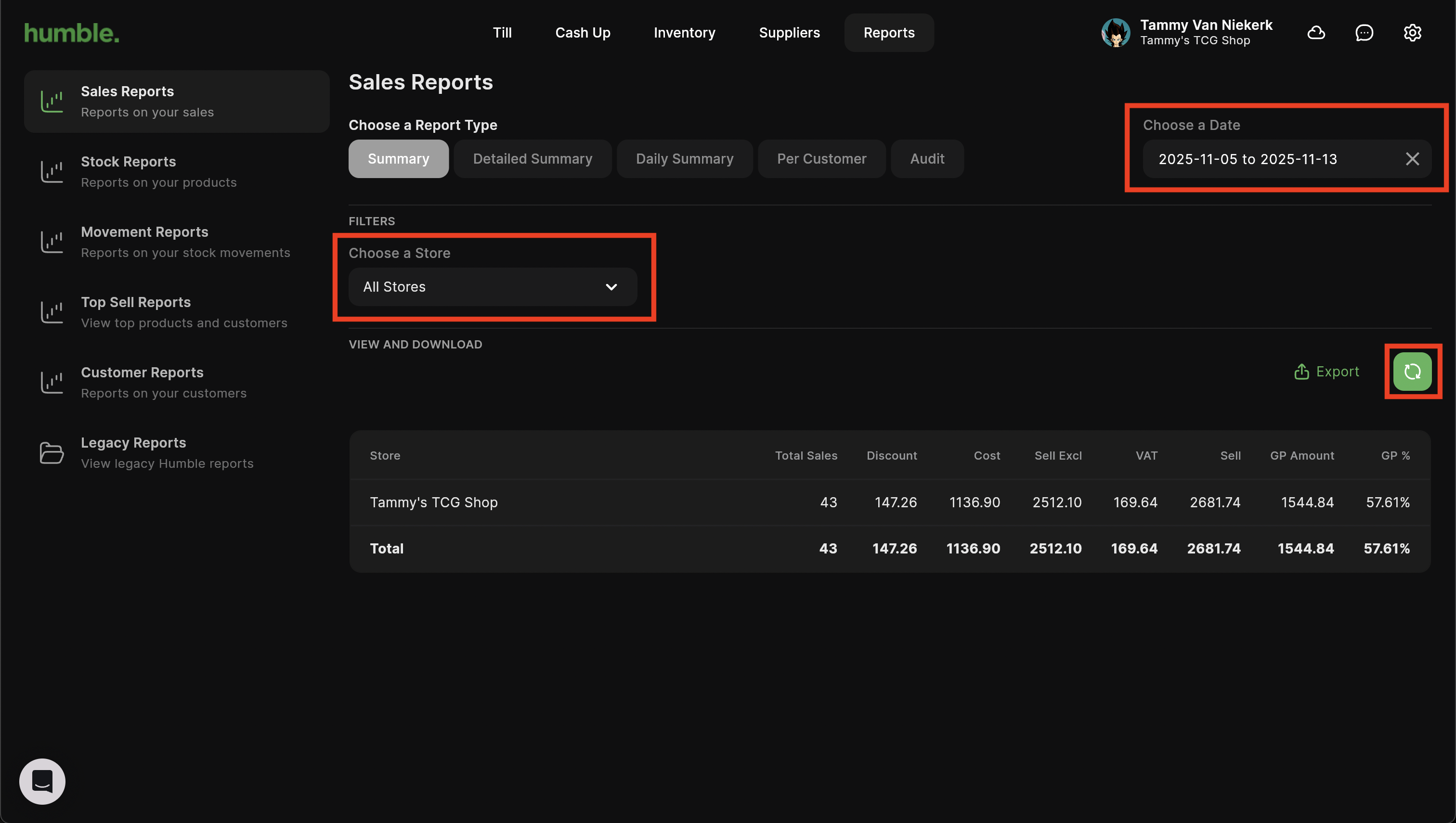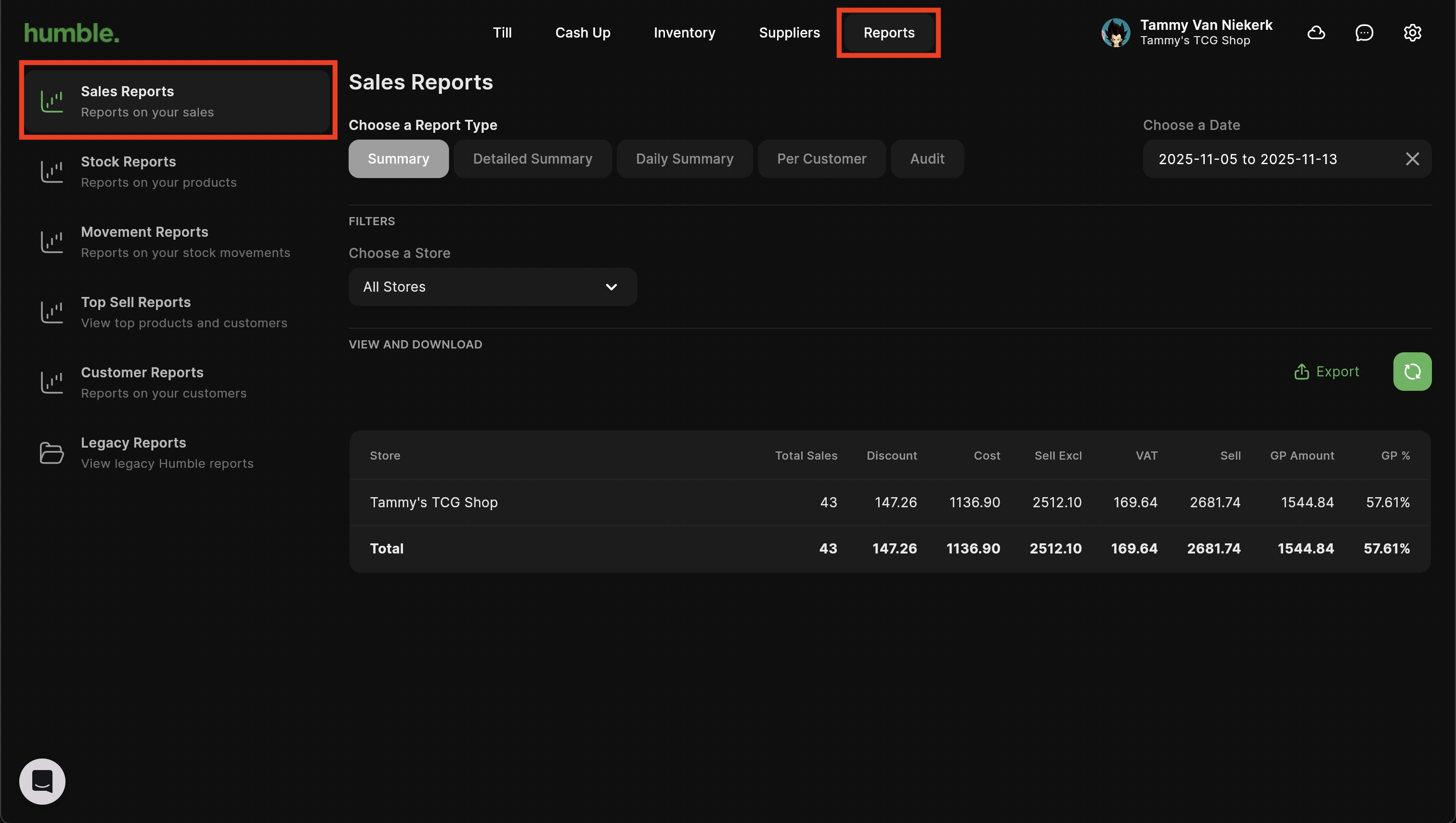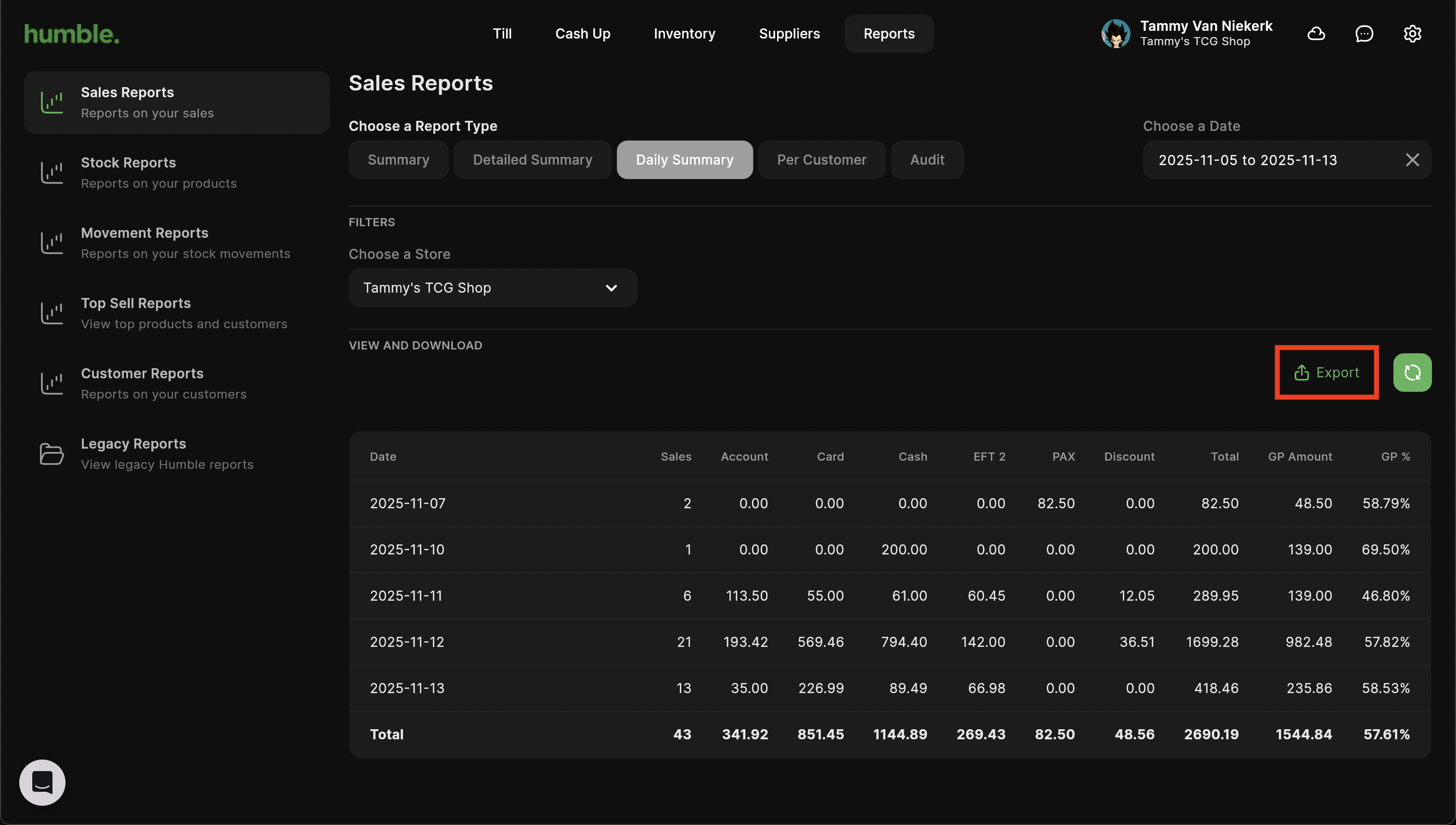 The Daily Summary report shows you an overview of the total number of sales for the day, the total cost amount, the total selling amount as well as GP amount and GP percentage for that date. This report can be filtered by store and date range.