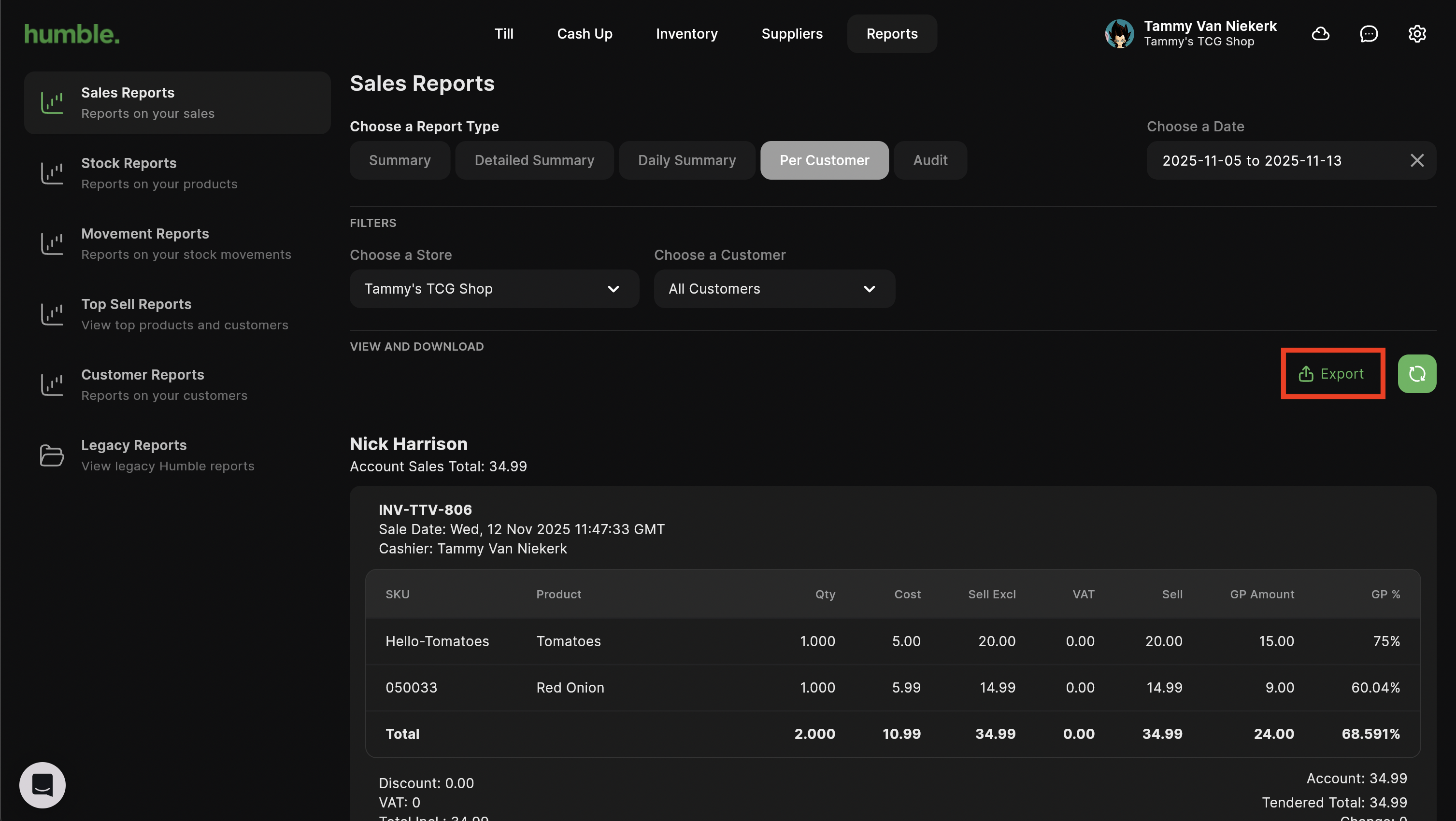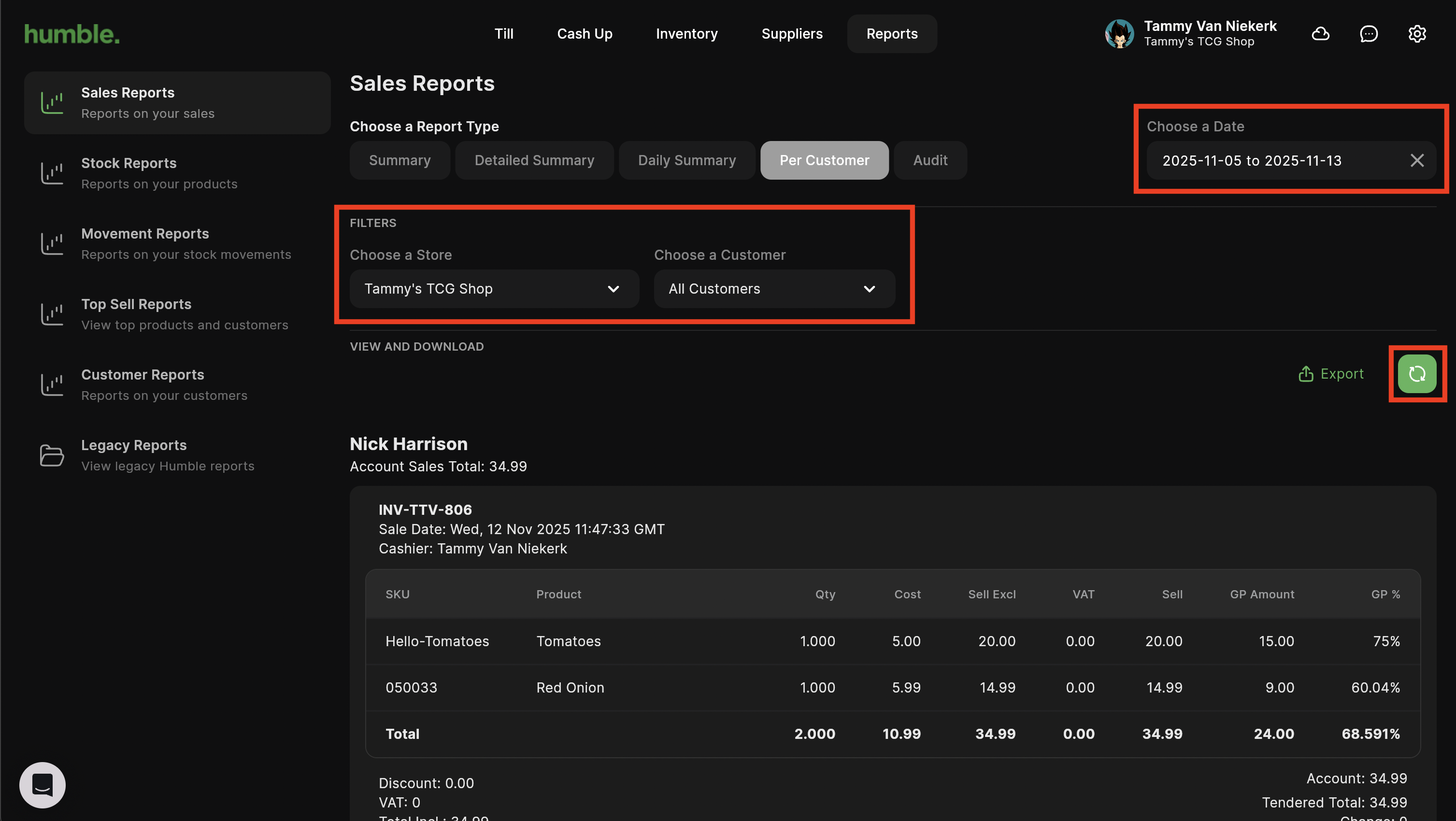 The Per Customer report shows the total balance of a customer account for the specified date range as well as details of the customers purchases in that period. This report can be filtered by store, customer and date range.