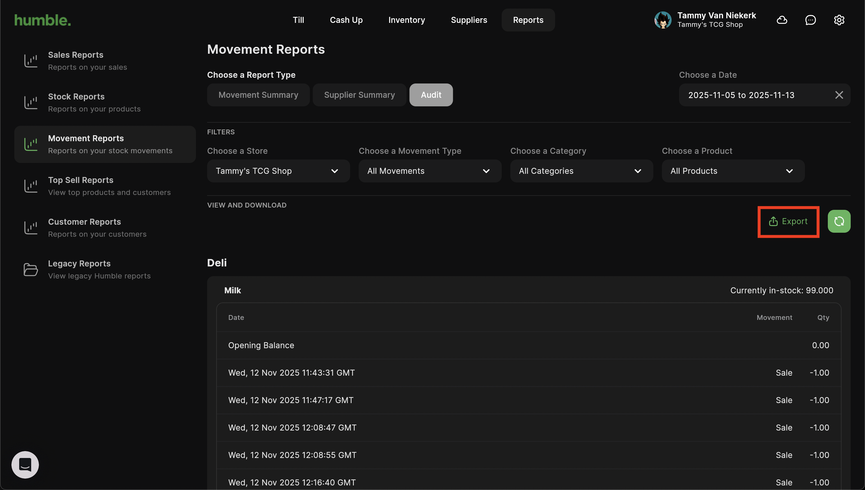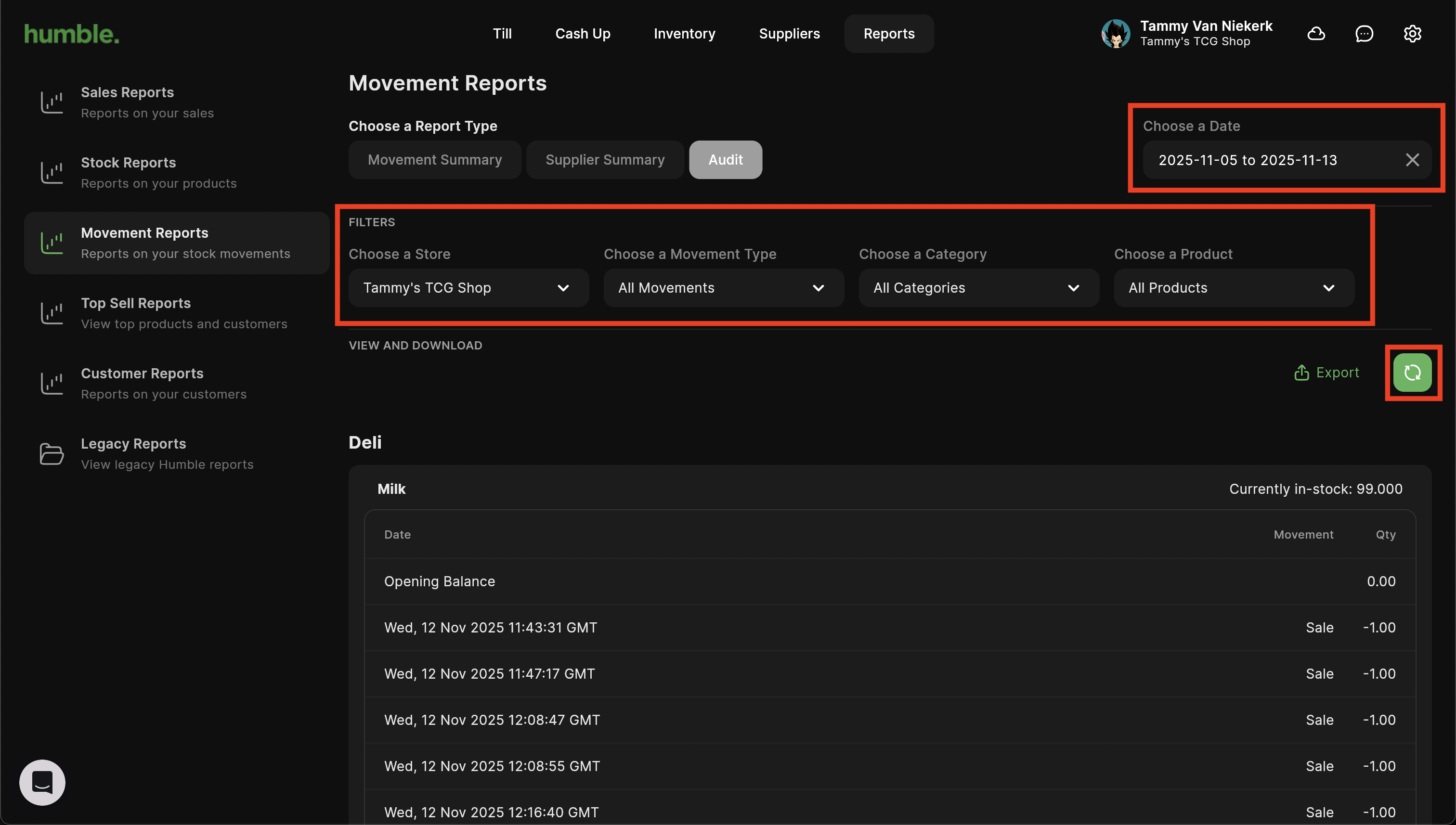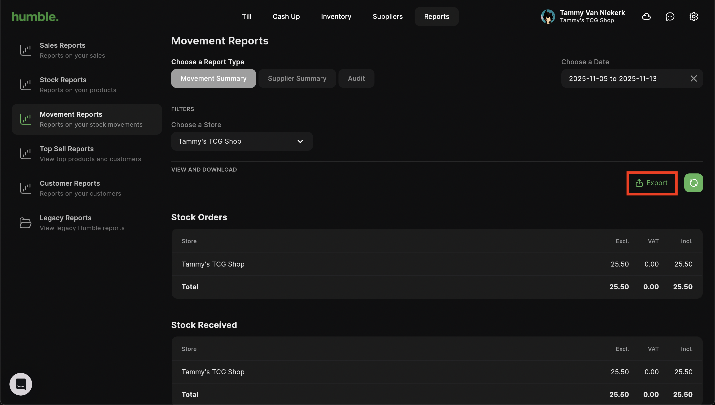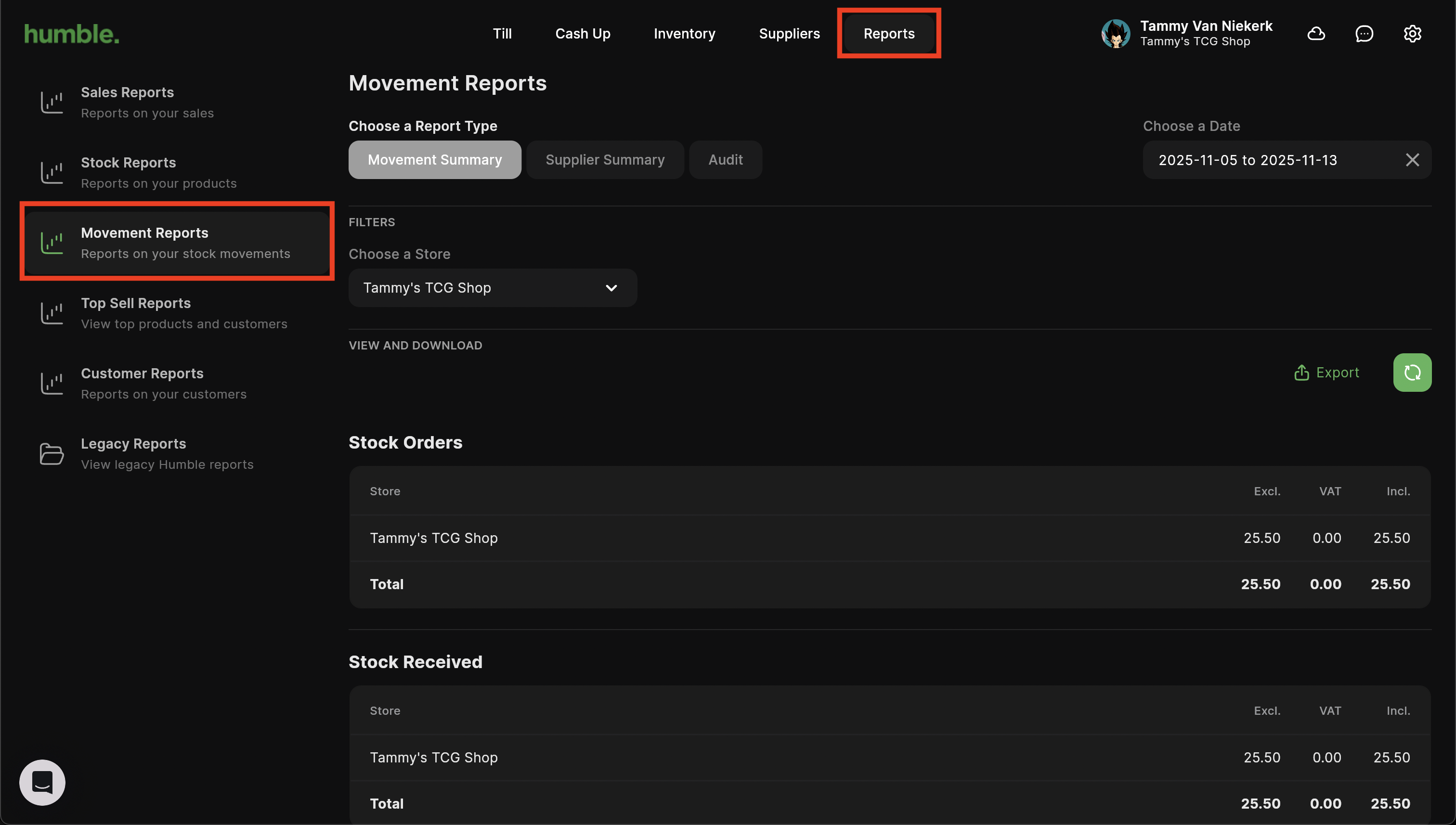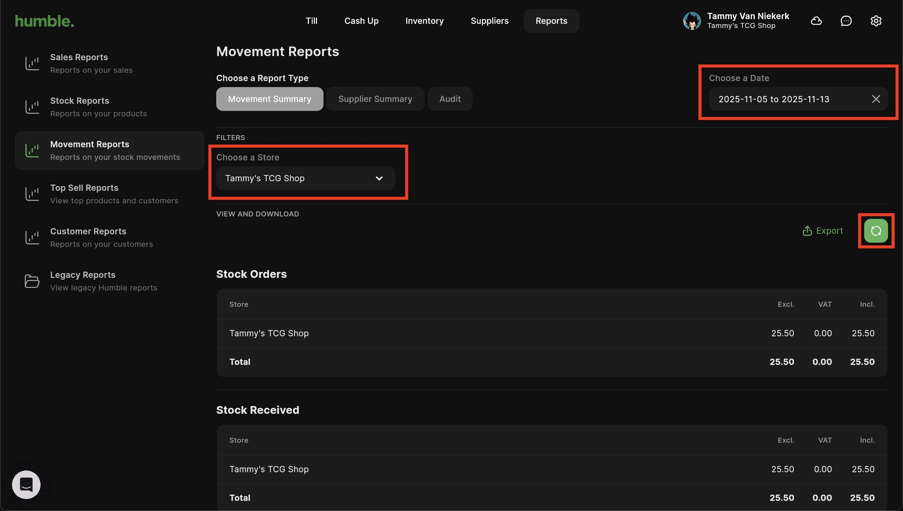 The Movement Summary report gives you a summary of the movements made for a particular store. This report can be filtered by store and date range.