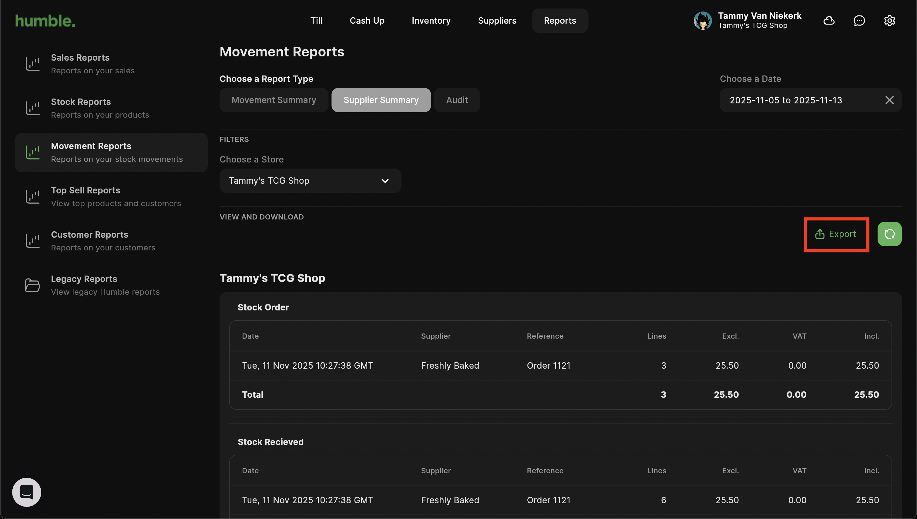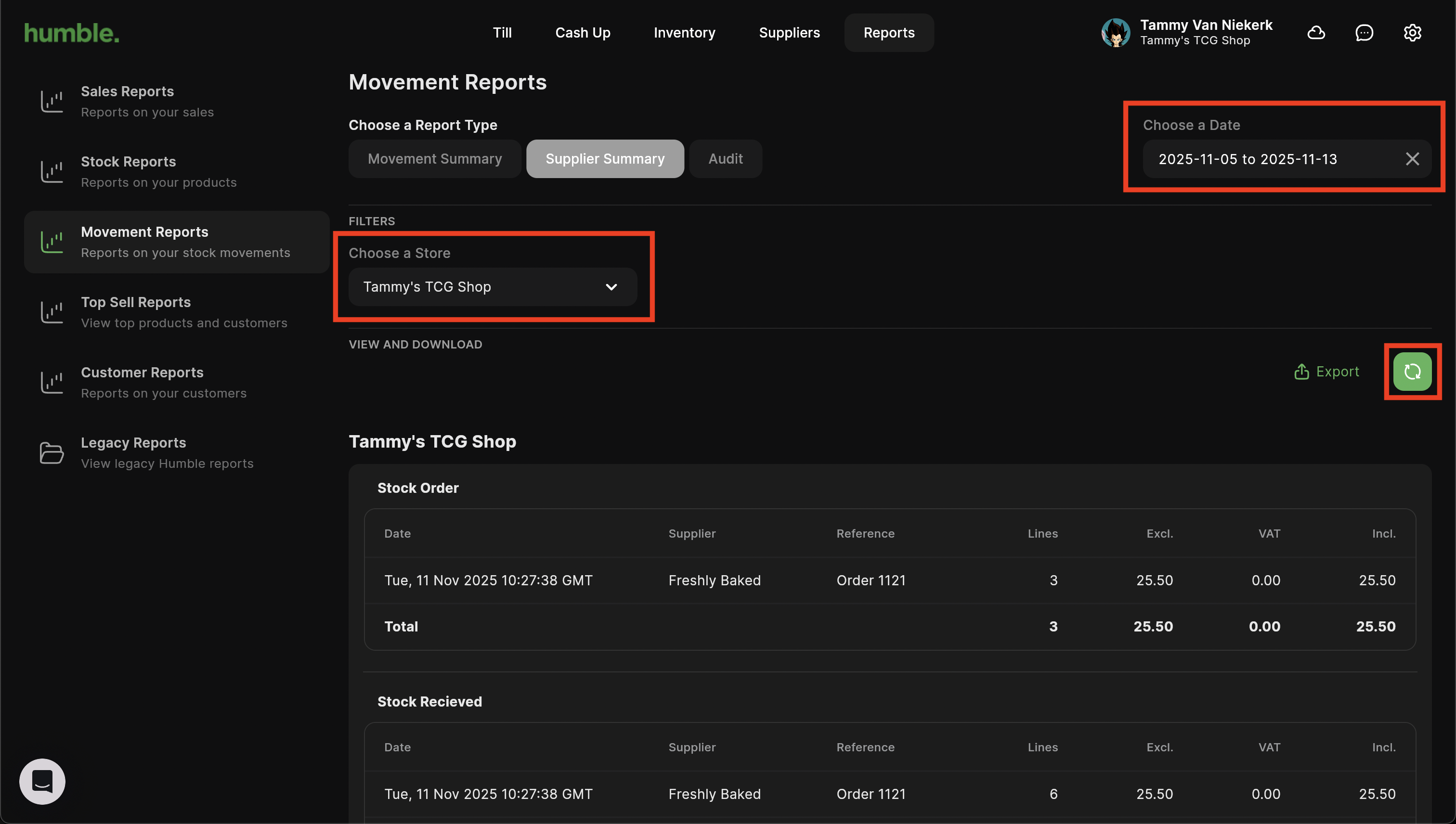 The Supplier Summary report gives you a summary of the movements made for a particular store, showing the supplier linked to the movement. This report can be filtered by store and date range.
