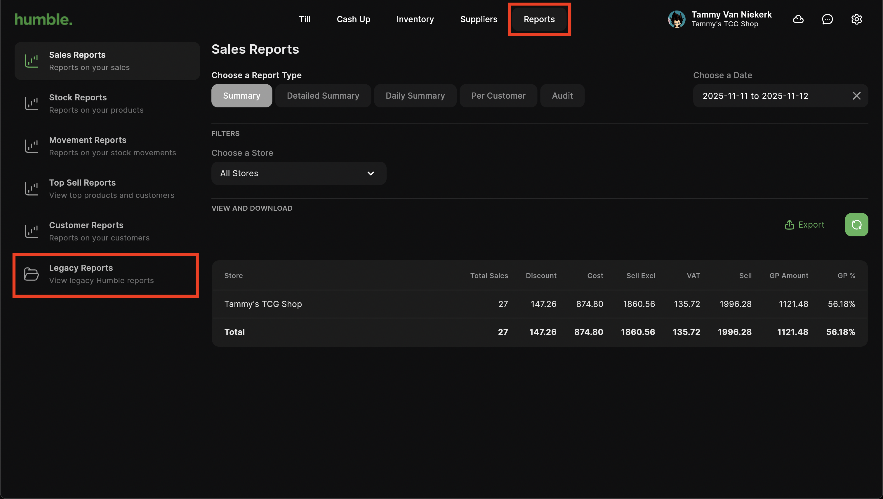 To view your legacy reports from Humble Till, click on Reports and then on Legacy Reports.
