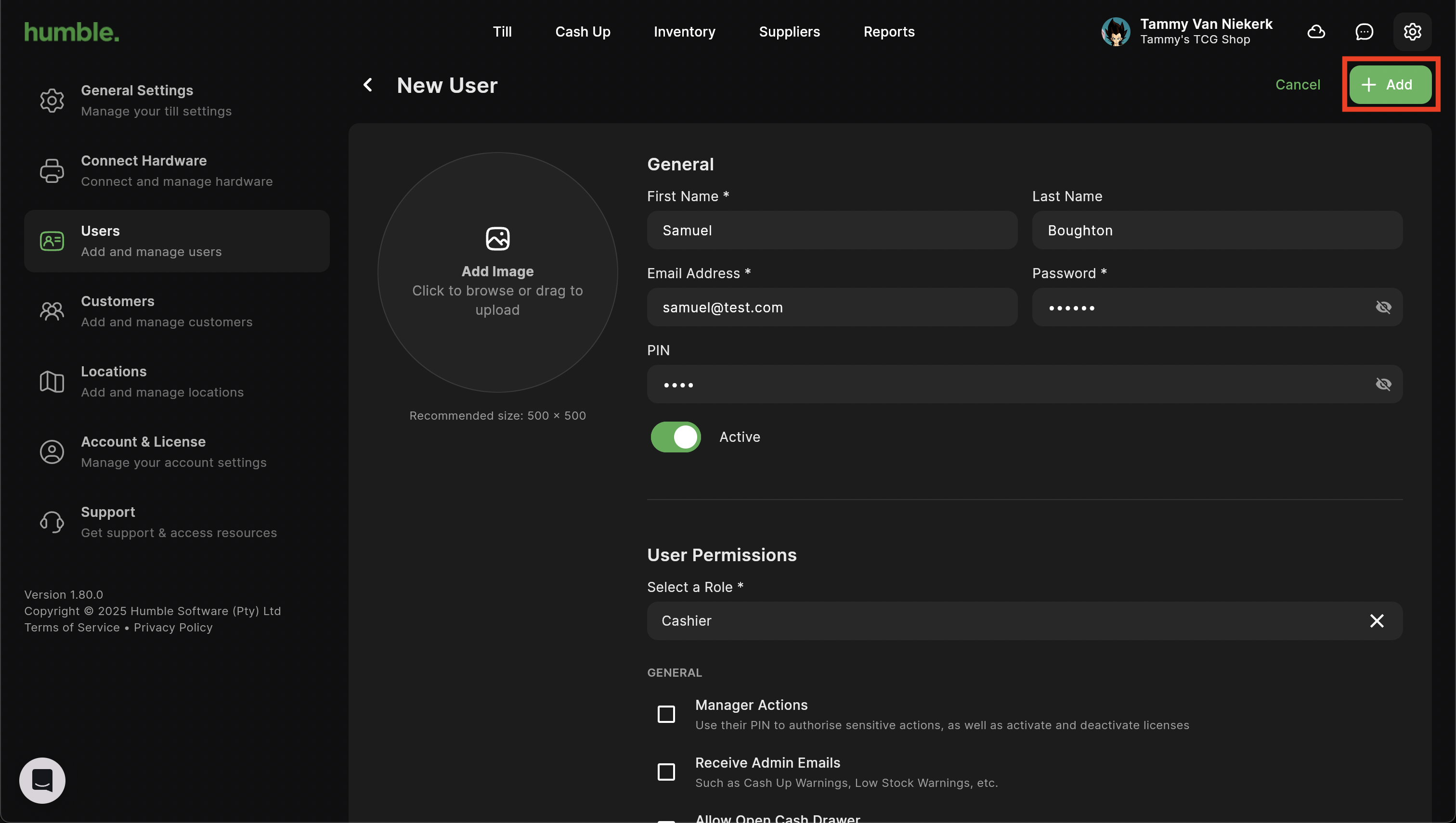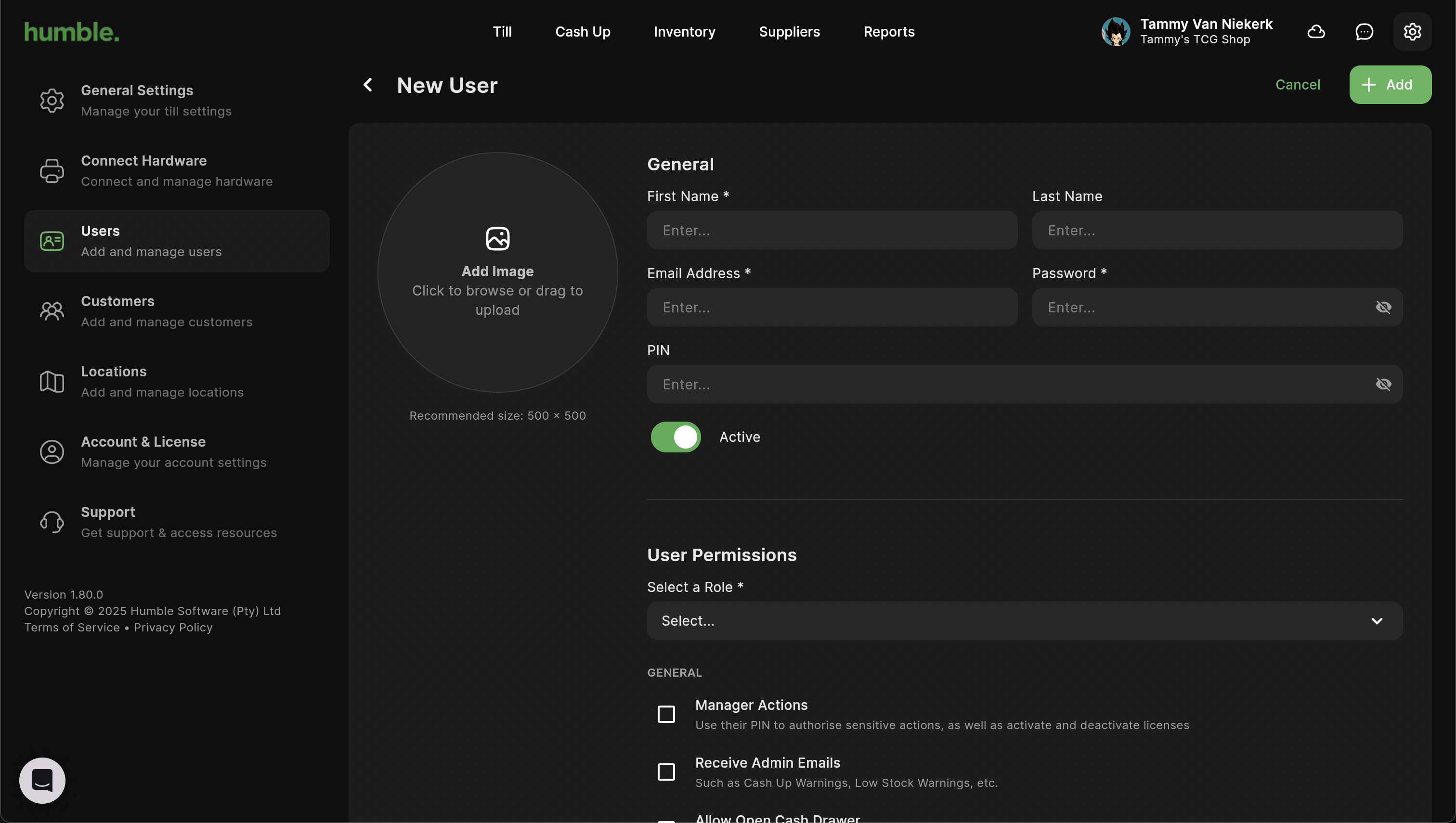 Select a Role - The role of the user (this will predefine what permissions the user will have)