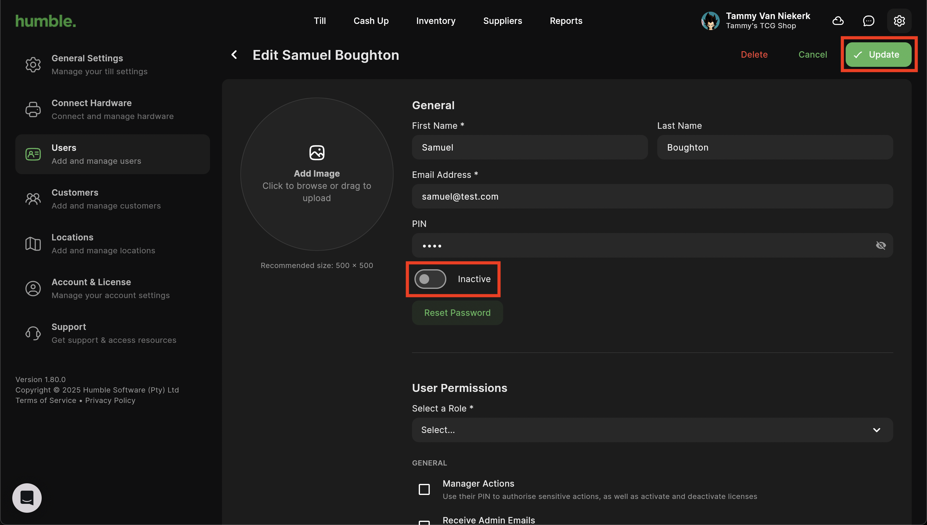 Select the user you wish to make inactive. In the Edit User screen click on Active to toggle it to Inactive and click Update.