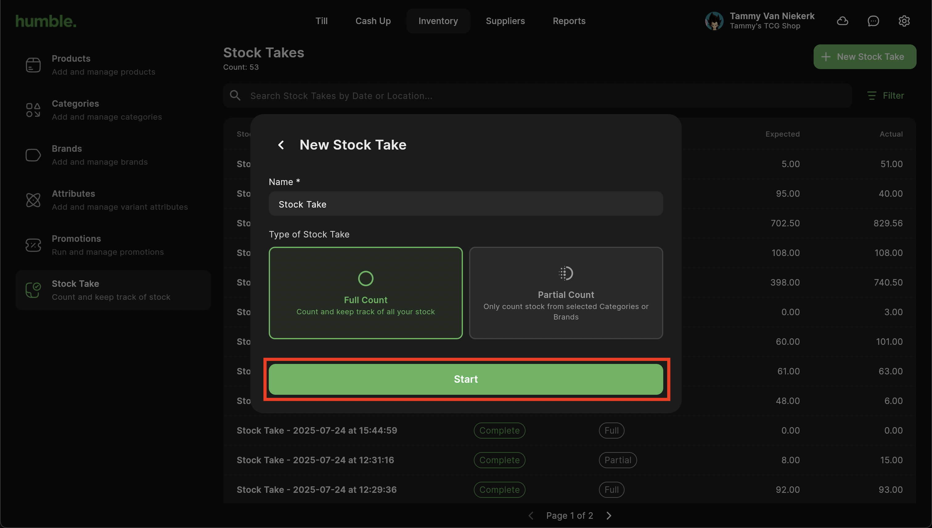 Add in a Name for the Stock Take and select if you want to do a Full or Partial Stock Take, then click on Start.