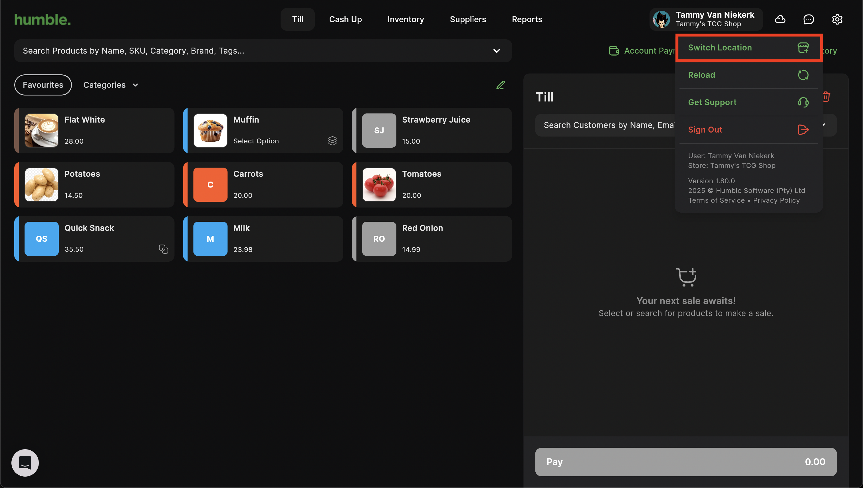 If you have more than one location, you will be able to switch between them to view sales history, reports, on hand amounts for products and stock movements.