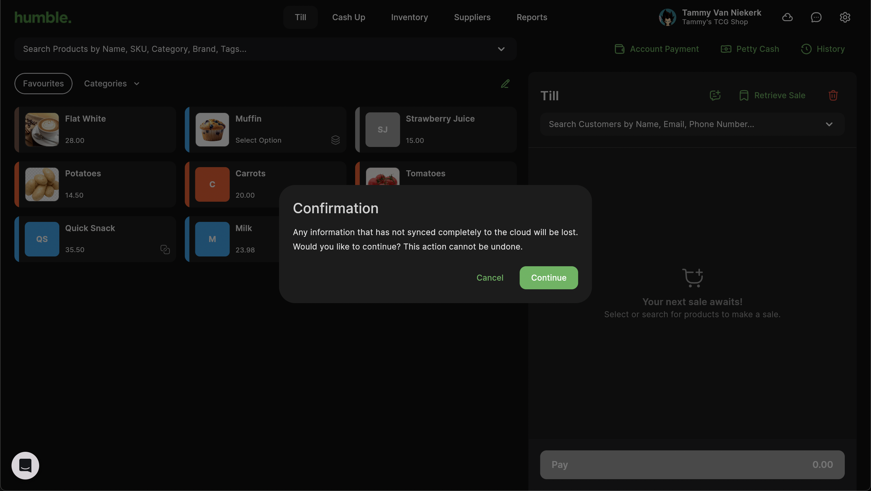 You will receive a Confirmation pop up. Please may sure all you sales have synced to the cloud before switching locations. (You can do this by clicking on the cloud icon next to your name. If all data types have a ✅ then you can switch stores with confidence.)
