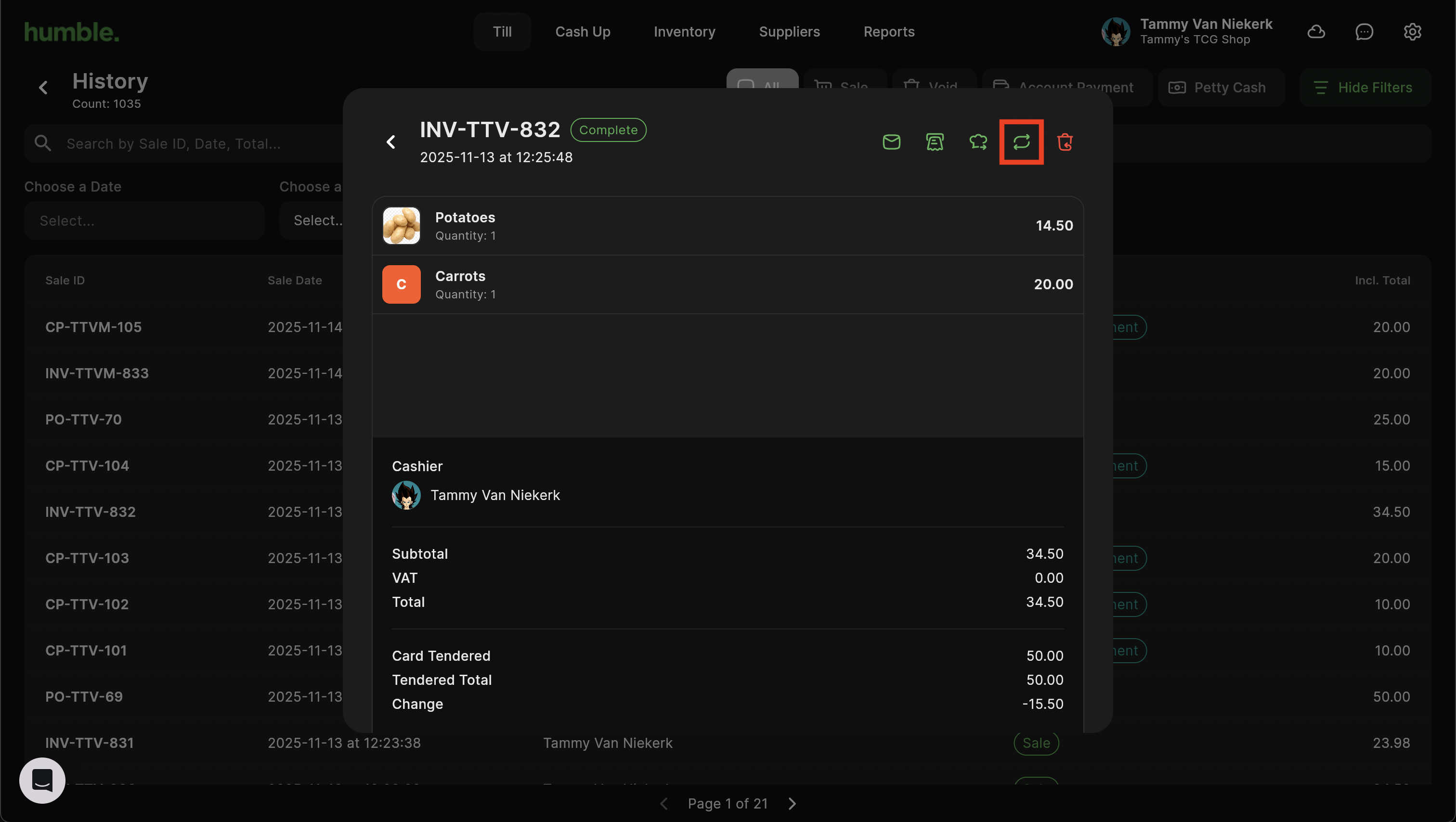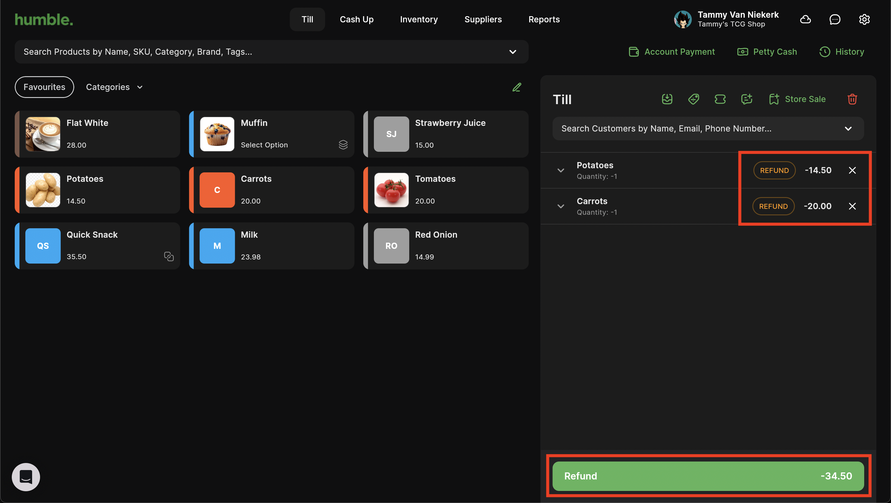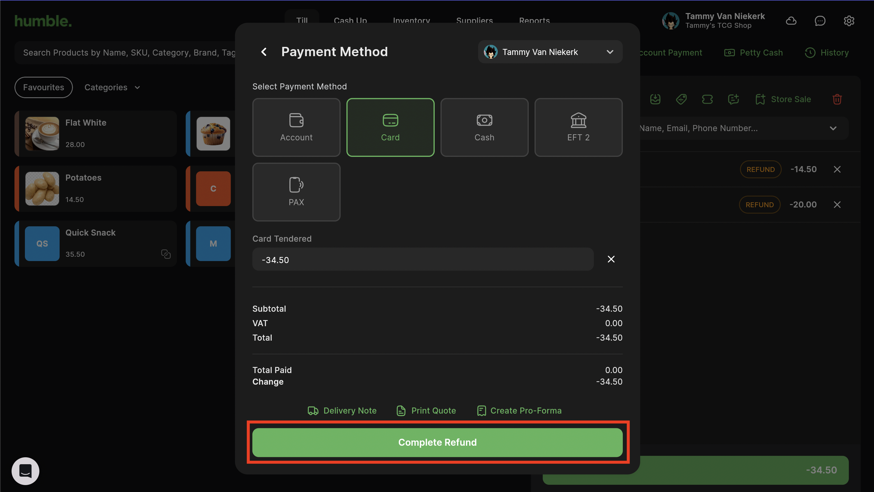 The products will be added to the basket in a refund state. Their price will show as a negative. Click on Refund.