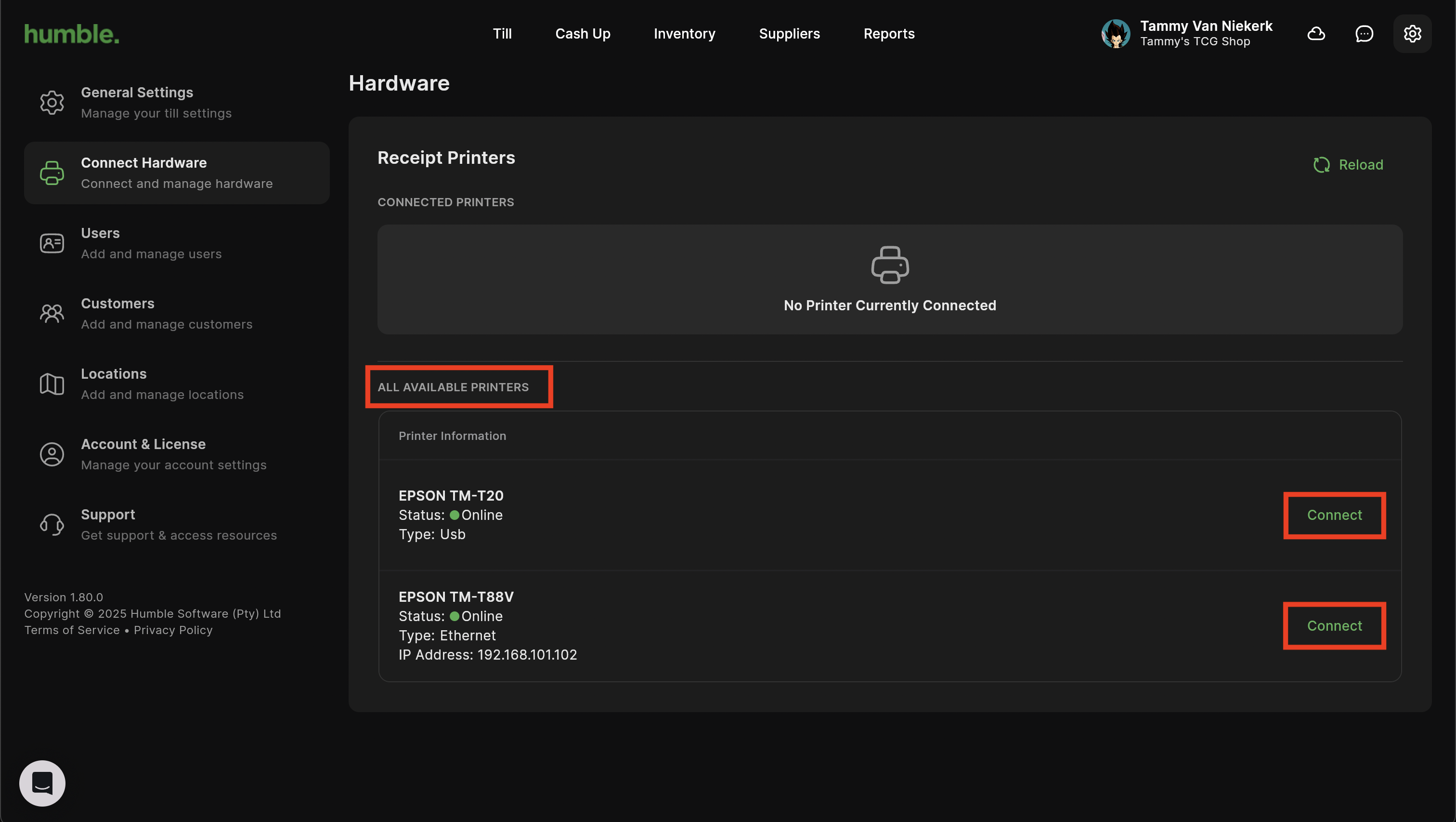 To set up kitchen printing, go to Settings (the cog on the top right next to your name). You will be taken to the General Page. Click on Connect Hardware.