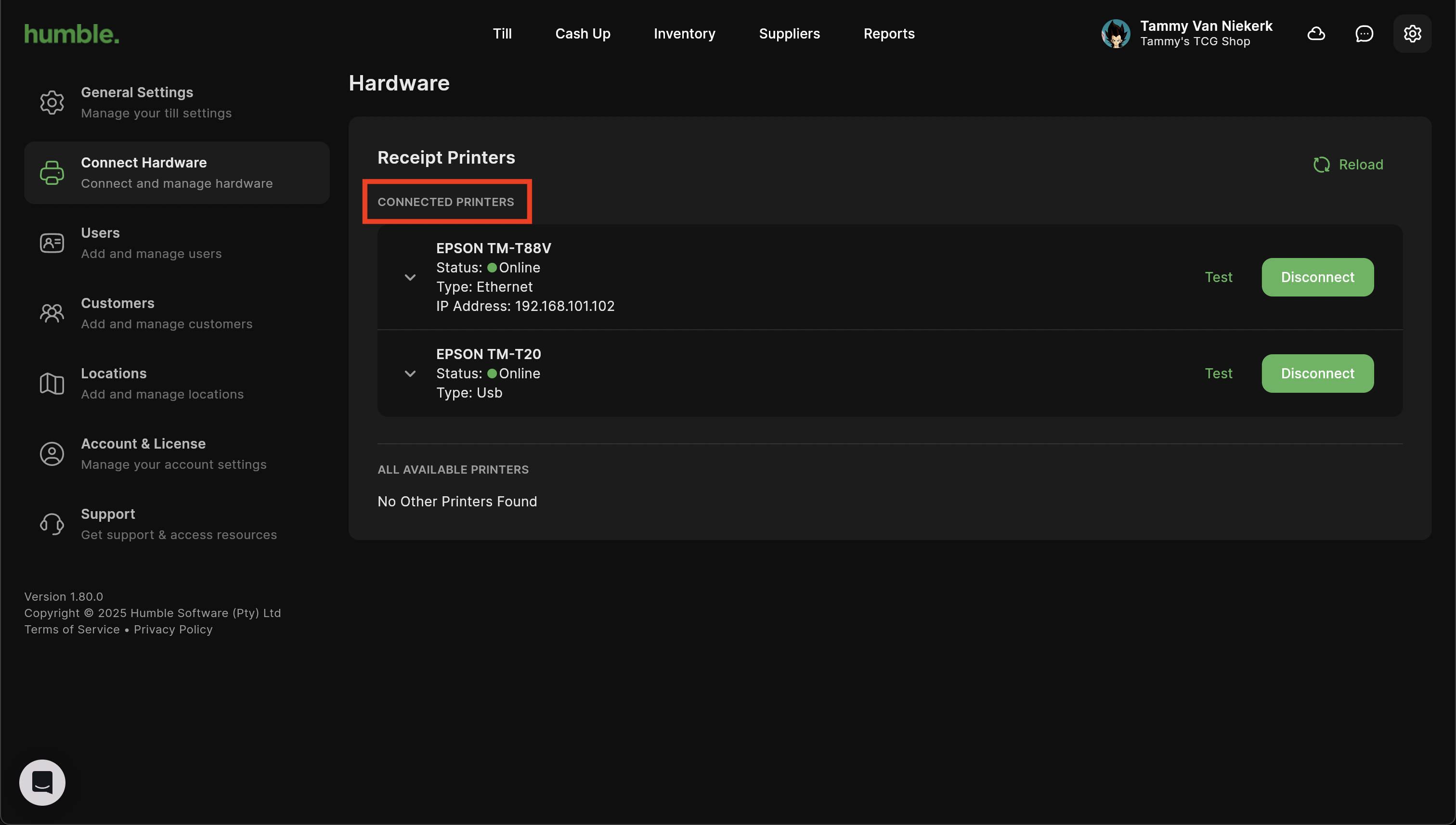 When you first land on the Hardware section, the pos will automatically search for any receipt printers they may be connected via usb or connected to the same network as your computer/device.
