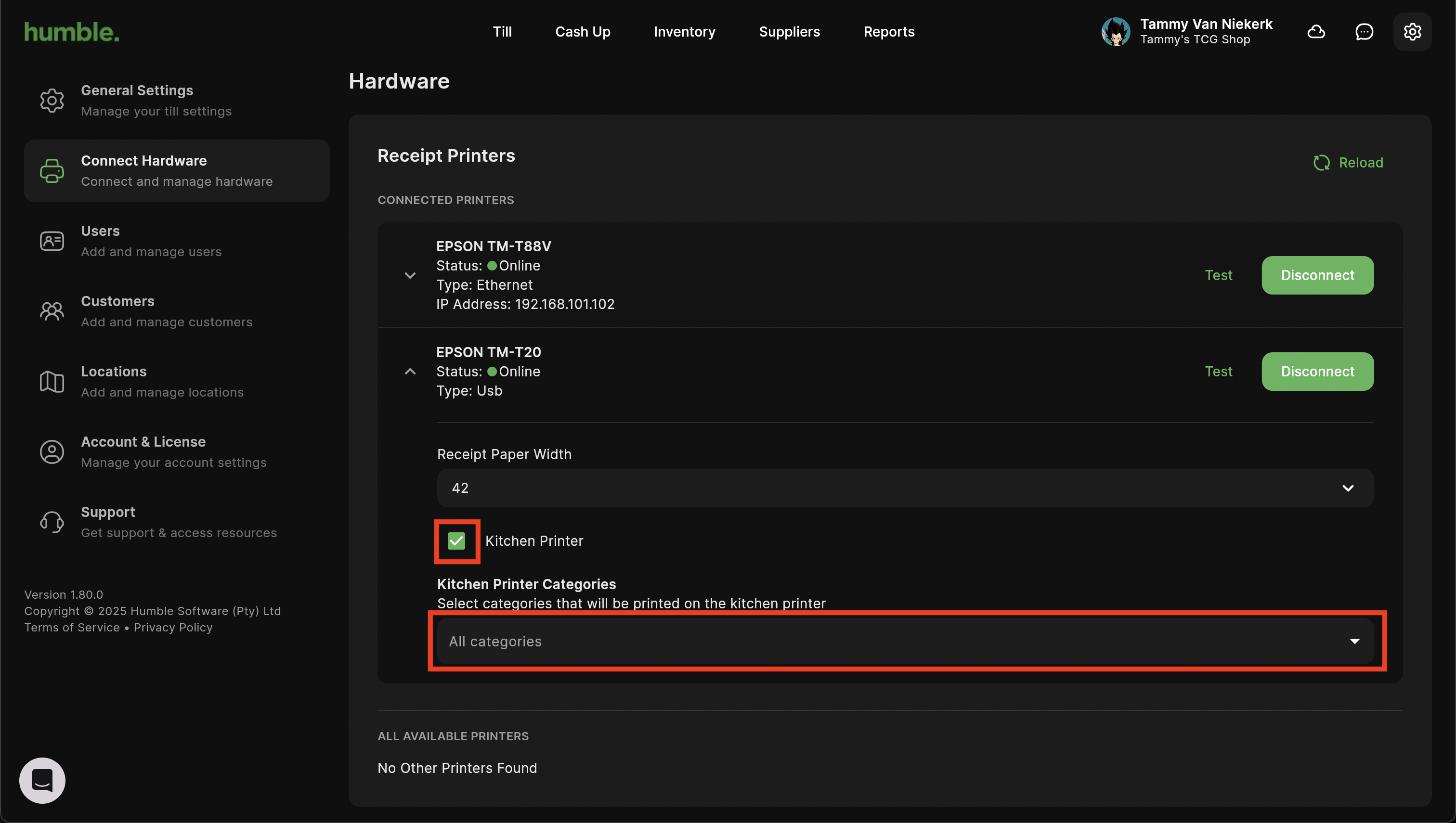 Click on the down arrow to the left of your printer's name to expand on the printer's information. Here you will be able to adjust the width of the paper that your receipt printer is using, and you will be able to set it as a kitchen printer.