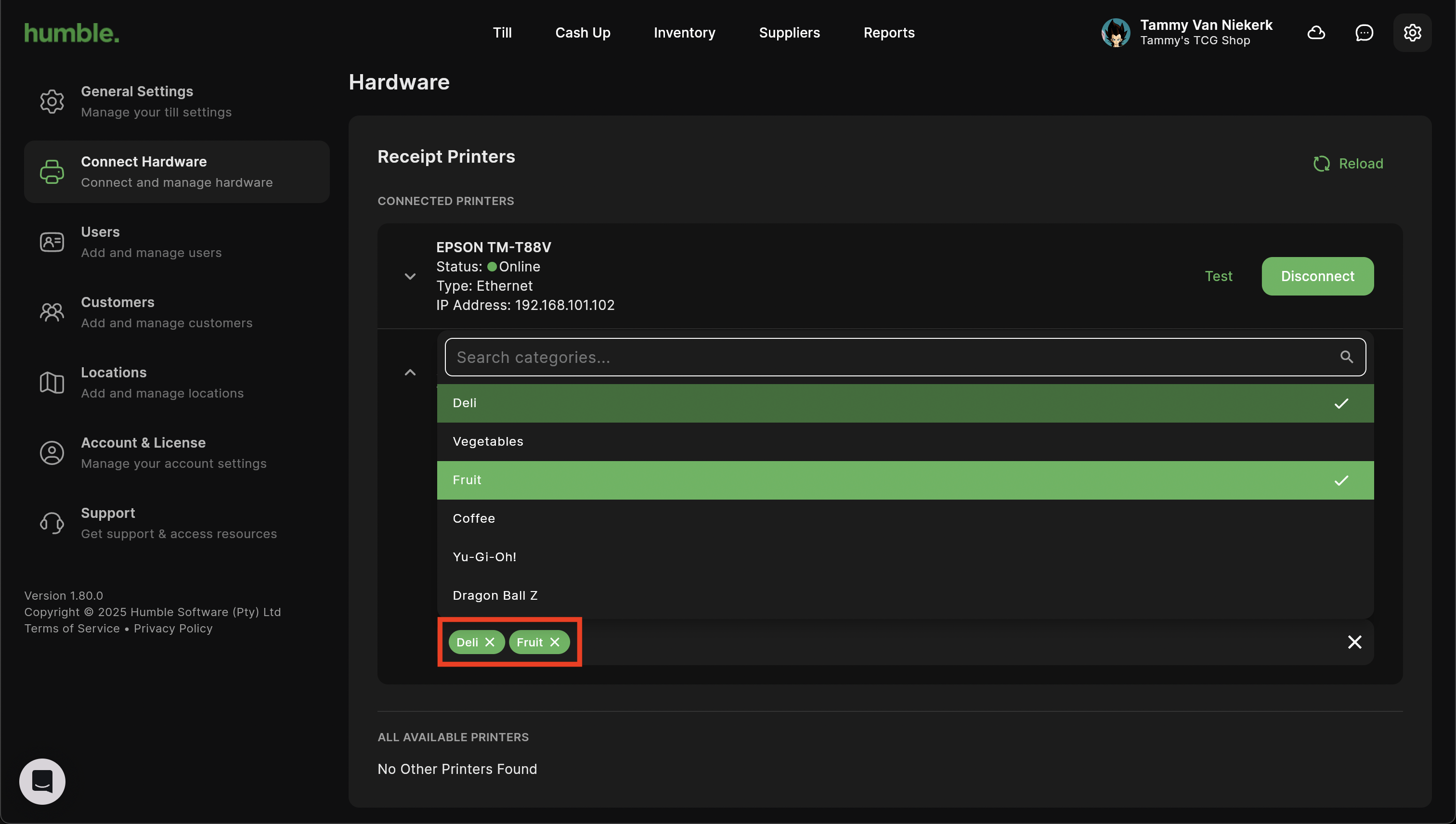 Once you have selected which printer you wish to be your kitchen printer, you will be able to select if you want it to print a kitchen slip for all categories (by default), or specific categories. Click on "All categories" to open the category list and select one or multiple categories.
