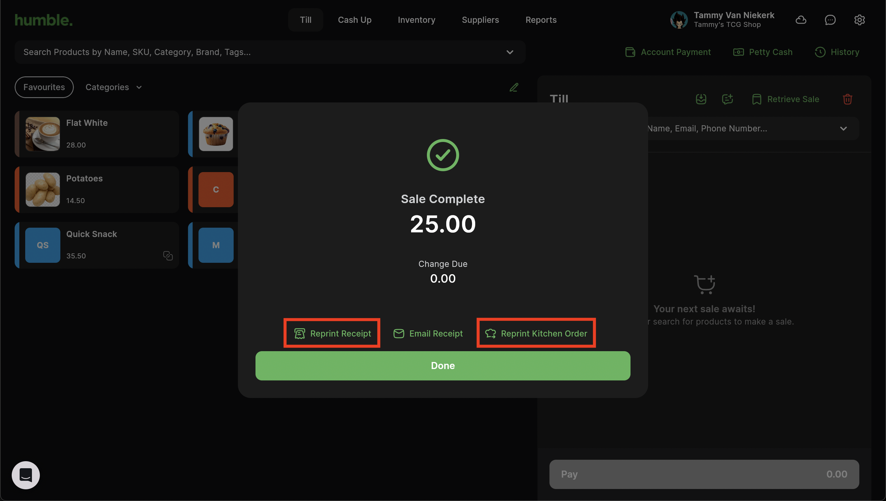 Once you have completed a sale, on the Sale Complete modal you will have the options to "Reprint Receipt" and "Reprint Kitchen Order".