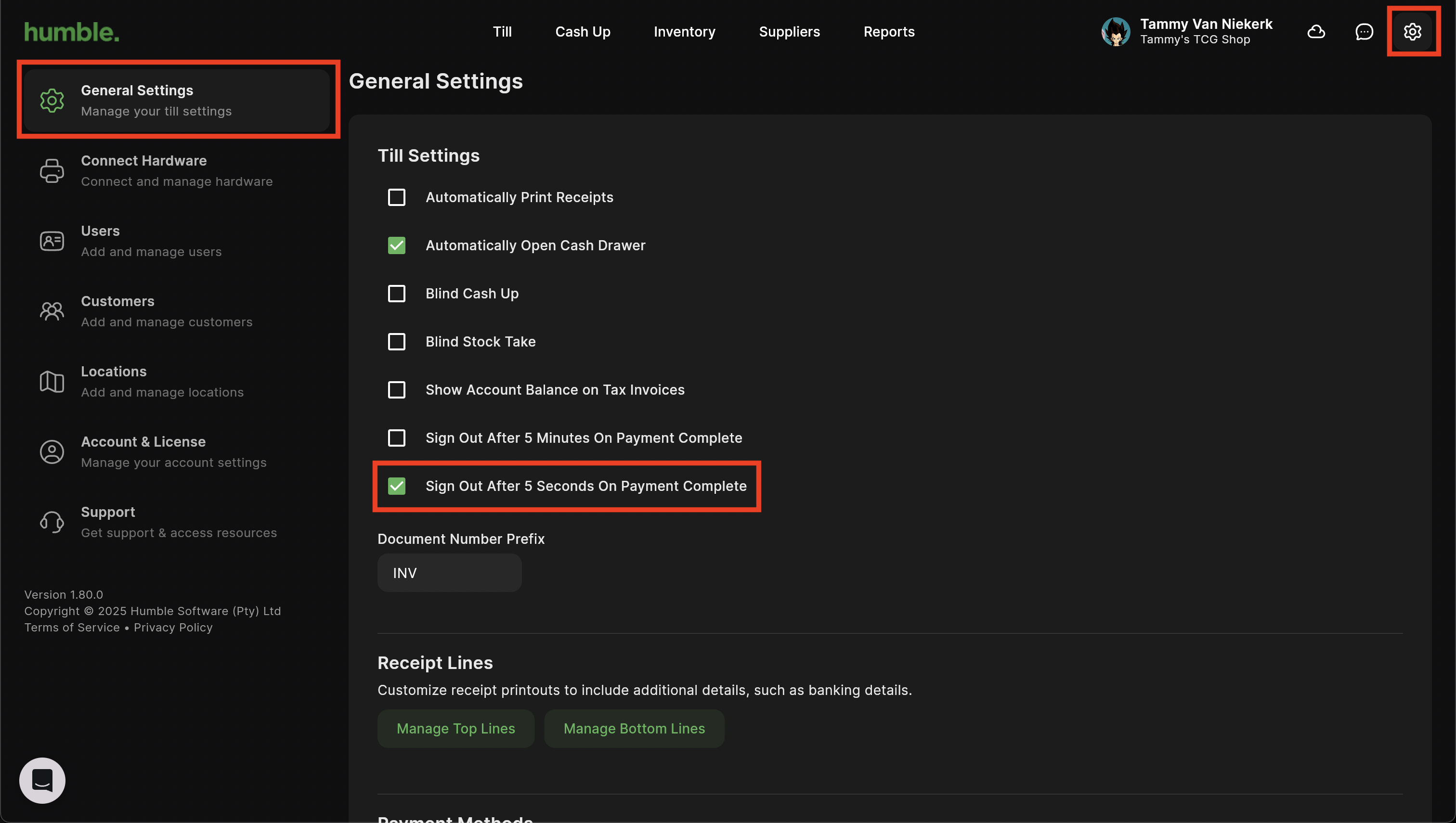 After completing a sale, a timer will be visible on the top right hand side. It will count down from 5 seconds. Once the 5 Seconds is up, the user will be automatically logged out.